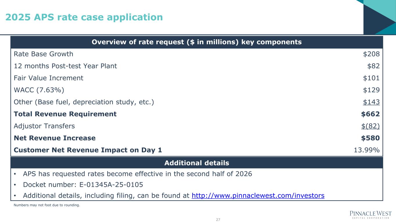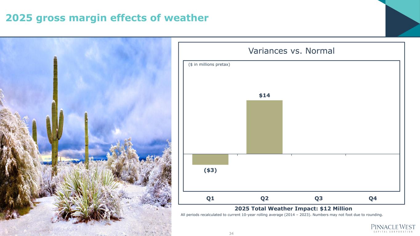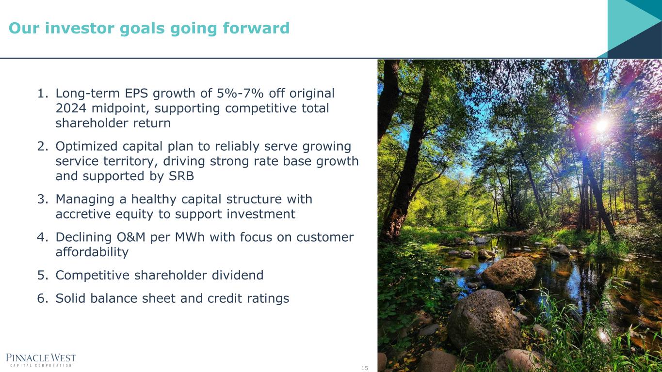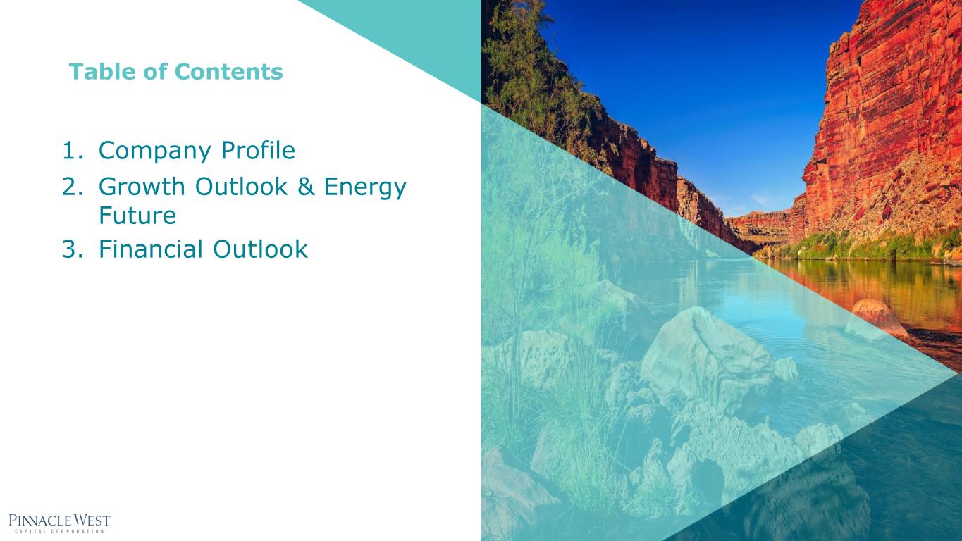 2 This presentation contains forward-looking statements based on current expectations, including statements regarding our earnings guidance and financial outlook and goals. These forward-looking statements are often identified by words such as “estimate,” “predict,” “may,” “believe,” “plan,” “expect,” “require,” “intend,” “assume,” “project,” "anticipate," "goal," "seek," "strategy," "likely," "should," "will," "could," and similar words. Because actual results may differ materially from expectations, we caution you not to place undue reliance on these statements. A number of factors could cause future results to differ materially from historical results, or from outcomes currently expected or sought by Pinnacle West or APS. These factors include, but are not limited to: uncertainties associated with the current and future economic environment, including economic growth rates, labor market conditions, tariffs, inflation, supply chain delays, increased expenses, volatile capital markets, or other unpredictable effects; current and future economic conditions in Arizona, such as the housing market and overall business and regulatory environment; our ability to manage capital expenditures and operations and maintenance costs while maintaining reliability and customer service levels; the direct or indirect effect on our facilities or business from cybersecurity threats or occurrences; variations in demand for electricity, including those due to weather, seasonality (including large increases in ambient temperatures), the general economy or social conditions, customer, and sales growth (or decline), the effects of energy conservation measures and distributed generation, and technological advancements; the potential effects of climate change on our electric system, including as a result of weather extremes such as prolonged drought and high temperature variations in the area where APS conducts its business; power plant and transmission system performance and outages; competition in retail and wholesale power markets; regulatory and judicial decisions, developments, and proceedings; new legislation, ballot initiatives and regulation or interpretations of existing legislation or regulations, including those relating to tax, environmental requirements, regulatory and energy policy, nuclear plant operations and potential deregulation of retail electric markets; fuel and water supply availability; our ability to achieve timely and adequate rate recovery of our costs through our rates and adjustor recovery mechanisms, including returns on and of debt and equity capital investment; the ability of APS to meet renewable energy and energy efficiency mandates and recover related costs; the ability of APS to achieve its clean energy goal to be carbon-neutral by 2050 and, if this goal is achieved, the impact of such achievement on APS, its customers, and its business, financial condition, and results of operations; risks inherent in the operation of nuclear facilities, including spent fuel disposal uncertainty; data security breaches, terrorist attack, physical attack, severe storms, or other catastrophic events, such as fires, explosions, pandemic health events or similar occurrences; the development of new technologies which may affect electric sales or delivery, including as a result of delays in the development and application of new technologies; the cost of debt, including increased cost as a result of rising interest rates, and equity capital and our ability to access capital markets when required; environmental, economic, and other concerns surrounding coal-fired generation, including regulation of greenhouse gas emissions; volatile fuel and purchased power costs; the investment performance of the assets of our nuclear decommissioning trust, captive insurance cell, coal mine reclamation escrow, pension, and other postretirement benefit plans and the resulting impact on future funding requirements; the liquidity of wholesale power markets and the use of derivative contracts in our business; potential shortfalls in insurance coverage; new accounting requirements or new interpretations of existing requirements; generation, transmission and distribution facilities and system conditions and operating costs; our ability to meet the anticipated future need for additional generation and associated transmission facilities in our region; the willingness or ability of counterparties, power plant participants and power plant landowners to meet contractual or other obligations or extend the rights for continued power plant operations; and restrictions on dividends or other provisions in our credit agreements and ACC orders. These and other factors are discussed in the most recent Pinnacle West/APS Form 10-K along with other public filings with the Securities and Exchange Commission, which you should review carefully before placing any reliance on our financial statements, disclosures or earnings outlook. Neither Pinnacle West nor APS assumes any obligation to update these statements, even if our internal estimates change, except as required by law. In this presentation, references to net income and earnings per share (EPS) refer to amounts attributable to common shareholders. Forward Looking Statements