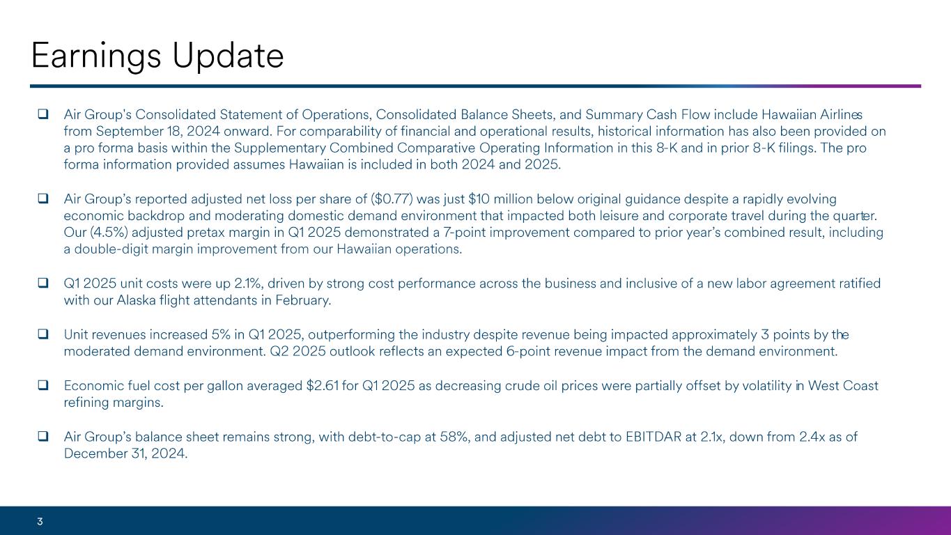 Air Group's Consolidated Statement of Operations, Consolidated Balance Sheets, and Summary Cash Flow include Hawaiian Airlines from September 18, 2024 onward. For comparability of financial and operational results, historical information has also been provided on a pro forma basis within the Supplementary Combined Comparative Operating Information in this filing and in prior 8-K filings. The pro forma information provided assumes Hawaiian is included in both 2024 and 2025.