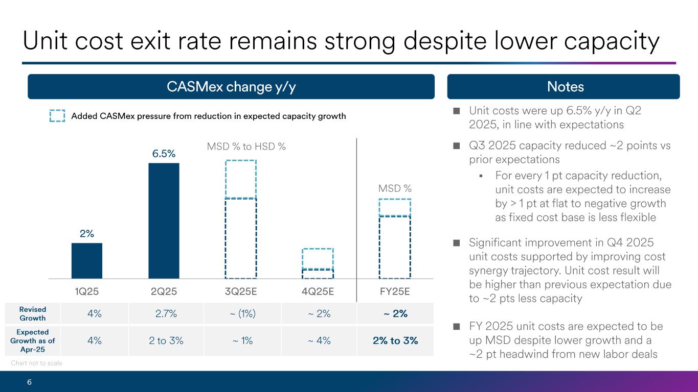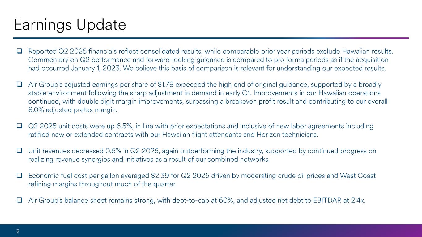 最近、アラスカ航空とハワイアン航空のブッキングにおいて、トラフィック、イールド、収益がプラスに転じています。また、2025年のキャパシティ予想を前年比約2%増に調整しました。これらの変更は、第3四半期および第4四半期におけるオフピーク便の運航便数を事前の予想より2ポイント削減したことを反映したものであり、利益率の増加を見込んでいます。最近の需要環境の変化と、シナジーと商業イニシアチブのコミットメントを継続的に達成することにより、通期の1株当たり利益は3.25ドル以上となる見通しです。