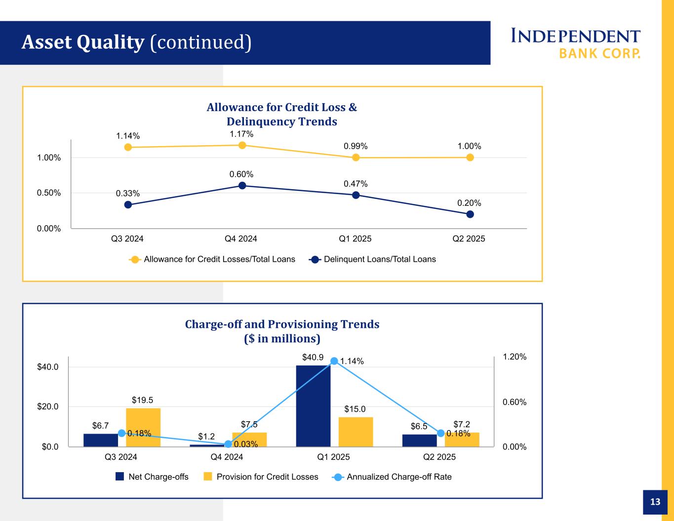 12 Nonperforming Loans ($ in millions) $104.2 $101.5 $89.5 $56.2 0.73% 0.70% 0.62% 0.39% NPLs ($Mil) NPL as % of Total Loans Q3 2024 Q4 2024 Q1 2025 Q2 2025 0.25% 0.50% 0.75% $0 $60 $120 Nonperforming Assets Rollforward - Q2 2025 (Dollars in thousands) Nonperforming assets at March 31, 2025 $89,493 New to nonperforming 13,411 Loans charged-off (6,966) Loans paid-off (35,977) Loans transferred to other real estate owned (2,100) Loans restored to performing status (1,659) New to other real estate owned 2,100 Other 15 Nonperforming assets at June 30, 2025 $58,317 Commercial Criticized & Classified Loans ($ in millions) $567.4 $502.9 $486.3 $417.7 $460.2 5.25% 4.68% 4.47% 3.85% 4.25% Criticized & Classified Loans Criticized & Classified Loans as a % of Total Commercial Loans Q2 2024 Q3 2024 Q4 2024 Q1 2025 Q2 2025 $— $150.0 $300.0 $450.0 $600.0 —% 1.50% 3.00% 4.50% 6.00% Asset Quality • $27.8 million office loan was resolved • $7.1 million office loan was resolved