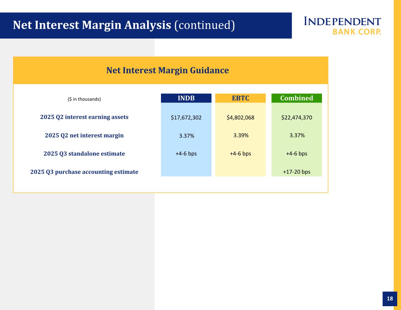 18 Net Interest Margin Analysis (continued) Net Interest Margin Guidance ($ in thousands) INDB EBTC Combined 2025 Q2 interest earning assets $17,672,302 $4,802,068 $22,474,370 2025 Q2 net interest margin 3.37% 3.39% 3.37% 2025 Q3 standalone estimate +4-6 bps +4-6 bps +4-6 bps 2025 Q3 purchase accounting estimate +17-20 bps