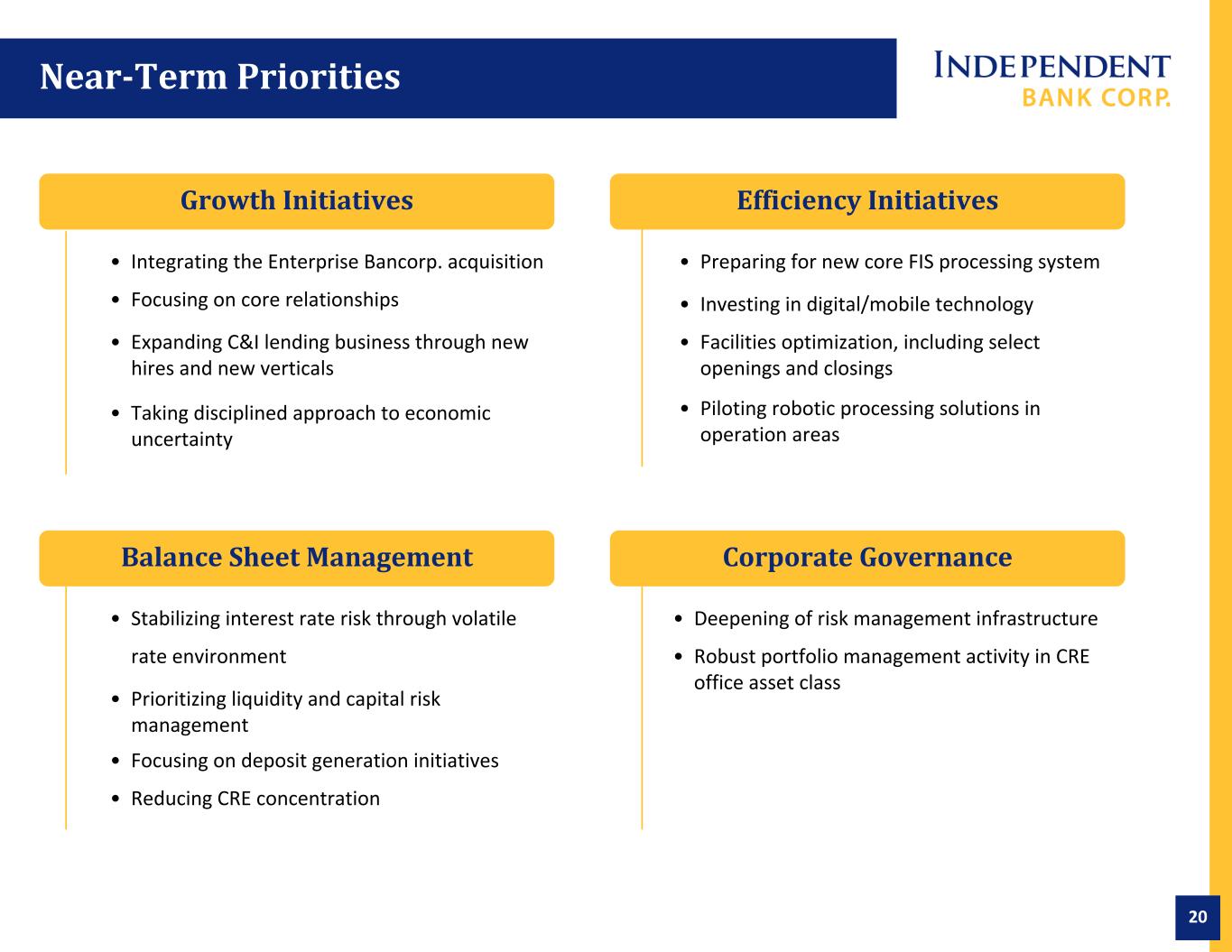 20 • Deepening of risk management infrastructure • Robust portfolio management activity in CRE office asset class • Stabilizing interest rate risk through volatile rate environment • Prioritizing liquidity and capital risk management • Focusing on deposit generation initiatives • Reducing CRE concentration • Integrating the Enterprise Bancorp. acquisition • Focusing on core relationships • Expanding C&I lending business through new hires and new verticals • Taking disciplined approach to economic uncertainty • Preparing for new core FIS processing system • Investing in digital/mobile technology • Facilities optimization, including select openings and closings • Piloting robotic processing solutions in operation areas Near-Term Priorities Growth Initiatives Efficiency Initiatives Balance Sheet Management Corporate Governance