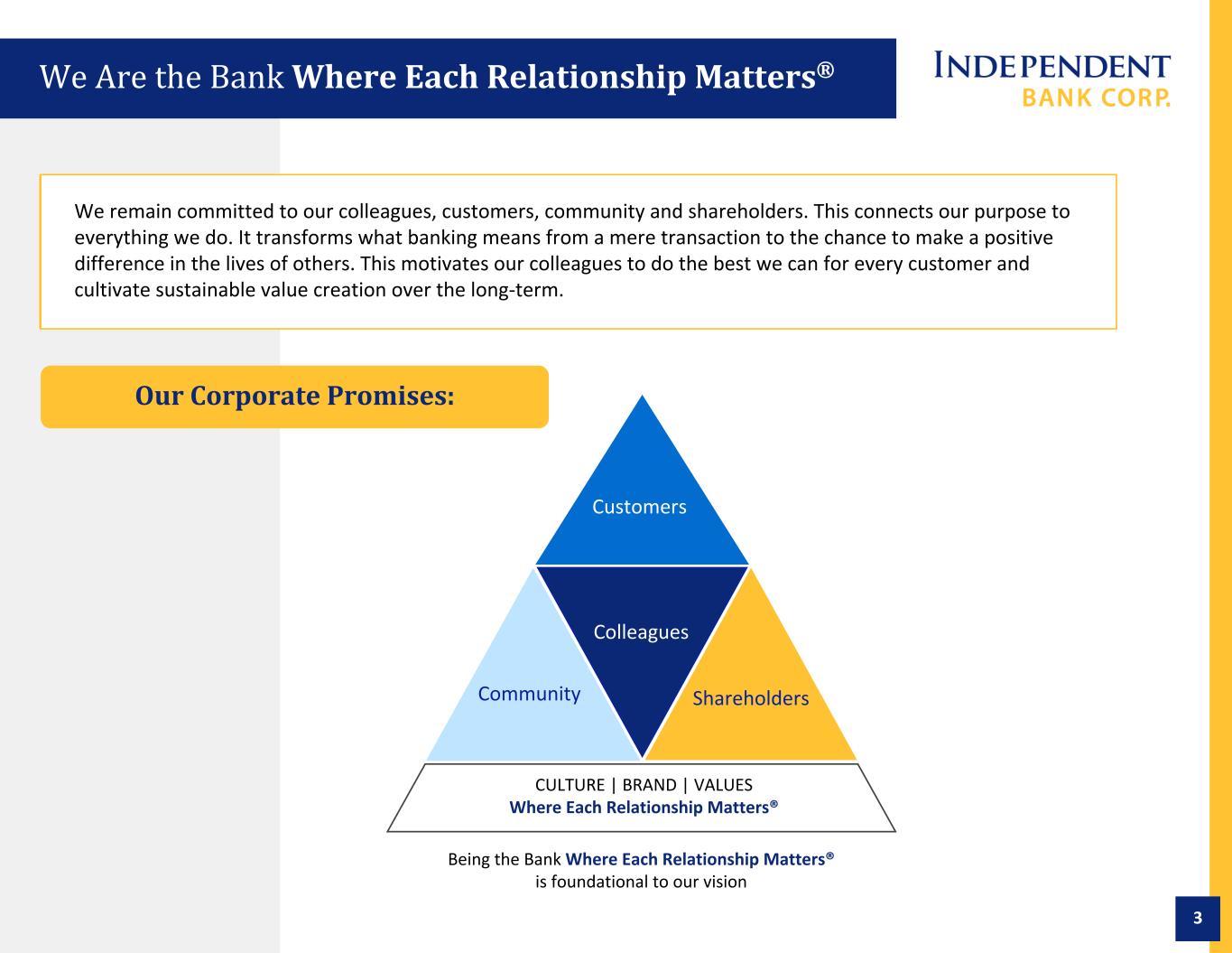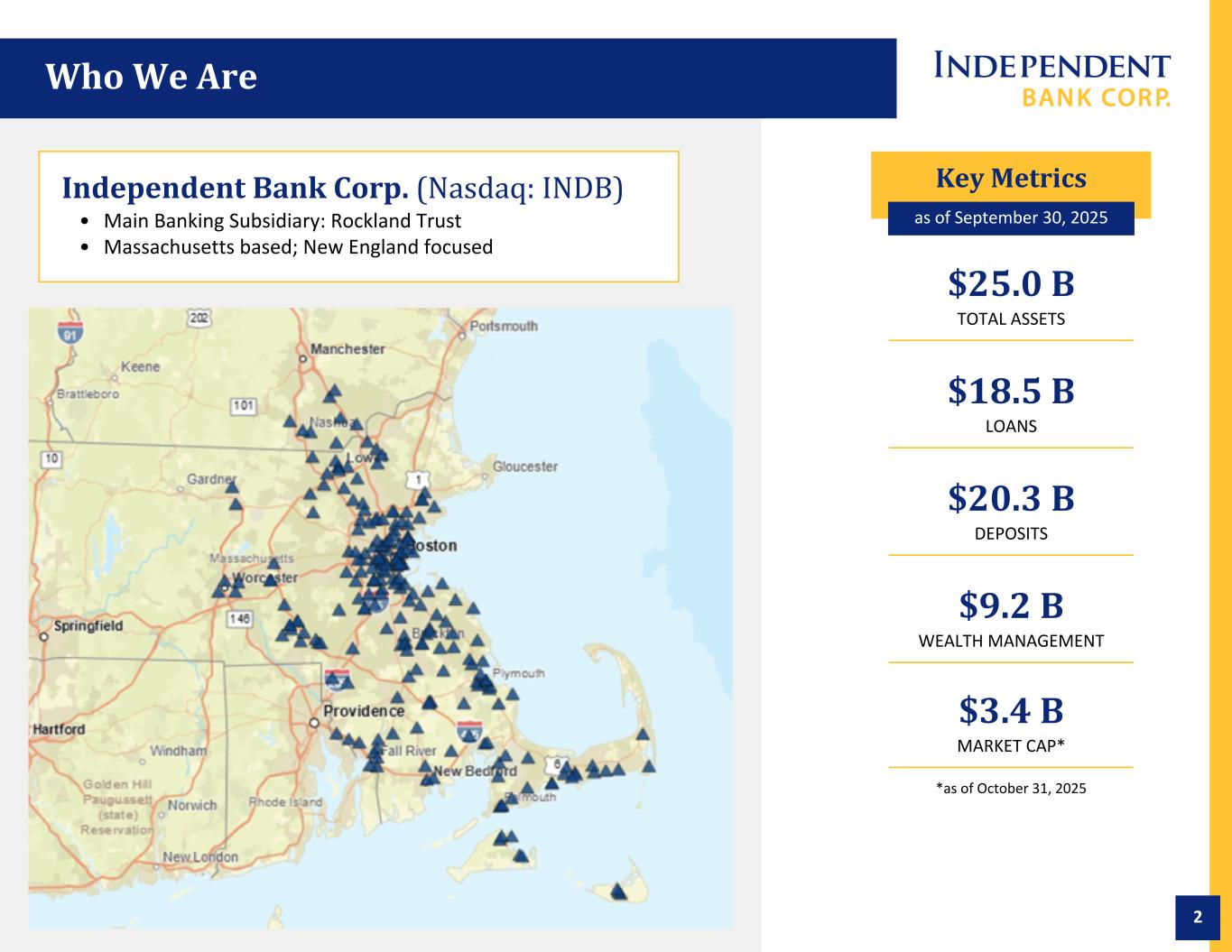 2 Who We Are Independent Bank Corp. (Nasdaq: INDB) • Main Banking Subsidiary: Rockland Trust • Massachusetts based; New England focused Key Metrics as of September 30, 2025 $25.0 B TOTAL ASSETS $18.5 B LOANS $20.3 B DEPOSITS $9.2 B WEALTH MANAGEMENT $3.4 B MARKET CAP* *as of October 31, 2025