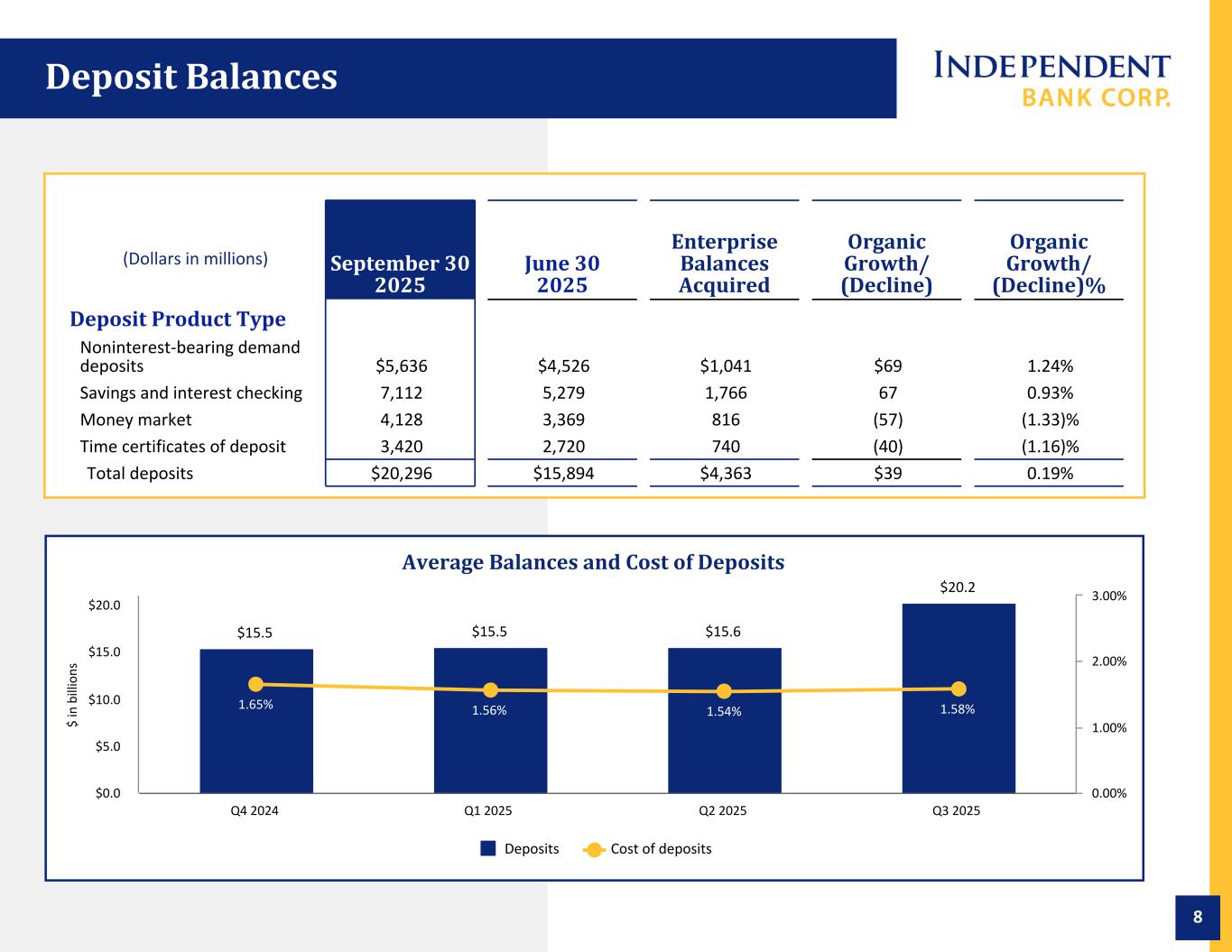 7 Expanding Company Footprint Source: S&P Capital IQ Pro Note: Deposit/Market Share data above is as of June 30th of each respective year. 2025 data is inclusive of Enterprise acquisition. (1) Includes one electronic branch 2025 2024 Counties Branches Deposits ($bn) Market Share (%) Rank Branches Deposits ($bn) Market Share (%) Rank Plymouth, MA 28(1) 5.2 26.9 1 28(1) 4.7 25.2 1 Middlesex, MA 28 3.7 4.4 8 15 1.3 1.6 17 Norfolk, MA 19 2.5 6.8 5 19 2.4 6.7 5 Suffolk, MA 21 2.2 1.6 7 21 2.2 1.6 6 Essex, MA 10 1.4 4.4 8 6 0.8 2.6 10 Bristol, MA 8 1.6 9.5 5 8 1.4 9.0 5 Barnstable, MA 12 1.4 12.2 3 12 1.4 12.2 3 Worcester, MA 10 0.9 4.0 10 8 0.6 2.6 11 Rockingham, NH 4 0.6 4.8 6 — — — — Nantucket, MA 3 0.4 31.1 2 3 0.4 35.1 1 Hillsborough, NH 4 0.4 2.8 7 — — — — Dukes, MA 4 0.2 17.2 2 4 0.2 15.8 2 Total 151 $20.5 124 $15.4 Strategic Market Share Positioning Creating Top 10 Deposit Market Share in all Counties of Operation