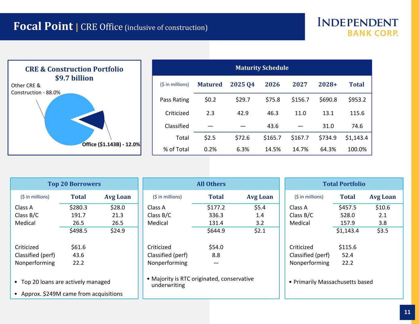 10 95% CRE & Construction Portfolio $9.7 billion Multi-Family - 27.9% Residential - Related - 18.3% Office - 12.1% Mixed-Use Office - 1.9% Industrial/ Warehouse - 9.6% Lodging - 8.3% Retail - 16.6% Healthcare - 1.4% Other - 3.9% C&I Portfolio $4.5 billion Retail Trade - 17.2% Real Estate/Rental and Leasing - 10.9% Construction - 9.9% Health Care and Social Assistance - 9.2%Wholesale Trade - 8.2% Manufacturing - 8.8% Accommodation and Food Services - 7.9% Educational Services - 4.2% All Other - 23.7% Consumer Portfolio $4.2 billion Residential real estate - 68.8% Home equity - first position - 12.1% Home equity - subordinate positions - 18.2% Other consumer - 0.9% $7.5 $7.4 $7.3 $9.7 305% 281% 274% 295% CRE CRE/Capital * Q4 2024 Q1 2025** Q2 2025 Q3 2025** $0.0 $4.0 $8.0 $12.0 250% 300% 350% ($Bil) *Rockland Trust Bank only **Reflects capital contribution of $150 million in Q1 and an additional $75 million in Q3 related to parent company subordinated debt proceeds Loan Portfolios
