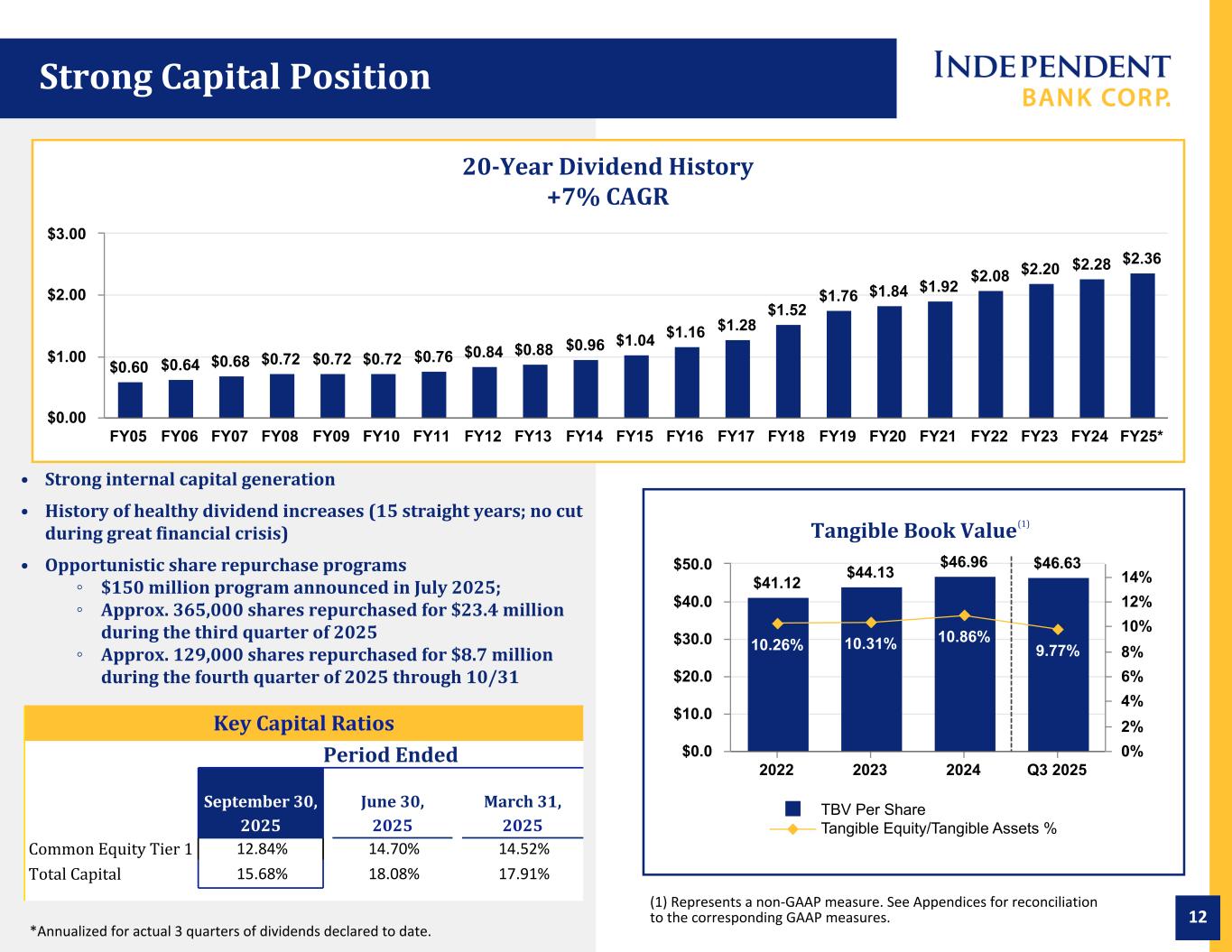 12 Tangible Book Value $41.12 $44.13 $46.96 $46.63 10.26% 10.31% 10.86% 9.77% TBV Per Share Tangible Equity/Tangible Assets % 2022 2023 2024 Q3 2025 $0.0 $10.0 $20.0 $30.0 $40.0 $50.0 0% 2% 4% 6% 8% 10% 12% 14% • Strong internal capital generation • History of healthy dividend increases (15 straight years; no cut during great financial crisis) • Opportunistic share repurchase programs ◦ $150 million program announced in July 2025; ◦ Approx. 365,000 shares repurchased for $23.4 million during the third quarter of 2025 ◦ Approx. 129,000 shares repurchased for $8.7 million during the fourth quarter of 2025 through 10/31 Key Capital Ratios Period Ended September 30, June 30, March 31, 2025 2025 2025 Common Equity Tier 1 12.84% 14.70% 14.52% Total Capital 15.68% 18.08% 17.91% Strong Capital Position 20-Year Dividend History +7% CAGR $0.60 $0.64 $0.68 $0.72 $0.72 $0.72 $0.76 $0.84 $0.88 $0.96 $1.04 $1.16 $1.28 $1.52 $1.76 $1.84 $1.92 $2.08 $2.20 $2.28 $2.36 FY05 FY06 FY07 FY08 FY09 FY10 FY11 FY12 FY13 FY14 FY15 FY16 FY17 FY18 FY19 FY20 FY21 FY22 FY23 FY24 FY25* $0.00 $1.00 $2.00 $3.00 (1) (1) Represents a non-GAAP measure. See Appendices for reconciliation to the corresponding GAAP measures. *Annualized for actual 3 quarters of dividends declared to date.