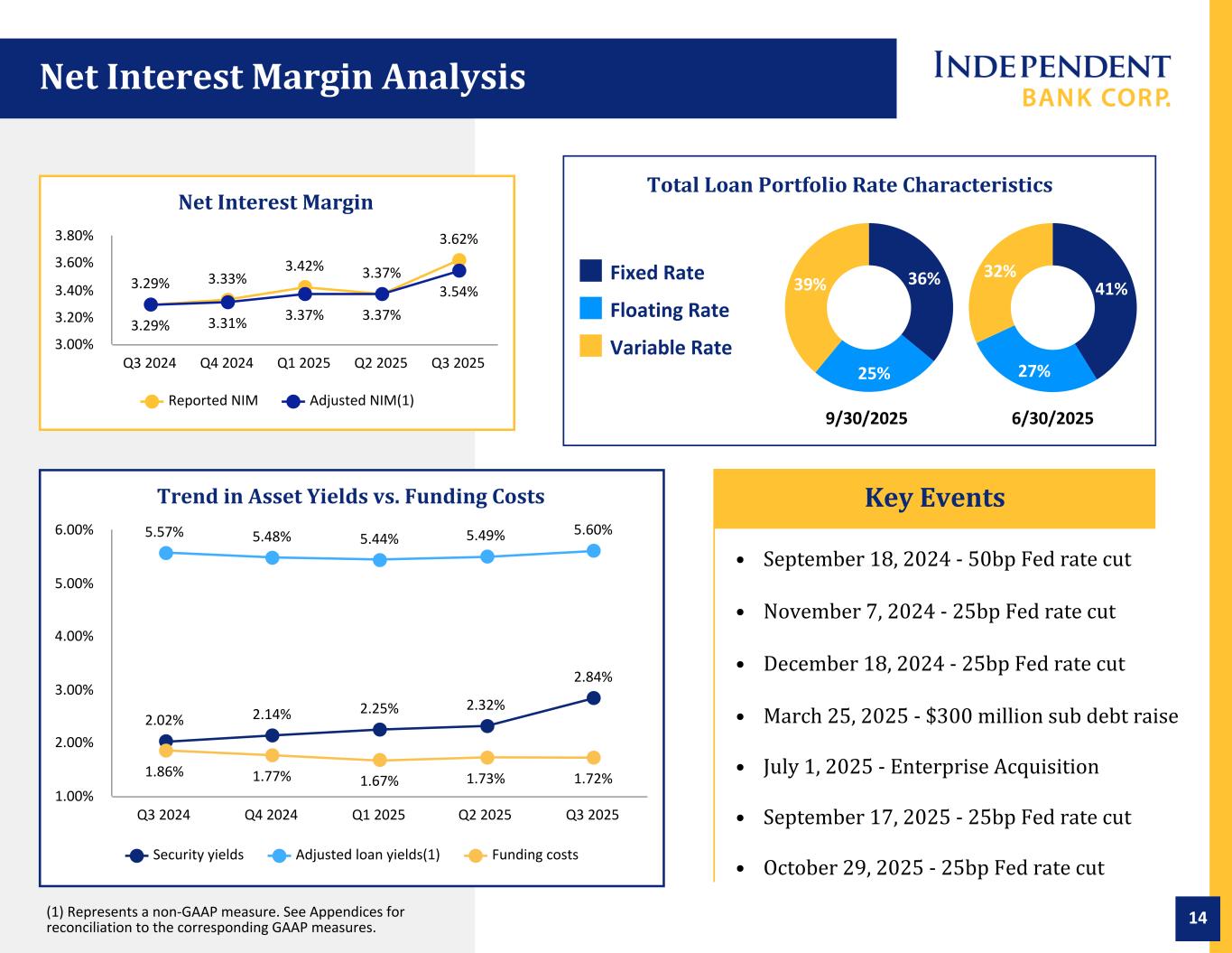 13 Available for Sale (AFS) Held to Maturity (HTM) Portfolio Composition at September 30, 2025 Book Value Fair Value Unrealized Gain/(Loss) Book Value Fair Value Unrealized Gain/(Loss) ($ in millions) U.S. government agency securities $ 229 $ 217 $ (12) $ — $ — $ — U.S. treasury securities 485 467 (18) 101 96 (5) Agency mortgage-backed securities 727 707 (20) 758 719 (39) Agency collateralized mortgage obligations 280 276 (4) 384 336 (48) Taxable municipal securities 217 219 2 — — — Other 60 55 (5) 115 110 (5) Total securities $ 1,998 $ 1,941 $ (57) $ 1,358 $ 1,261 $ (97) Duration of portfolio 3.9 Years 3.7 Years ($ in m ill io ns ) Projected Cash Flows $62 $704 $493 2025 (Q4) 2026 2027 $0 $250 $500 $750 Securities Portfolio