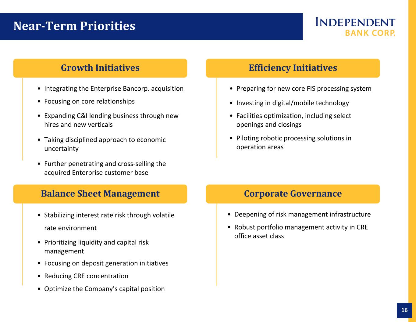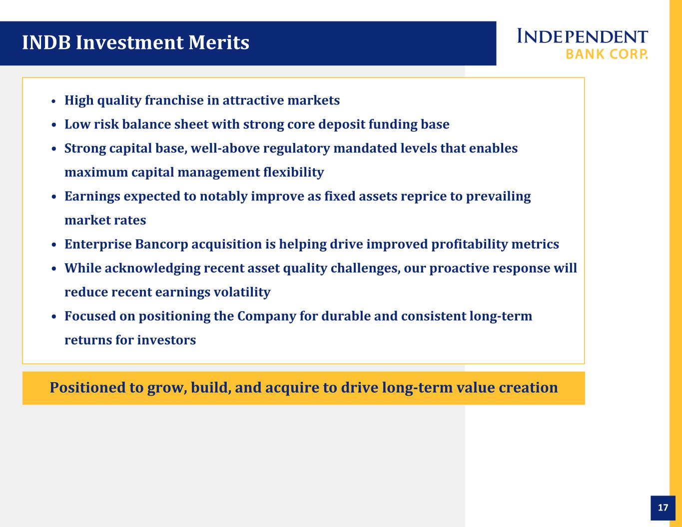 16 • Deepening of risk management infrastructure • Robust portfolio management activity in CRE office asset class • Stabilizing interest rate risk through volatile rate environment • Prioritizing liquidity and capital risk management • Focusing on deposit generation initiatives • Reducing CRE concentration • Optimize the Company’s capital position • Integrating the Enterprise Bancorp. acquisition • Focusing on core relationships • Expanding C&I lending business through new hires and new verticals • Taking disciplined approach to economic uncertainty • Further penetrating and cross-selling the acquired Enterprise customer base • Preparing for new core FIS processing system • Investing in digital/mobile technology • Facilities optimization, including select openings and closings • Piloting robotic processing solutions in operation areas Near-Term Priorities Growth Initiatives Efficiency Initiatives Balance Sheet Management Corporate Governance