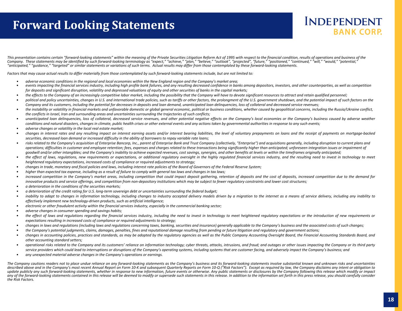 18 This presentation contains certain “forward-looking statements” within the meaning of the Private Securities Litigation Reform Act of 1995 with respect to the financial condition, results of operations and business of the Company. These statements may be identified by such forward-looking terminology as “expect,” “achieve,” “plan,” “believe,” “outlook”, “projected”, “future,” “positioned,” “continued,” “will,” “would,” “potential,” “anticipated,” “guidance,” “targeted” or similar statements or variations of such terms. Actual results may differ from those contemplated by these forward-looking statements. Factors that may cause actual results to differ materially from those contemplated by such forward-looking statements include, but are not limited to: • adverse economic conditions in the regional and local economies within the New England region and the Company’s market area; • events impacting the financial services industry, including high profile bank failures, and any resulting decreased confidence in banks among depositors, investors, and other counterparties, as well as competition for deposits and significant disruption, volatility and depressed valuations of equity and other securities of banks in the capital markets; • the effects to the Company of an increasingly competitive labor market, including the possibility that the Company will have to devote significant resources to attract and retain qualified personnel; • political and policy uncertainties, changes in U.S. and international trade policies, such as tariffs or other factors, the prolongment of the U.S. government shutdown, and the potential impact of such factors on the Company and its customers, including the potential for decreases in deposits and loan demand, unanticipated loan delinquencies, loss of collateral and decreased service revenues; • the instability or volatility in financial markets and unfavorable domestic or global general economic, political or business conditions, whether caused by geopolitical concerns, including the Russia/Ukraine conflict, the conflicts in Israel, Iran and surrounding areas and uncertainties surrounding the trajectories of such conflicts; • unanticipated loan delinquencies, loss of collateral, decreased service revenues, and other potential negative effects on the Company’s local economies or the Company’s business caused by adverse weather conditions and natural disasters, changes in climate, public health crises or other external events and any actions taken by governmental authorities in response to any such events; • adverse changes or volatility in the local real estate market; • changes in interest rates and any resulting impact on interest earning assets and/or interest bearing liabilities, the level of voluntary prepayments on loans and the receipt of payments on mortgage-backed securities, decreased loan demand or increased difficulty in the ability of borrowers to repay variable rate loans; • risks related to the Company’s acquisition of Enterprise Bancorp, Inc., parent of Enterprise Bank and Trust Company (collectively, "Enterprise") and acquisitions generally, including disruption to current plans and operations; difficulties in customer and employee retention; fees, expenses and charges related to these transactions being significantly higher than anticipated; unforeseen integration issues or impairment of goodwill and/or other intangibles; and the Company’s inability to achieve expected revenues, cost savings, synergies, and other benefits at levels or within the timeframes originally anticipated; • the effect of laws, regulations, new requirements or expectations, or additional regulatory oversight in the highly regulated financial services industry, and the resulting need to invest in technology to meet heightened regulatory expectations, increased costs of compliance or required adjustments to strategy; • changes in trade, monetary and fiscal policies and laws, including interest rate policies of the Board of Governors of the Federal Reserve System; • higher than expected tax expense, including as a result of failure to comply with general tax laws and changes in tax laws; • increased competition in the Company’s market areas, including competition that could impact deposit gathering, retention of deposits and the cost of deposits, increased competition due to the demand for innovative products and service offerings, and competition from non-depository institutions which may be subject to fewer regulatory constraints and lower cost structures; • a deterioration in the conditions of the securities markets; • a deterioration of the credit rating for U.S. long-term sovereign debt or uncertainties surrounding the federal budget; • inability to adapt to changes in information technology, including changes to industry accepted delivery models driven by a migration to the internet as a means of service delivery, including any inability to effectively implement new technology-driven products, such as artificial intelligence; • electronic or other fraudulent activity within the financial services industry, especially in the commercial banking sector; • adverse changes in consumer spending and savings habits; • the effect of laws and regulations regarding the financial services industry, including the need to invest in technology to meet heightened regulatory expectations or the introduction of new requirements or expectations resulting in increased costs of compliance or required adjustments to strategy; • changes in laws and regulations (including laws and regulations concerning taxes, banking, securities and insurance) generally applicable to the Company’s business and the associated costs of such changes; • the Company’s potential judgments, claims, damages, penalties, fines and reputational damage resulting from pending or future litigation and 