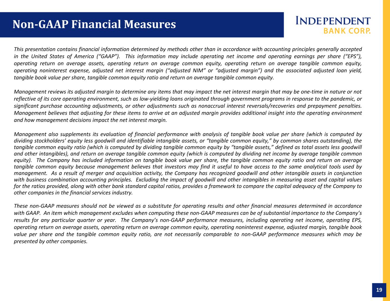 19 This presentation contains financial information determined by methods other than in accordance with accounting principles generally accepted in the United States of America (“GAAP”). This information may include operating net income and operating earnings per share (“EPS”), operating return on average assets, operating return on average common equity, operating return on average tangible common equity, operating noninterest expense, adjusted net interest margin (“adjusted NIM” or “adjusted margin”) and the associated adjusted loan yield, tangible book value per share, tangible common equity ratio and return on average tangible common equity. Management reviews its adjusted margin to determine any items that may impact the net interest margin that may be one-time in nature or not reflective of its core operating environment, such as low-yielding loans originated through government programs in response to the pandemic, or significant purchase accounting adjustments, or other adjustments such as nonaccrual interest reversals/recoveries and prepayment penalties. Management believes that adjusting for these items to arrive at an adjusted margin provides additional insight into the operating environment and how management decisions impact the net interest margin. Management also supplements its evaluation of financial performance with analysis of tangible book value per share (which is computed by dividing stockholders’ equity less goodwill and identifiable intangible assets, or “tangible common equity,” by common shares outstanding), the tangible common equity ratio (which is computed by dividing tangible common equity by “tangible assets,” defined as total assets less goodwill and other intangibles), and return on average tangible common equity (which is computed by dividing net income by average tangible common equity). The Company has included information on tangible book value per share, the tangible common equity ratio and return on average tangible common equity because management believes that investors may find it useful to have access to the same analytical tools used by management. As a result of merger and acquisition activity, the Company has recognized goodwill and other intangible assets in conjunction with business combination accounting principles. Excluding the impact of goodwill and other intangibles in measuring asset and capital values for the ratios provided, along with other bank standard capital ratios, provides a framework to compare the capital adequacy of the Company to other companies in the financial services industry. These non-GAAP measures should not be viewed as a substitute for operating results and other financial measures determined in accordance with GAAP. An item which management excludes when computing these non-GAAP measures can be of substantial importance to the Company’s results for any particular quarter or year. The Company’s non-GAAP performance measures, including operating net income, operating EPS, operating return on average assets, operating return on average common equity, operating noninterest expense, adjusted margin, tangible book value per share and the tangible common equity ratio, are not necessarily comparable to non-GAAP performance measures which may be presented by other companies. Non-GAAP Financial Measures