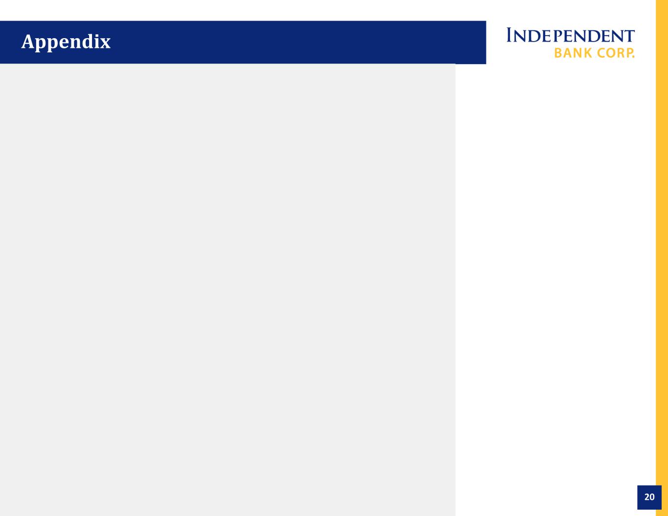 17 • High quality franchise in attractive markets • Low risk balance sheet with strong core deposit funding base • Strong capital base, well-above regulatory mandated levels that enables maximum capital management flexibility • Earnings expected to notably improve as fixed assets reprice to prevailing market rates • Enterprise Bancorp acquisition is helping drive improved profitability metrics • While acknowledging recent asset quality challenges, our proactive response will reduce recent earnings volatility • Focused on positioning the Company for durable and consistent long-term returns for investors Positioned to grow, build, and acquire to drive long-term value creation INDB Investment Merits