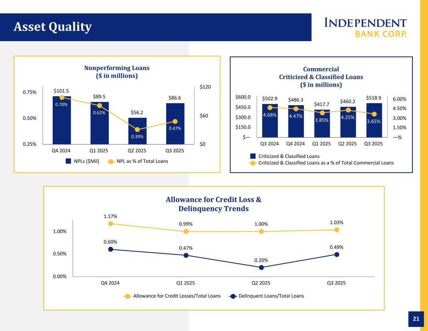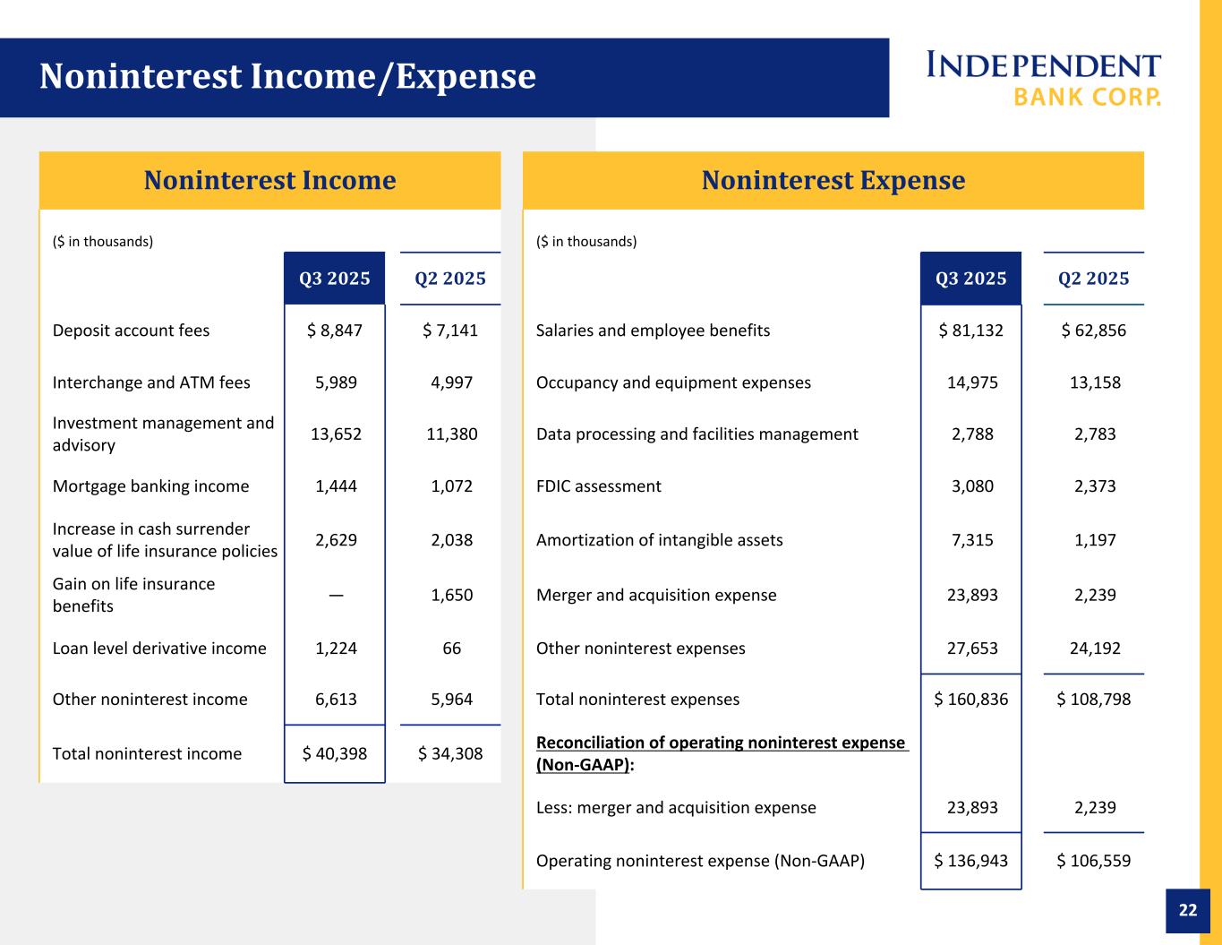21 Nonperforming Loans ($ in millions) $101.5 $89.5 $56.2 $86.6 0.70% 0.62% 0.39% 0.47% NPLs ($Mil) NPL as % of Total Loans Q4 2024 Q1 2025 Q2 2025 Q3 2025 0.25% 0.50% 0.75% $0 $60 $120 Commercial Criticized & Classified Loans ($ in millions) $502.9 $486.3 $417.7 $460.2 $518.9 4.68% 4.47% 3.85% 4.25% 3.65% Criticized & Classified Loans Criticized & Classified Loans as a % of Total Commercial Loans Q3 2024 Q4 2024 Q1 2025 Q2 2025 Q3 2025 $— $150.0 $300.0 $450.0 $600.0 —% 1.50% 3.00% 4.50% 6.00% Asset Quality Allowance for Credit Loss & Delinquency Trends 1.17% 0.99% 1.00% 1.03% 0.60% 0.47% 0.20% 0.49% Allowance for Credit Losses/Total Loans Delinquent Loans/Total Loans Q4 2024 Q1 2025 Q2 2025 Q3 2025 0.00% 0.50% 1.00%