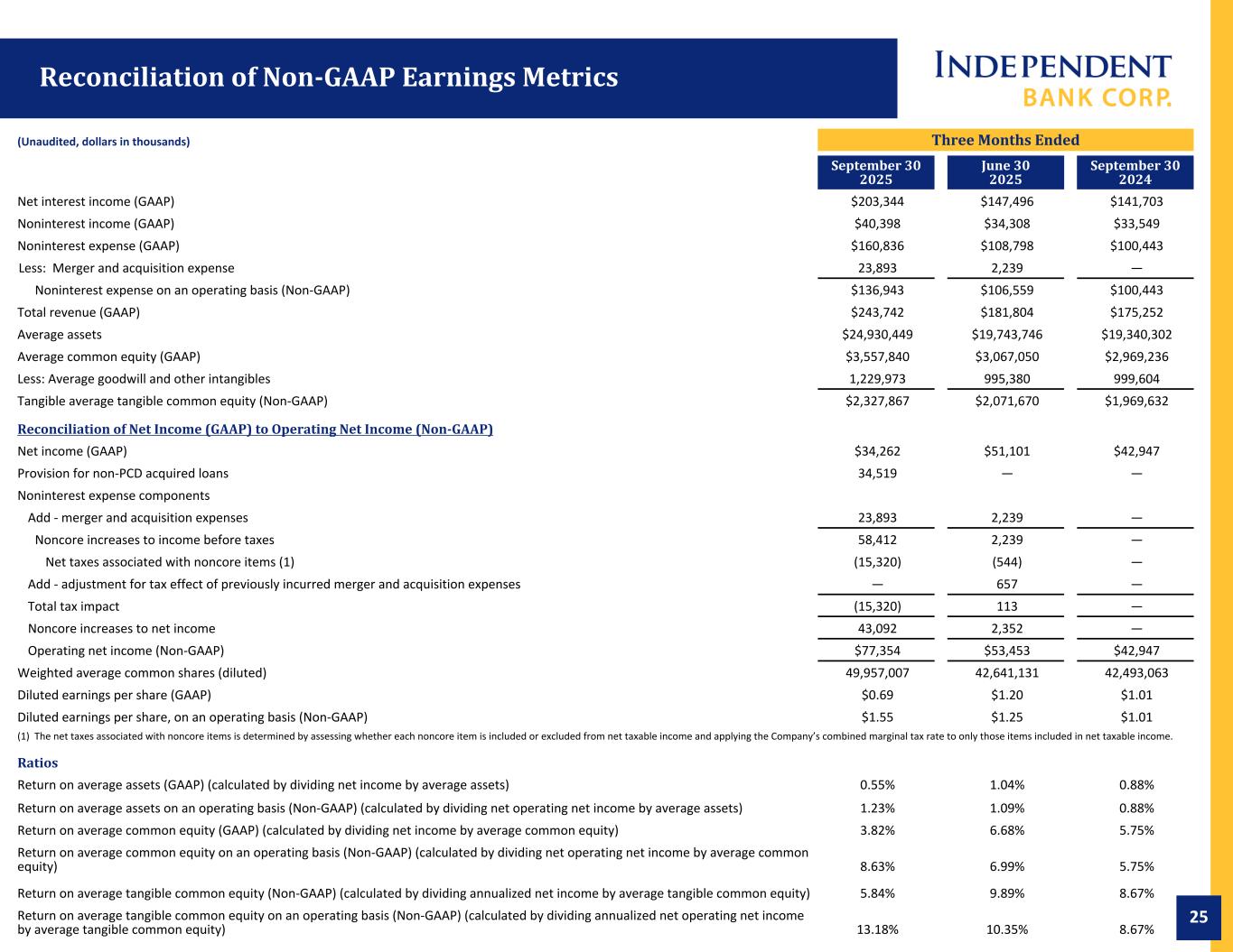 24 (Dollars in thousands) September 30, December 31, 2025 2024 2023 2022 Tangible common equity Stockholders' equity (GAAP) $3,546,887 $2,993,120 $2,895,251 $2,886,701 (a) Less: Goodwill and other intangibles 1,225,106 997,356 1,003,262 1,010,140 Tangible common equity $2,321,781 $1,995,764 $1,891,989 $1,876,561 (b) Common shares 49,787,305 42,500,611 42,873,187 45,641,238 (c) Book Value per share (GAAP) $71.24 $70.43 $67.53 $63.25 (a/c) Tangible book value per share (Non-GAAP) $46.63 $46.96 $44.13 $41.12 (b/c) Non-GAAP Reconciliation of Capital Metrics The following table reconciles Book Value per share, which is a GAAP based measure to Tangible Book Value per share, which is a non-GAAP based measure, at the dates indicated: