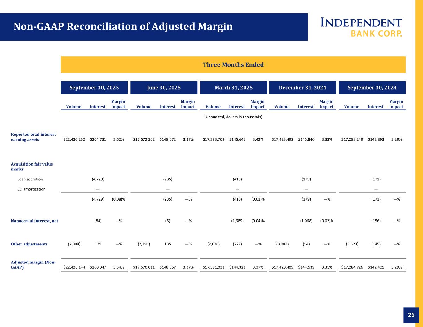 25 Reconciliation of Non-GAAP Earnings Metrics (Unaudited, dollars in thousands) Three Months Ended September 30 2025 June 30 2025 September 30 2024 Net interest income (GAAP) $203,344 $147,496 $141,703 Noninterest income (GAAP) $40,398 $34,308 $33,549 Noninterest expense (GAAP) $160,836 $108,798 $100,443 Less: Merger and acquisition expense 23,893 2,239 — Noninterest expense on an operating basis (Non-GAAP) $136,943 $106,559 $100,443 Total revenue (GAAP) $243,742 $181,804 $175,252 Average assets $24,930,449 $19,743,746 $19,340,302 Average common equity (GAAP) $3,557,840 $3,067,050 $2,969,236 Less: Average goodwill and other intangibles 1,229,973 995,380 999,604 Tangible average tangible common equity (Non-GAAP) $2,327,867 $2,071,670 $1,969,632 Reconciliation of Net Income (GAAP) to Operating Net Income (Non-GAAP) Net income (GAAP) $34,262 $51,101 $42,947 Provision for non-PCD acquired loans 34,519 — — Noninterest expense components Add - merger and acquisition expenses 23,893 2,239 — Noncore increases to income before taxes 58,412 2,239 — Net taxes associated with noncore items (1) (15,320) (544) — Add - adjustment for tax effect of previously incurred merger and acquisition expenses — 657 — Total tax impact (15,320) 113 — Noncore increases to net income 43,092 2,352 — Operating net income (Non-GAAP) $77,354 $53,453 $42,947 Weighted average common shares (diluted) 49,957,007 42,641,131 42,493,063 Diluted earnings per share (GAAP) $0.69 $1.20 $1.01 Diluted earnings per share, on an operating basis (Non-GAAP) $1.55 $1.25 $1.01 (1) The net taxes associated with noncore items is determined by assessing whether each noncore item is included or excluded from net taxable income and applying the Company’s combined marginal tax rate to only those items included in net taxable income. Ratios Return on average assets (GAAP) (calculated by dividing net income by average assets) 0.55% 1.04% 0.88% Return on average assets on an operating basis (Non-GAAP) (calculated by dividing net operating net income by average assets) 1.23% 1.09% 0.88% Return on average common equity (GAAP) (calculated by dividing net income by average common equity) 3.82% 6.68% 5.75% Return on average common equity on an operating basis (Non-GAAP) (calculated by dividing net operating net income by average common equity) 8.63% 6.99% 5.75% Return on average tangible common equity (Non-GAAP) (calculated by dividing annualized net income by average tangible common equity) 5.84% 9.89% 8.67% Return on average tangible common equity on an operating basis (Non-GAAP) (calculated by dividing annualized net operating net income by average tangible common equity) 13.18% 10.35% 8.67%