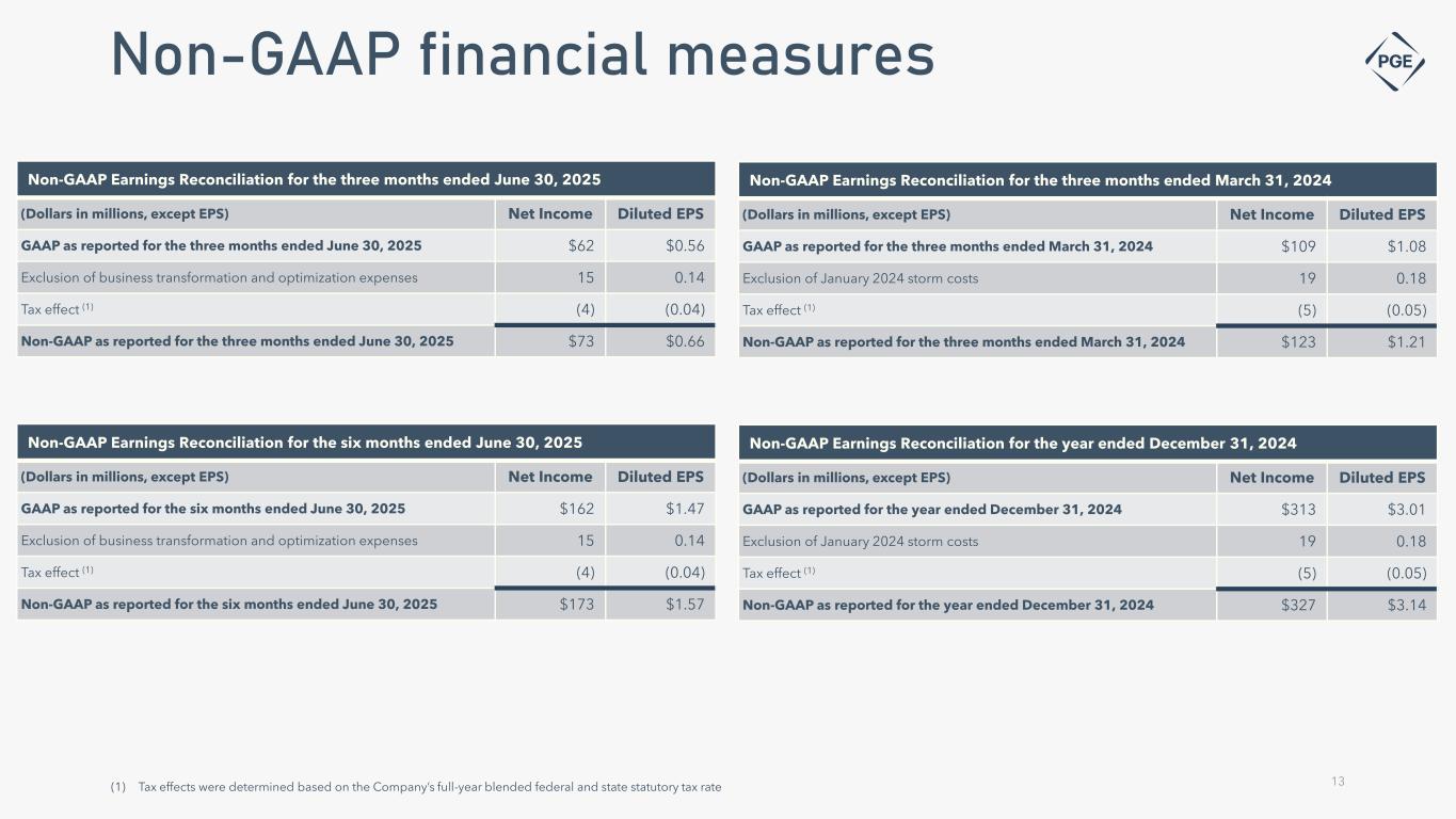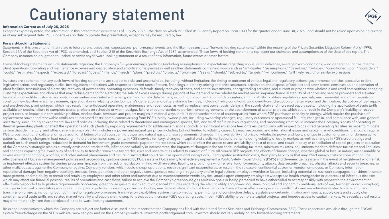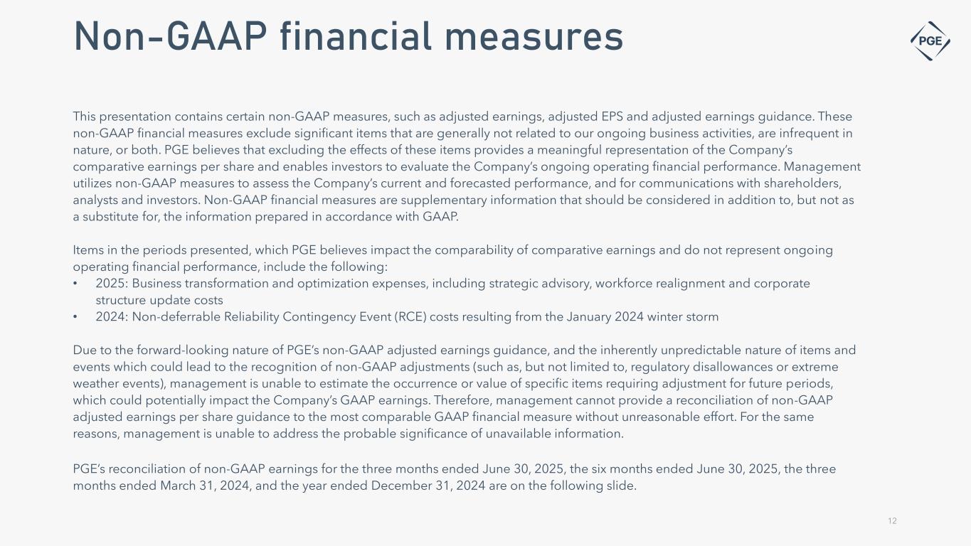 本プレスリリースには、調整後利益、調整後EPS、調整後利益ガイダンスなど、特定の非GAAP指標が含まれています。これらの非GAAPベースの財務指標は、一般的に当社の継続的な事業活動に関連しない、性質上まれな、またはその両方の重要な項目を除外しています。PGEは、これらの項目の影響を除外することで、当社の比較1株当たり利益を有意義に表示し、投資家が当社の継続的な営業財務実績を評価できるようになると考えています。経営陣は当社の現在および将来の業績を評価するため、また株主、アナリスト、投資家とのコミュニケーションのために非GAAP指標を利用しています。非GAAPベースの財務指標は、GAAPに基づいて作成された情報に加えて考慮されるべき補足情報であり、GAAPに基づいて作成された情報に代わるものではありません。