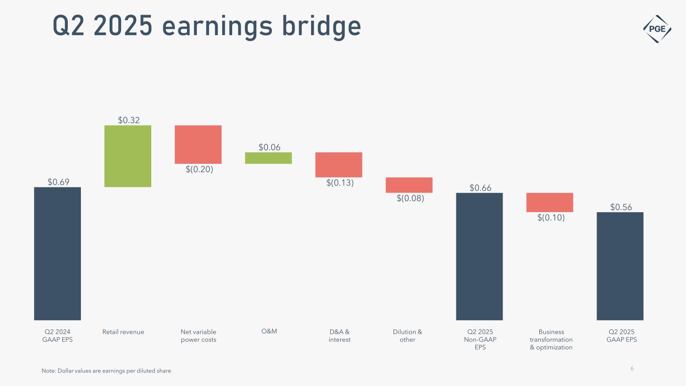 ポートランド(オレゴン州)--ポートランド・ゼネラル・エレクトリック・カンパニー(NYSE: POR)は本日、一般に公正妥当と認められた会計原則(GAAP)に基づく2025年第2四半期の純利益を6,200万ドル(希薄化後1株当たり0.56ドル)と発表しました。事業転換・最適化費用の影響調整後の2025年度第2四半期の非GAAPベースの純利益は7,300万ドル(希薄化後1株当たり0.66ドル)でした。これに対し、2024年度第2四半期のGAAPベースの純利益は7,200万ドル(希薄化後1株当たり0.69ドル)であった。