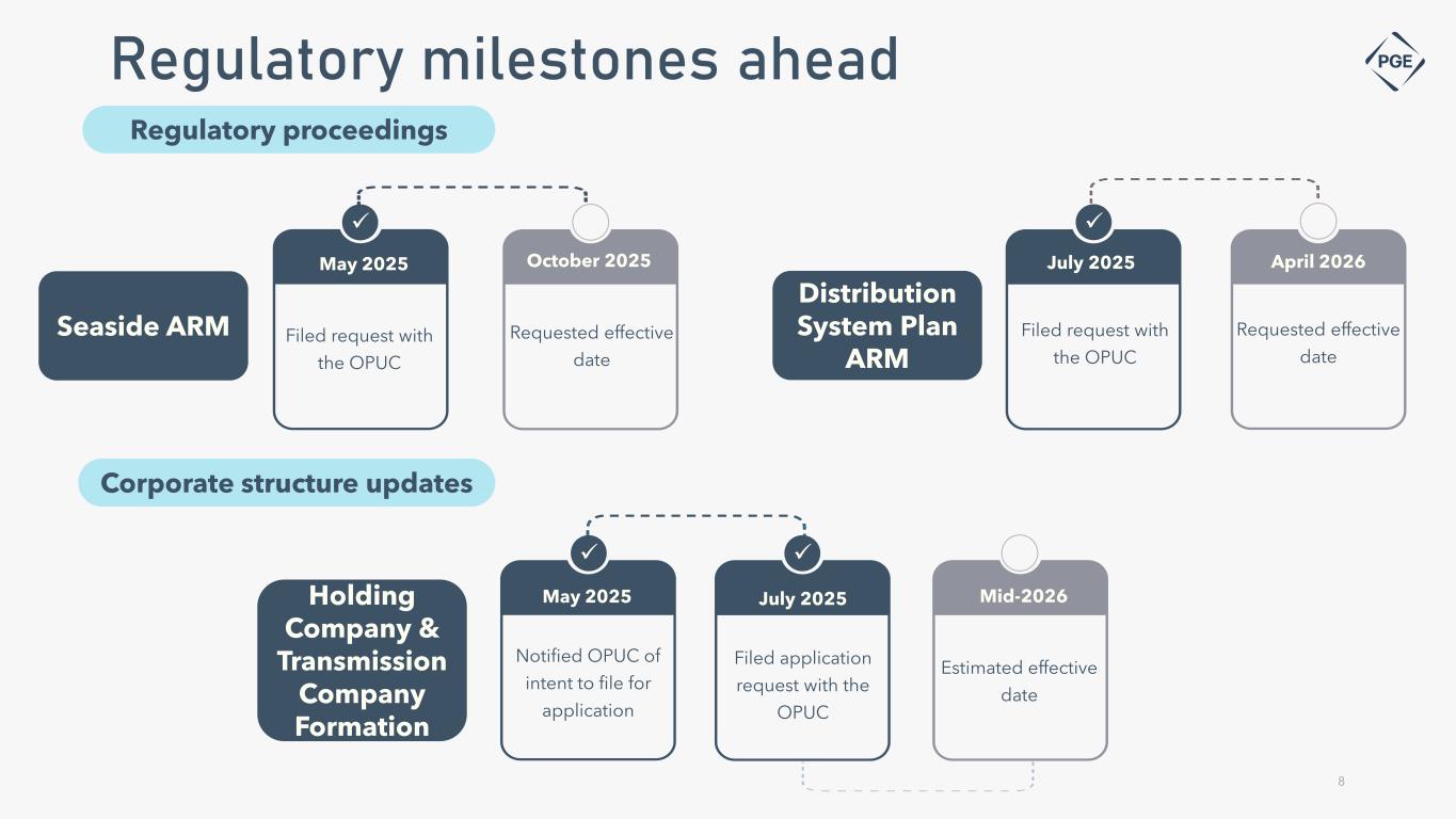 また本日、PGEはOPUCに対し、PGEの配電システム計画(DSP)に関連する費用の回収を求める要請書を提出した。PGEの要求には、年換算で7200万ドルの収入要件増が含まれており、料金発効日は2026年4月1日と提案されている。