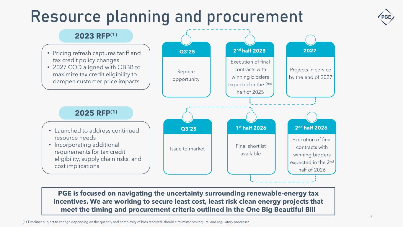 ワン・ビッグ・ビューティフル・ビル(OBBB)の可決を受けて、PGEはすべての適合する2023年RFP入札者に価格設定を更新する機会を提供する予定である。PGEは独立評価機関と協力し、今後数ヶ月の間に入札者の価格変更を反映したスコアリングとランキングの更新を行う予定である。