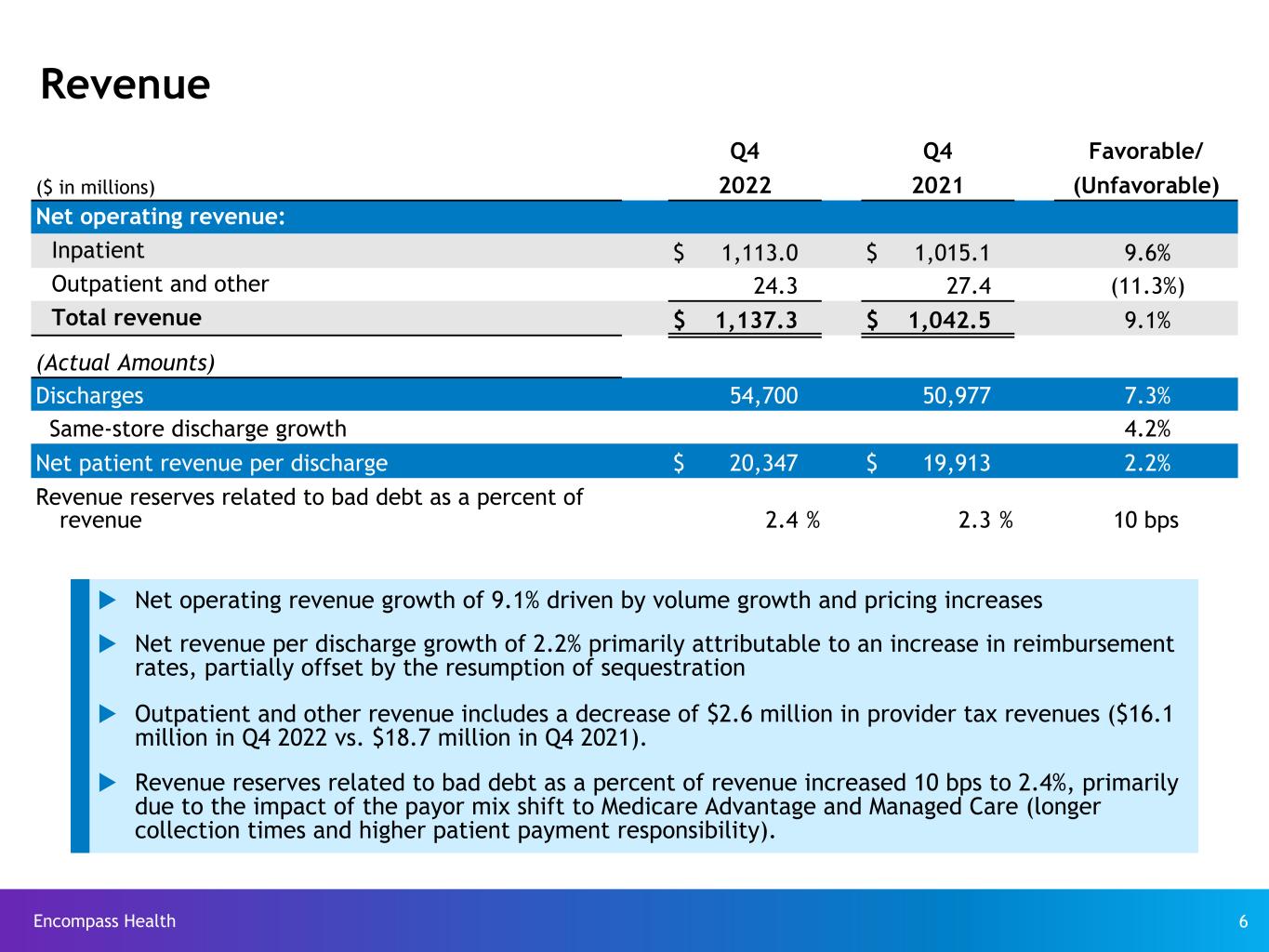 「エンカム・ヘルス社長兼最高経営責任者(CEO)のマーク・ターは、次のように述べています。「第4四半期は2022年を締めくくる非常に好調な業績で、通期業績をガイダンス範囲の上限に引き上げることができました。「退院患者数は7.3%増と再び好調に推移しました。人件費削減の継続的な進展と新人の堅実な貢献により、当四半期は2桁の増益を達成しました。当社の価値提案と経営戦略がさらに実証され、当社の事業の長期的見通しについて非常に楽観的であり続けることができました。