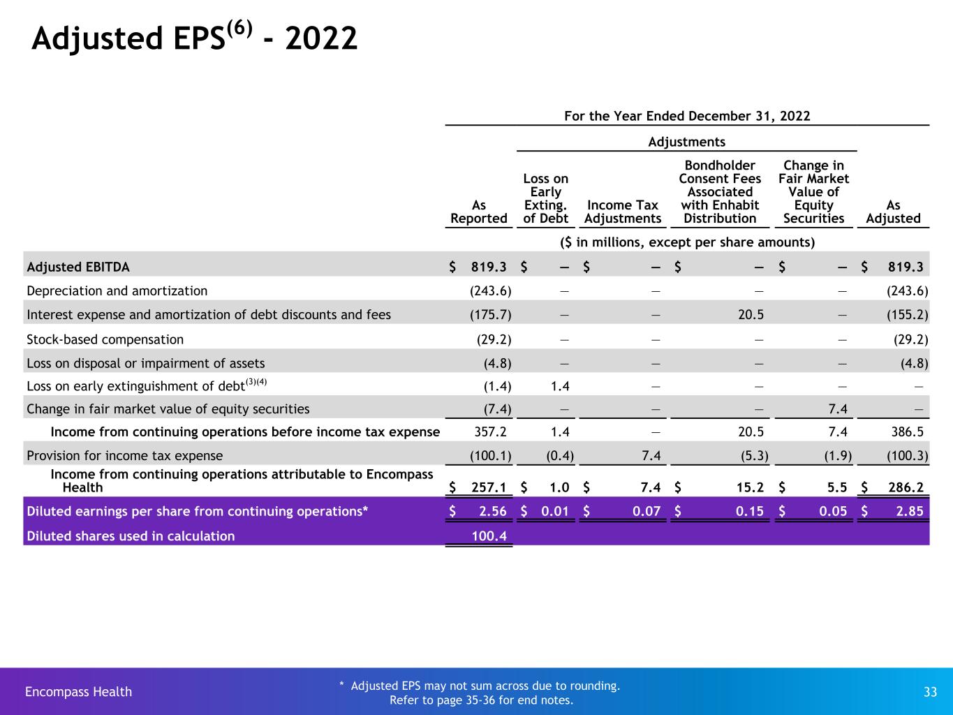 当社は、エンコンパス・ヘルス社に帰属する継続事業の調整後1株当たり利益(以下「調整後1株当たり利益」)を提供しています。調整後1株当たり利益は、政府、集団訴訟、および関連する和解の影響、会計、税務、法務などの専門家報酬、新株予約権の時価評価による調整を除外しているため、継続事業の業績を過年度と比較しやすく、投資家の皆様に有用な追加情報を提供するものと考えています。また、法人税等調整額(評価性引当金の調整、法人税等の請求権の決済など)、事業再編に関連する項目、及びその他当社が継続事業の業績を示すものでないと判断した項目も含まれ ています。これらの除外項目は将来の期間において1つまたは複数発生することが合理的 ですが、認識される金額は期間により大きく異なり、また当社の継続的な業績と直接関係しない可能性があります。従って、これらの項目は、期をまたがる当社業績の比較や、他のヘルスケア企業との比較を複雑にする可能性があります。調整後1株当り利益は、そこから除外される項目が業績の理解と評価において重要な要素であるため、米国で一般に公正妥当と認められた会計原則(以下「GAAP」)に基づく財務業績の指標として考慮されるべきものではありません。調整後1株当り利益は、GAAPに従って決定された測定値ではなく、そのため様々な計算の影響を受けるため、他の会社の同様のタイトルを持つ測定値と表示上は比較できない可能性があります。当社は、別紙99.1記載のプレスリリース及び別紙99.2記載の補足情報において、調整後1株当り利益と1株当り利益との調整を 行っています。