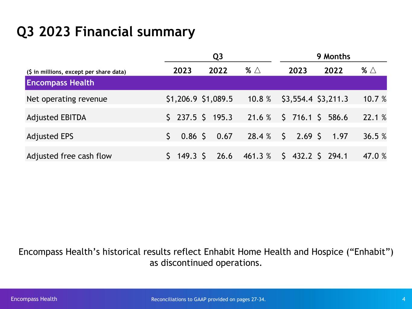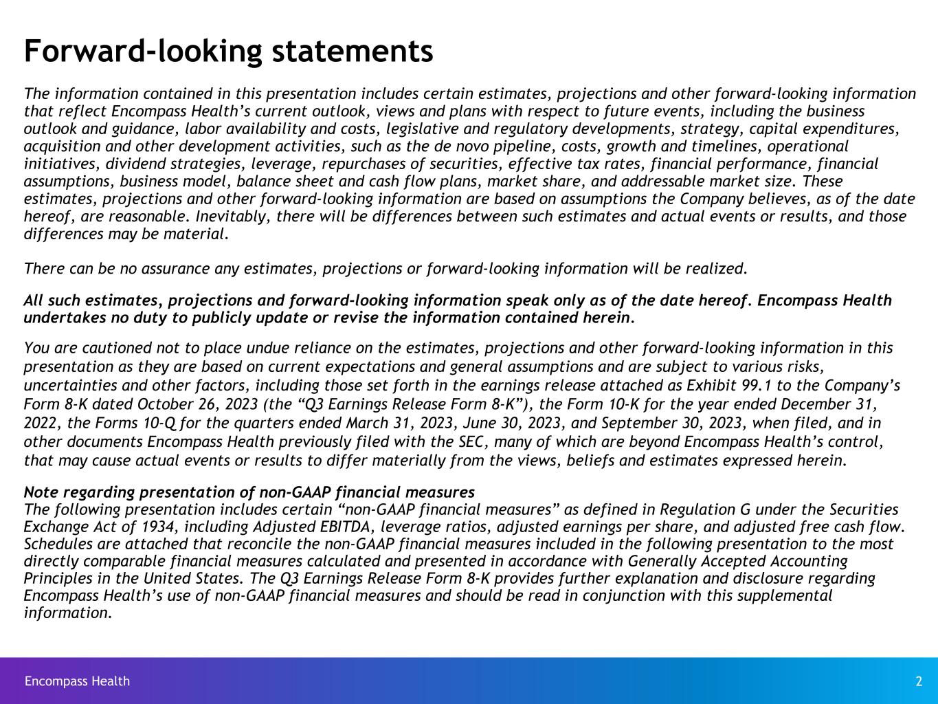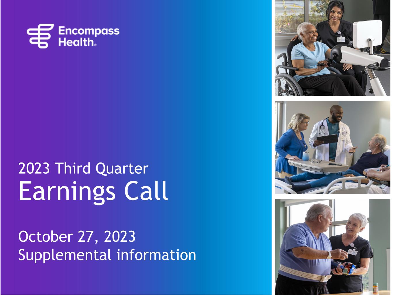 Encompass Health 2 The information contained in this presentation includes certain estimates, projections and other forward-looking information that reflect Encompass Health’s current outlook, views and plans with respect to future events, including the business outlook and guidance, labor availability and costs, legislative and regulatory developments, strategy, capital expenditures, acquisition and other development activities, such as the de novo pipeline, costs, growth and timelines, operational initiatives, dividend strategies, leverage, repurchases of securities, effective tax rates, financial performance, financial assumptions, business model, balance sheet and cash flow plans, market share, and addressable market size. These estimates, projections and other forward-looking information are based on assumptions the Company believes, as of the date hereof, are reasonable. Inevitably, there will be differences between such estimates and actual events or results, and those differences may be material. There can be no assurance any estimates, projections or forward-looking information will be realized. All such estimates, projections and forward-looking information speak only as of the date hereof. Encompass Health undertakes no duty to publicly update or revise the information contained herein. You are cautioned not to place undue reliance on the estimates, projections and other forward-looking information in this presentation as they are based on current expectations and general assumptions and are subject to various risks, uncertainties and other factors, including those set forth in the earnings release attached as Exhibit 99.1 to the Company’s Form 8-K dated October 26, 2023 (the “Q3 Earnings Release Form 8-K”), the Form 10-K for the year ended December 31, 2022, the Forms 10-Q for the quarters ended March 31, 2023, June 30, 2023, and September 30, 2023, when filed, and in other documents Encompass Health previously filed with the SEC, many of which are beyond Encompass Health’s control, that may cause actual events or results to differ materially from the views, beliefs and estimates expressed herein. Note regarding presentation of non-GAAP financial measures The following presentation includes certain “non-GAAP financial measures” as defined in Regulation G under the Securities Exchange Act of 1934, including Adjusted EBITDA, leverage ratios, adjusted earnings per share, and adjusted free cash flow. Schedules are attached that reconcile the non-GAAP financial measures included in the following presentation to the most directly comparable financial measures calculated and presented in accordance with Generally Accepted Accounting Principles in the United States. The Q3 Earnings Release Form 8-K provides further explanation and disclosure regarding Encompass Health’s use of non-GAAP financial measures and should be read in conjunction with this supplemental information. Forward-looking statements