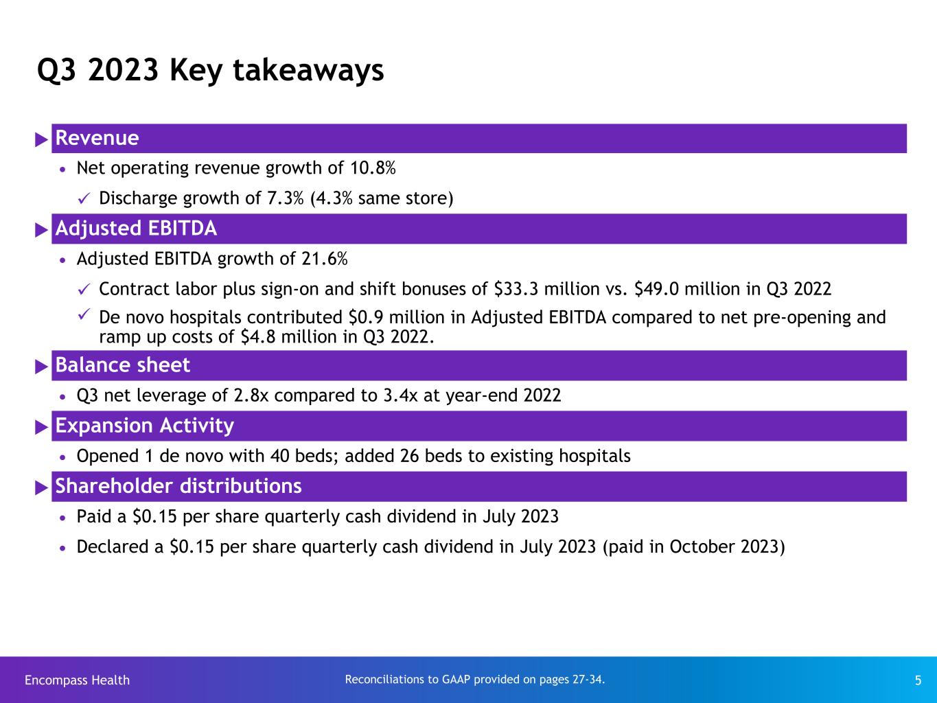 Encompass Health 4 Q3 2023 Financial summary Q3 9 Months ($ in millions, except per share data) 2023 2022 % △ 2023 2022 % △ Encompass Health Net operating revenue $ 1,206.9 $ 1,089.5 10.8 % $ 3,554.4 $ 3,211.3 10.7 % Adjusted EBITDA $ 237.5 $ 195.3 21.6 % $ 716.1 $ 586.6 22.1 % Adjusted EPS $ 0.86 $ 0.67 28.4 % $ 2.69 $ 1.97 36.5 % Adjusted free cash flow $ 149.3 $ 26.6 461.3 % $ 432.2 $ 294.1 47.0 % Reconciliations to GAAP provided on pages 27-34. Encompass Health’s historical results reflect Enhabit Home Health and Hospice (“Enhabit”) as discontinued operations.