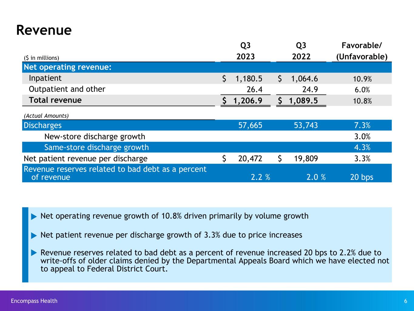 Encompass Health 5 Q3 2023 Key takeaways u Revenue Ÿ Net operating revenue growth of 10.8% ü Discharge growth of 7.3% (4.3% same store) u Adjusted EBITDA Ÿ Adjusted EBITDA growth of 21.6% ü Contract labor plus sign-on and shift bonuses of $33.3 million vs. $49.0 million in Q3 2022 ü De novo hospitals contributed $0.9 million in Adjusted EBITDA compared to net pre-opening and ramp up costs of $4.8 million in Q3 2022. u Balance sheet Ÿ Q3 net leverage of 2.8x compared to 3.4x at year-end 2022 u Expansion Activity Ÿ Opened 1 de novo with 40 beds; added 26 beds to existing hospitals u Shareholder distributions Ÿ Paid a $0.15 per share quarterly cash dividend in July 2023 Ÿ Declared a $0.15 per share quarterly cash dividend in July 2023 (paid in October 2023) Reconciliations to GAAP provided on pages 27-34.