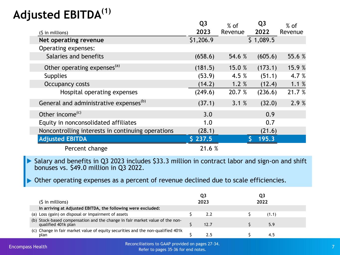 Encompass Health 6 Revenue Q3 Q3 Favorable/ ($ in millions) 2023 2022 (Unfavorable) Net operating revenue: Inpatient $ 1,180.5 $ 1,064.6 10.9% Outpatient and other 26.4 24.9 6.0% Total revenue $ 1,206.9 $ 1,089.5 10.8% (Actual Amounts) Discharges 57,665 53,743 7.3% New-store discharge growth 3.0% Same-store discharge growth 4.3% Net patient revenue per discharge $ 20,472 $ 19,809 3.3% Revenue reserves related to bad debt as a percent of revenue 2.2 % 2.0 % 20 bps u Net operating revenue growth of 10.8% driven primarily by volume growth u Net patient revenue per discharge growth of 3.3% due to price increases u Revenue reserves related to bad debt as a percent of revenue increased 20 bps to 2.2% due to write-offs of older claims denied by the Departmental Appeals Board which we have elected not to appeal to Federal District Court.