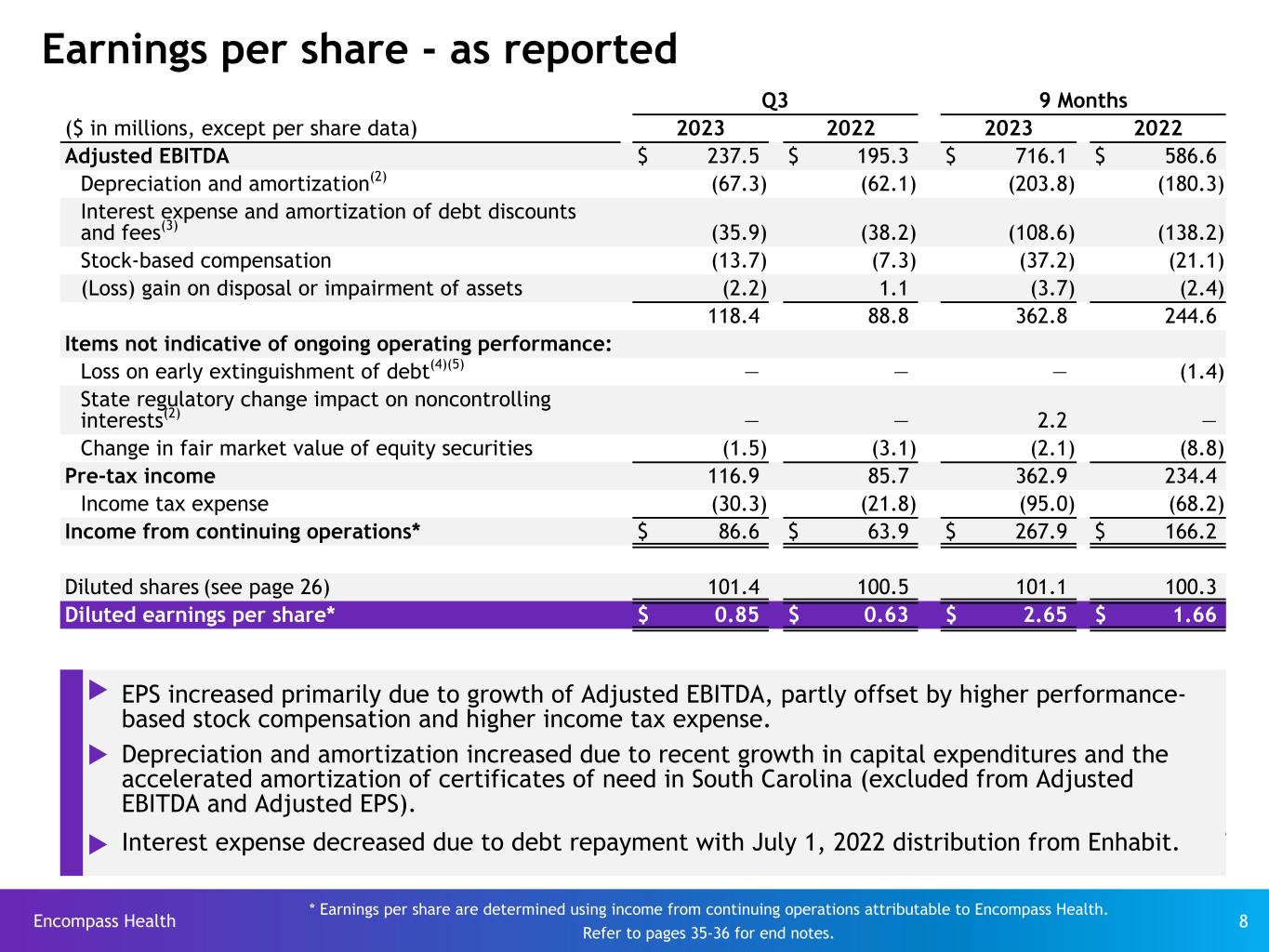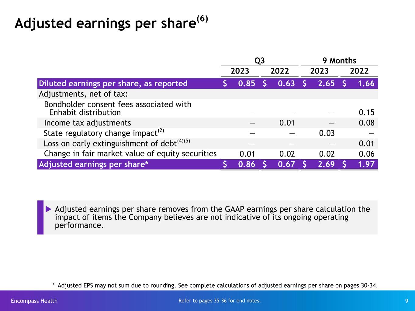 Encompass Health 8 Earnings per share - as reported Q3 9 Months ($ in millions, except per share data) 2023 2022 2023 2022 Adjusted EBITDA $ 237.5 $ 195.3 $ 716.1 $ 586.6 Depreciation and amortization(2) (67.3) (62.1) (203.8) (180.3) Interest expense and amortization of debt discounts and fees(3) (35.9) (38.2) (108.6) (138.2) Stock-based compensation (13.7) (7.3) (37.2) (21.1) (Loss) gain on disposal or impairment of assets (2.2) 1.1 (3.7) (2.4) 118.4 88.8 362.8 244.6 Items not indicative of ongoing operating performance: Loss on early extinguishment of debt(4)(5) — — — (1.4) State regulatory change impact on noncontrolling interests(2) — — 2.2 — Change in fair market value of equity securities (1.5) (3.1) (2.1) (8.8) Pre-tax income 116.9 85.7 362.9 234.4 Income tax expense (30.3) (21.8) (95.0) (68.2) Income from continuing operations* $ 86.6 $ 63.9 $ 267.9 $ 166.2 Diluted shares (see page 26) 101.4 100.5 101.1 100.3 Diluted earnings per share* $ 0.85 $ 0.63 $ 2.65 $ 1.66 * Earnings per share are determined using income from continuing operations attributable to Encompass Health. Refer to pages 35-36 for end notes. u EPS increased primarily due to growth of Adjusted EBITDA, partly offset by higher performance- based stock compensation and higher income tax expense. u Depreciation and amortization increased due to recent growth in capital expenditures and the accelerated amortization of certificates of need in South Carolina (excluded from Adjusted EBITDA and Adjusted EPS). u Interest expense decreased due to debt repayment with July 1, 2022 distribution from Enhabit. Y T D