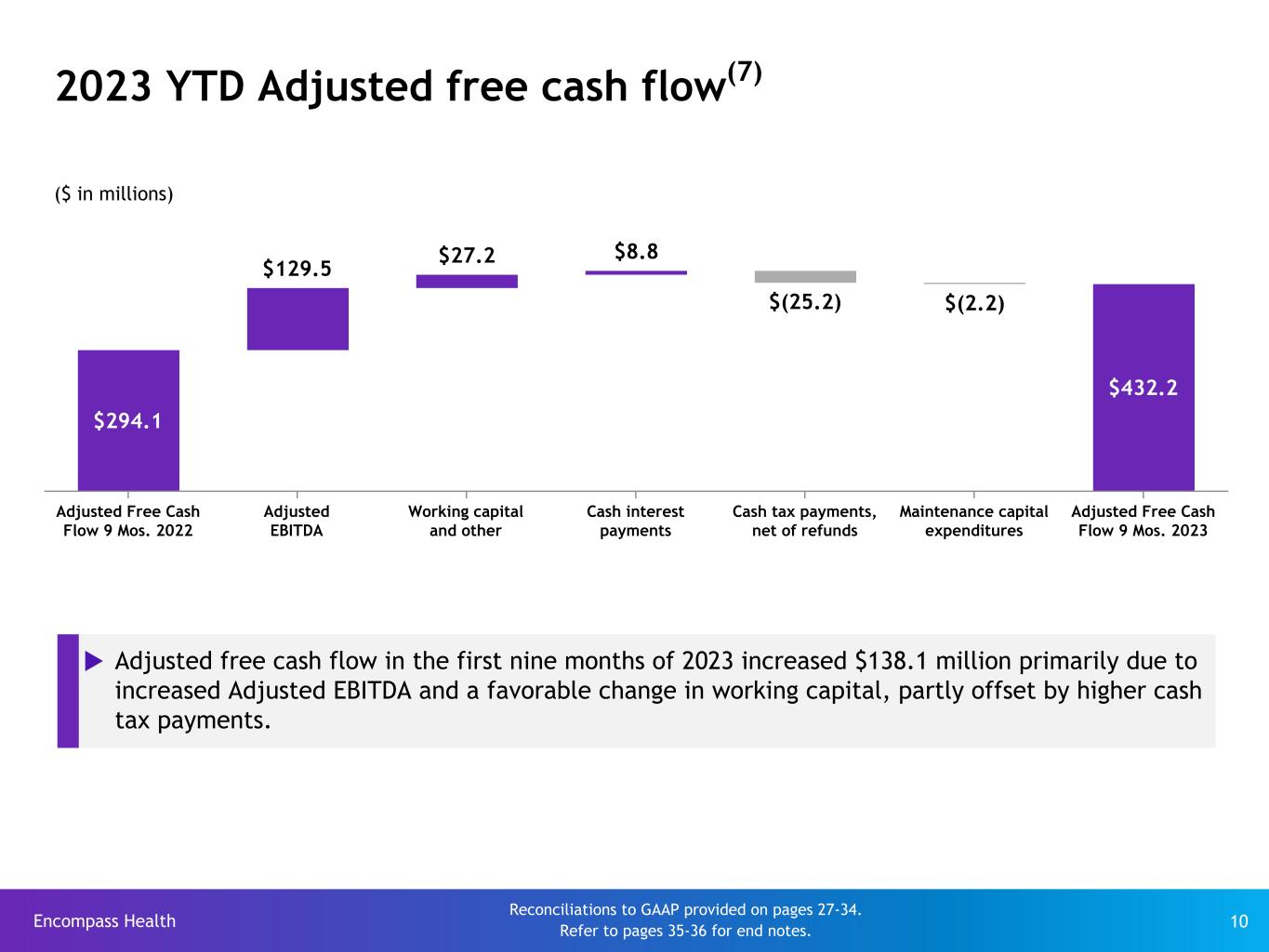 Encompass Health 9 Adjusted earnings per share(6) Refer to pages 35-36 for end notes. Q3 9 Months 2023 2022 2023 2022 Diluted earnings per share, as reported $ 0.85 $ 0.63 $ 2.65 $ 1.66 Adjustments, net of tax: Bondholder consent fees associated with Enhabit distribution — — — 0.15 Income tax adjustments — 0.01 — 0.08 State regulatory change impact(2) — — 0.03 — Loss on early extinguishment of debt(4)(5) — — — 0.01 Change in fair market value of equity securities 0.01 0.02 0.02 0.06 Adjusted earnings per share* $ 0.86 $ 0.67 $ 2.69 $ 1.97 u Adjusted earnings per share removes from the GAAP earnings per share calculation the impact of items the Company believes are not indicative of its ongoing operating performance. * Adjusted EPS may not sum due to rounding. See complete calculations of adjusted earnings per share on pages 30-34.