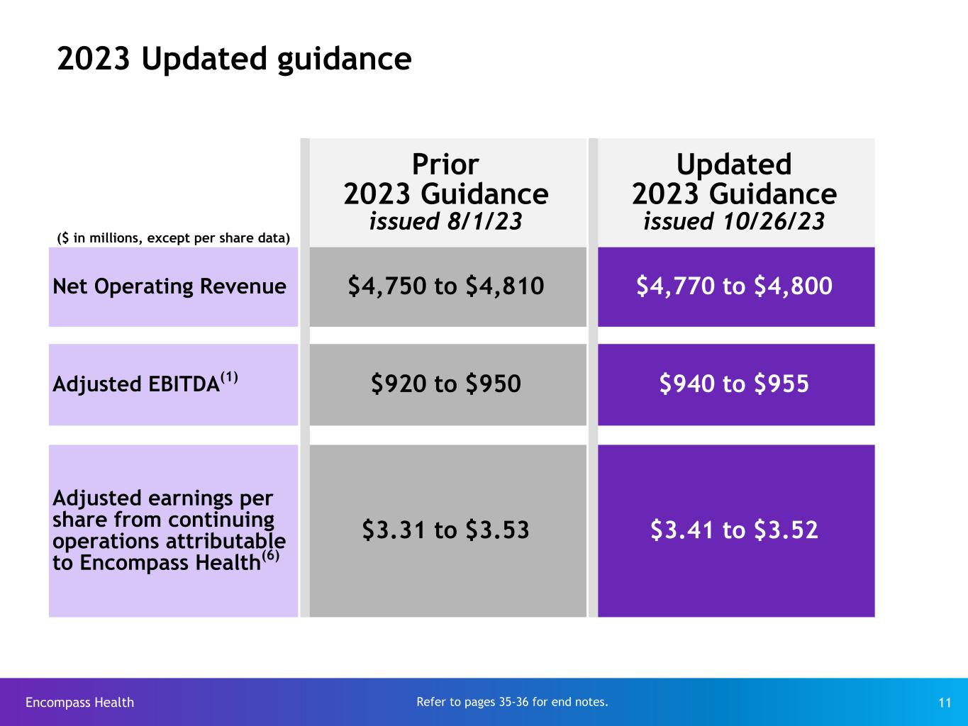 Encompass Health 35 End notes Reconciliations to GAAP provided on pages 27-34. (1) Adjusted EBITDA is a non-GAAP financial measure. The Company’s leverage ratio (total consolidated debt to Adjusted EBITDA for the trailing four quarters) is, likewise, a non-GAAP measure. Management and some members of the investment community utilize Adjusted EBITDA as a financial measure and the leverage ratio as a liquidity measure on an ongoing basis. These measures are not recognized in accordance with GAAP and should not be viewed as an alternative to GAAP measures of performance or liquidity. In evaluating Adjusted EBITDA, the reader should be aware that in the future the Company may incur expenses similar to the adjustments set forth. (2) In May of 2023, the governor of South Carolina signed into law S.164, which repealed the requirement of certain healthcare providers to obtain and/or maintain a certificate of need (“CON”). As a results of this repeal, in Q2 2023 we accelerated amortization of approximately $6 million in remaining carrying value of our South Carolina CON assets, increasing depreciation and amortization expense by approximately $6 million and reducing noncontrolling interest in continuing operations by approximately $2 million (related to our joint venture partner’s share of income at one impacted location). The impact of these adjustments have been excluded from the calculation of adjusted EBITDA and adjusted earnings per share in the second quarter of 2023 given the non-recurring nature of the CON repeal (Florida is the only other state in recent history to repeal its CON law) is not indicative of ongoing operating performance. (3) In the second quarter of 2022, the Company paid $20.5 million as a consent solicitation fee to bondholders related to the spin off of Enhabit. (4) In the first quarter of 2022, the Company redeemed the remaining $100 million of its 5.125% Senior Notes due 2023. The redemption was completed at 100% of par using drawings under the Company’s revolving credit facility. As a result of the redemption, the Company recorded a $0.3 million loss on early extinguishment of debt in the first quarter of 2022. (5) In the second quarter of 2022, the Company redeemed approximately $236 million of its term loan due 2024 and fully repaid the $250 million outstanding balance on its revolving credit facility. The redemption was completed using proceeds which were dividended from Enhabit. As a result of the redemption, the Company recorded a $1.1 million loss on early extinguishment of debt in the second quarter of 2022. (6) The Company is providing adjusted earnings per share from continuing operations attributable to Encompass Health (“adjusted earnings per share”), which is a non-GAAP measure. The Company believes the presentation of adjusted earnings per share provides useful additional information to investors because it provides better comparability of ongoing operating performance to prior periods given that it excludes the impact of government, class action, and related settlements, professional fees - accounting, tax, and legal, mark-to-market adjustments for stock appreciation rights, gains or losses related to hedging and equity instruments, loss on early extinguishment of debt, adjustments to its income tax provision (such as valuation allowance adjustments, settlements of income tax claims and windfall tax benefits), items related to corporate and facility restructurings, and certain other items deemed to be non-indicative of ongoing operating performance. It is reasonable to expect that one or more of these excluded items will occur in future periods, but the amounts recognized can vary significantly from period to period and may not directly relate to the Company's ongoing operating performance. Accordingly, they can complicate comparisons of the Company's results of operations across periods and comparisons of the Company's results to those of other healthcare companies. Adjusted earnings per share should not be considered as a measure of financial performance under generally accepted accounting principles in the United States as the items excluded from it are significant components in understanding and assessing financial performance. Because adjusted earnings per share is not a measurement determined in accordance with GAAP and is thus susceptible to varying calculations, it may not be comparable as presented to other similarly titled measures of other companies. (7) The definition of adjusted free cash flow, which is a non-GAAP measure, is net cash provided by operating activities of continuing operations minus capital expenditures for maintenance, distributions to noncontrolling interests, and certain items deemed to be non-indicative of ongoing operating performance. Common stock dividends are not included in the calculation of adjusted free cash flow. Because this measure is not determined in accordance with GAAP and is susceptible to varying calculations, it may not be comparable to other similarly titled measures presented by other companies.
