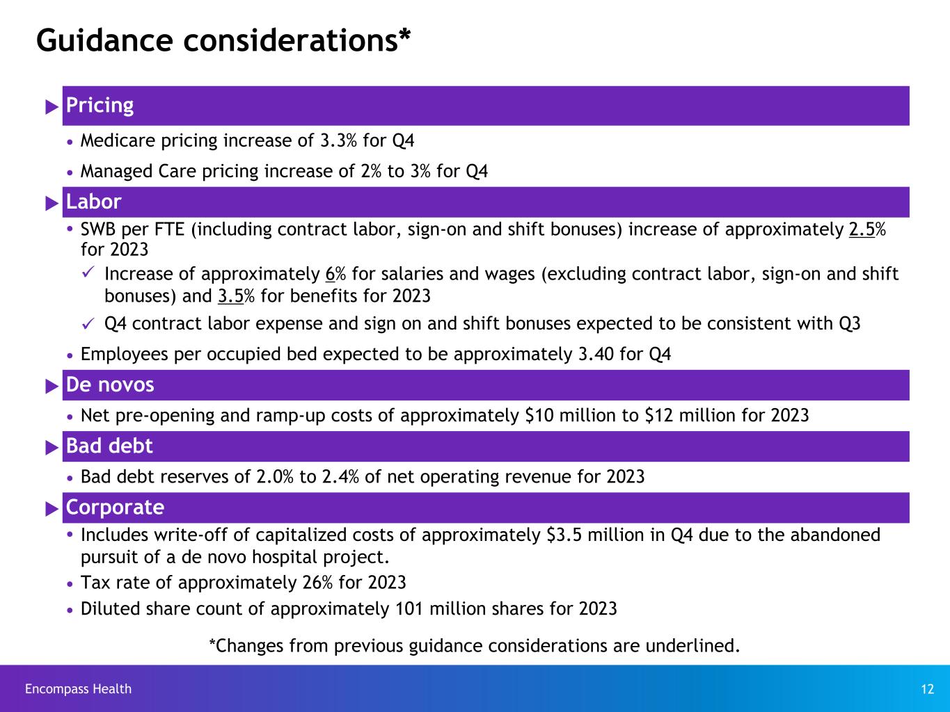 Encompass Health 12 Guidance considerations* u Pricing Ÿ Medicare pricing increase of 3.3% for Q4 Ÿ Managed Care pricing increase of 2% to 3% for Q4 u Labor Ÿ SWB per FTE (including contract labor, sign-on and shift bonuses) increase of approximately 2.5% for 2023 ü Increase of approximately 6% for salaries and wages (excluding contract labor, sign-on and shift bonuses) and 3.5% for benefits for 2023 ü Q4 contract labor expense and sign on and shift bonuses expected to be consistent with Q3 Ÿ Employees per occupied bed expected to be approximately 3.40 for Q4 u De novos Ÿ Net pre-opening and ramp-up costs of approximately $10 million to $12 million for 2023 u Bad debt Ÿ Bad debt reserves of 2.0% to 2.4% of net operating revenue for 2023 u Corporate Ÿ Includes write-off of capitalized costs of approximately $3.5 million in Q4 due to the abandoned pursuit of a de novo hospital project. Ÿ Tax rate of approximately 26% for 2023 Ÿ Diluted share count of approximately 101 million shares for 2023 *Changes from previous guidance considerations are underlined.