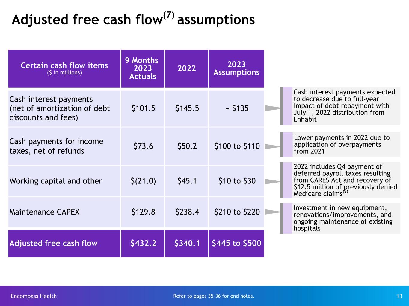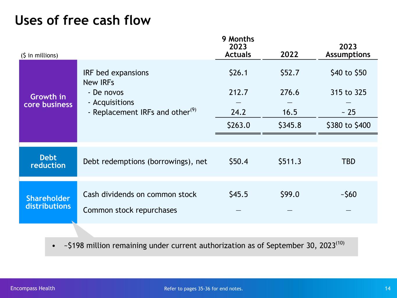 Encompass Health 13 Adjusted free cash flow(7) assumptions Certain cash flow items ($ in millions) 9 Months 2023 Actuals 2022 2023 Assumptions Cash interest payments (net of amortization of debt discounts and fees) $101.5 $145.5 ~ $135 Cash payments for income taxes, net of refunds $73.6 $50.2 $100 to $110 Working capital and other $(21.0) $45.1 $10 to $30 Maintenance CAPEX $129.8 $238.4 $210 to $220 Adjusted free cash flow $432.2 $340.1 $445 to $500 Lower payments in 2022 due to application of overpayments from 2021 2022 includes Q4 payment of deferred payroll taxes resulting from CARES Act and recovery of $12.5 million of previously denied Medicare claims(8) Investment in new equipment, renovations/improvements, and ongoing maintenance of existing hospitals Cash interest payments expected to decrease due to full-year impact of debt repayment with July 1, 2022 distribution from Enhabit Refer to pages 35-36 for end notes.