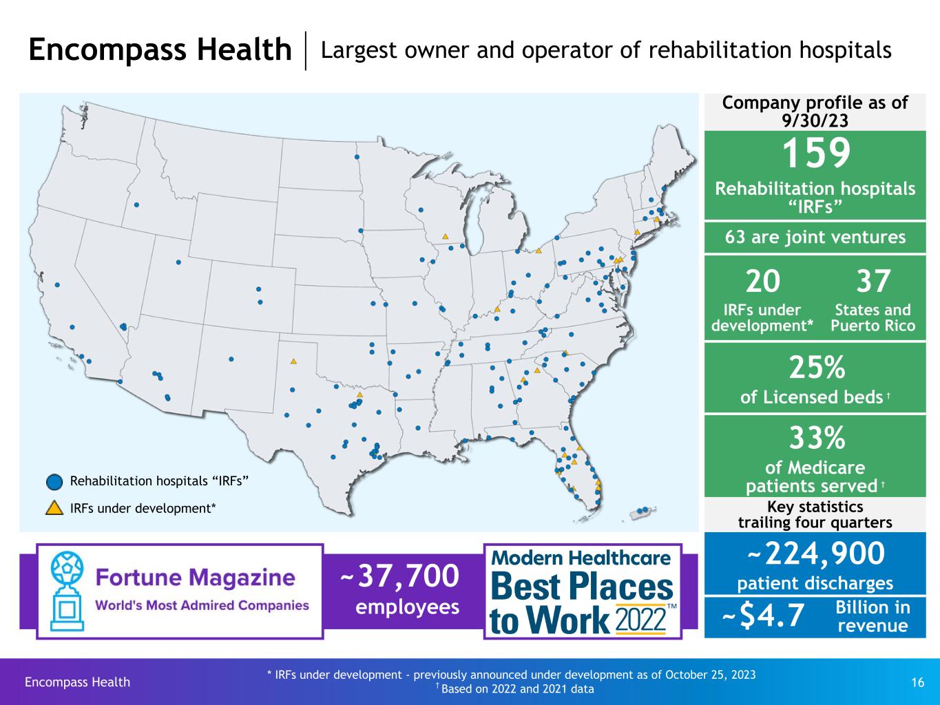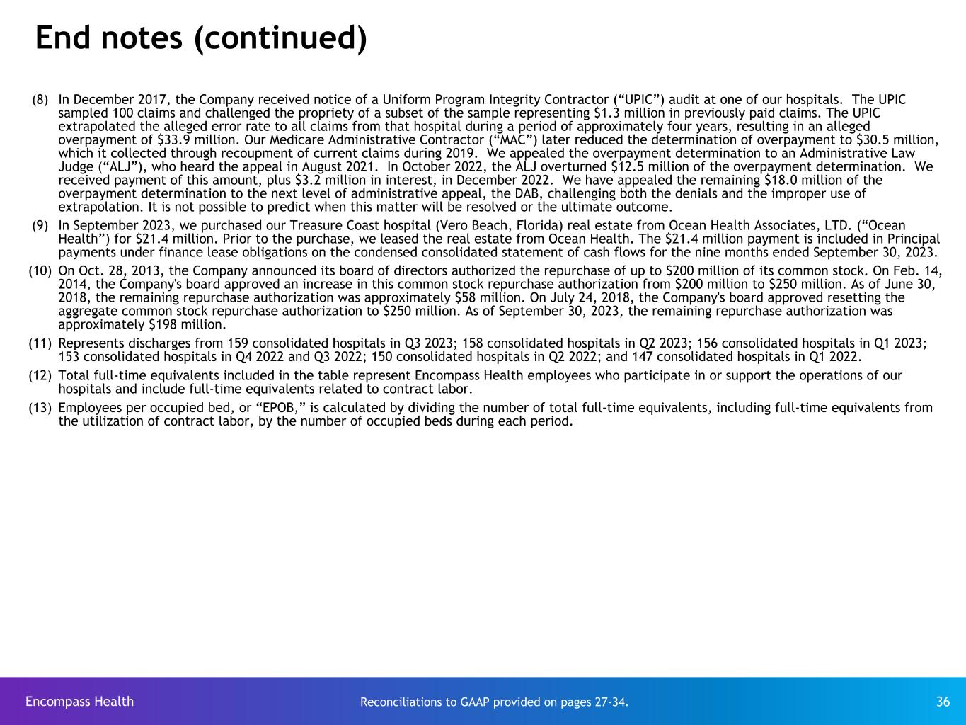 Encompass Health 36 End notes (continued) (8) In December 2017, the Company received notice of a Uniform Program Integrity Contractor (“UPIC”) audit at one of our hospitals. The UPIC sampled 100 claims and challenged the propriety of a subset of the sample representing $1.3 million in previously paid claims. The UPIC extrapolated the alleged error rate to all claims from that hospital during a period of approximately four years, resulting in an alleged overpayment of $33.9 million. Our Medicare Administrative Contractor (“MAC”) later reduced the determination of overpayment to $30.5 million, which it collected through recoupment of current claims during 2019. We appealed the overpayment determination to an Administrative Law Judge (“ALJ”), who heard the appeal in August 2021. In October 2022, the ALJ overturned $12.5 million of the overpayment determination. We received payment of this amount, plus $3.2 million in interest, in December 2022. We have appealed the remaining $18.0 million of the overpayment determination to the next level of administrative appeal, the DAB, challenging both the denials and the improper use of extrapolation. It is not possible to predict when this matter will be resolved or the ultimate outcome. (9) In September 2023, we purchased our Treasure Coast hospital (Vero Beach, Florida) real estate from Ocean Health Associates, LTD. (“Ocean Health”) for $21.4 million. Prior to the purchase, we leased the real estate from Ocean Health. The $21.4 million payment is included in Principal payments under finance lease obligations on the condensed consolidated statement of cash flows for the nine months ended September 30, 2023. (10) On Oct. 28, 2013, the Company announced its board of directors authorized the repurchase of up to $200 million of its common stock. On Feb. 14, 2014, the Company's board approved an increase in this common stock repurchase authorization from $200 million to $250 million. As of June 30, 2018, the remaining repurchase authorization was approximately $58 million. On July 24, 2018, the Company's board approved resetting the aggregate common stock repurchase authorization to $250 million. As of September 30, 2023, the remaining repurchase authorization was approximately $198 million. (11) Represents discharges from 159 consolidated hospitals in Q3 2023; 158 consolidated hospitals in Q2 2023; 156 consolidated hospitals in Q1 2023; 153 consolidated hospitals in Q4 2022 and Q3 2022; 150 consolidated hospitals in Q2 2022; and 147 consolidated hospitals in Q1 2022. (12) Total full-time equivalents included in the table represent Encompass Health employees who participate in or support the operations of our hospitals and include full-time equivalents related to contract labor. (13) Employees per occupied bed, or “EPOB,” is calculated by dividing the number of total full-time equivalents, including full-time equivalents from the utilization of contract labor, by the number of occupied beds during each period. Reconciliations to GAAP provided on pages 27-34.