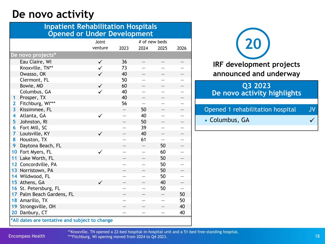 Encompass Health 17 Growth targets, fundamentals and value drivers u 2023 - 2027 Growth targets Ÿ 6 to 10 de novos per year Ÿ 80 to 120 bed additions per year Ÿ 6% to 8% discharge CAGR u Large, under penetrated, and growing inpatient rehabilitation market Ÿ Large addressable market indicated by low conversion rate of presumptively eligible inpatient rehabilitation patients Ÿ Favorable demographics driving increased demand for rehabilitation services u Poised to capture incremental market share Ÿ Unparalleled clinical expertise for treating inpatient rehabilitation conditions with consistent delivery of high-quality, cost-effective care Ÿ De novo and bed addition strategy delivers attractive financial returns Ÿ Cash flow and capital availability to fund capacity additions Ÿ Fragmented sector presents unit acquisition and joint venture opportunities Ÿ Significant barriers to entry and economies of scale Ÿ Resilient business model with focus on non-discretionary conditions occurring predominantly in an aging population u Shareholder distributions Ÿ Cash dividend (currently $0.15 per share per quarter) Ÿ Approximately $198 million remaining under current stock repurchase authorization