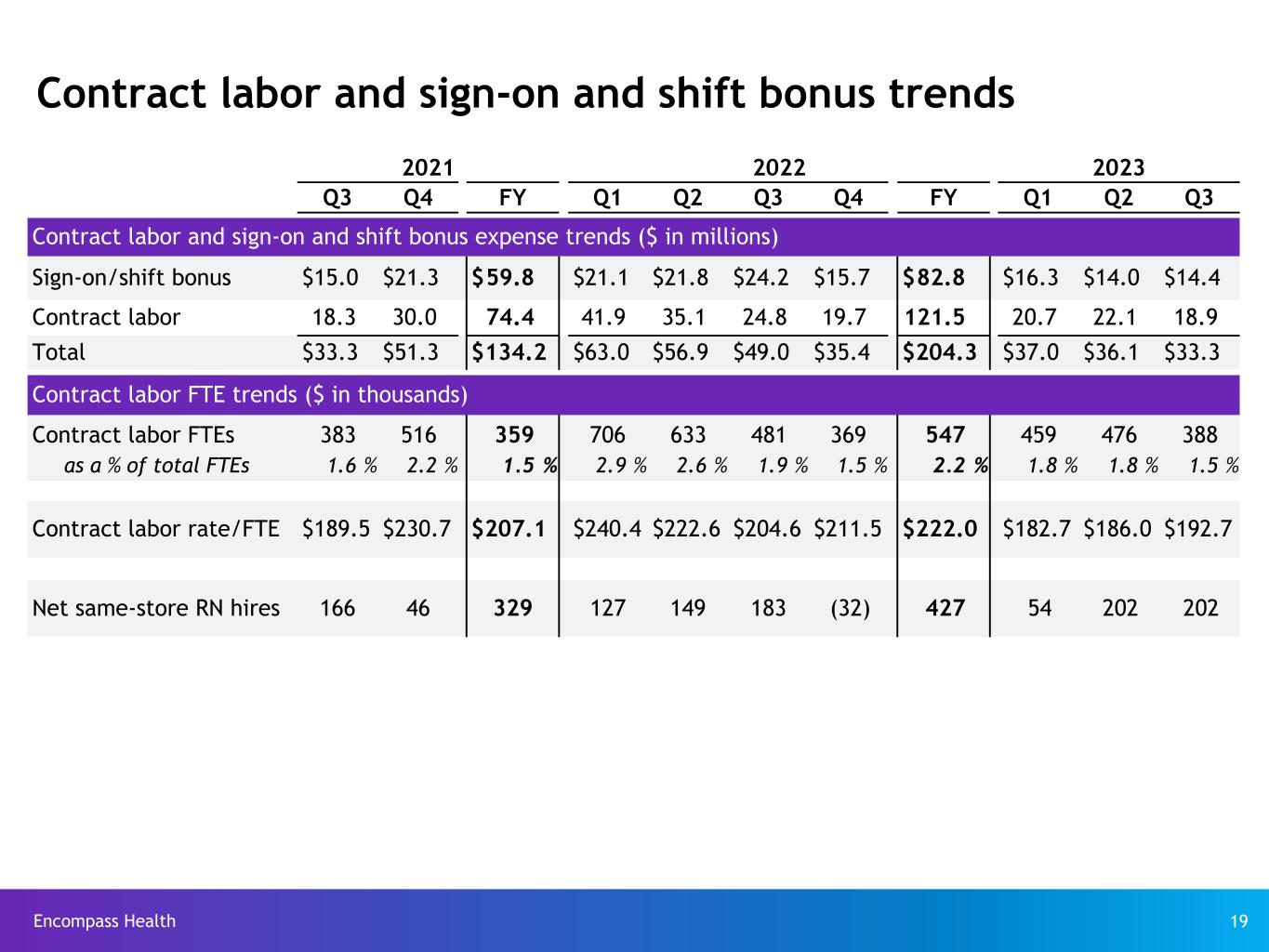Encompass Health 19 Contract labor and sign-on and shift bonus trends 2021 2022 2023 Q3 Q4 FY Q1 Q2 Q3 Q4 FY Q1 Q2 Q3 Contract labor and sign-on and shift bonus expense trends ($ in millions) Sign-on/shift bonus $ 15.0 $ 21.3 $ 59.8 $ 21.1 $ 21.8 $ 24.2 $ 15.7 $ 82.8 $ 16.3 $ 14.0 $ 14.4 Contract labor 18.3 30.0 74.4 41.9 35.1 24.8 19.7 121.5 20.7 22.1 18.9 Total $ 33.3 $ 51.3 $ 134.2 $ 63.0 $ 56.9 $ 49.0 $ 35.4 $ 204.3 $ 37.0 $ 36.1 $ 33.3 Contract labor FTE trends ($ in thousands) Contract labor FTEs 383 516 359 706 633 481 369 547 459 476 388 as a % of total FTEs 1.6 % 2.2 % 1.5 % 2.9 % 2.6 % 1.9 % 1.5 % 2.2 % 1.8 % 1.8 % 1.5 % Contract labor rate/FTE $ 189.5 $ 230.7 $ 207.1 $ 240.4 $ 222.6 $ 204.6 $ 211.5 $ 222.0 $ 182.7 $ 186.0 $ 192.7 Net same-store RN hires 166 46 329 127 149 183 (32) 427 54 202 202