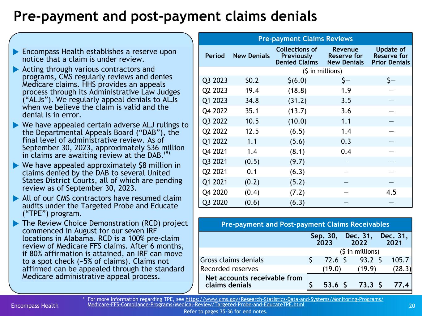Encompass Health 20 Pre-payment and post-payment claims denials Pre-payment Claims Reviews Period New Denials Collections of Previously Denied Claims Revenue Reserve for New Denials Update of Reserve for Prior Denials ($ in millions) Q3 2023 $0.2 $(6.0) $— $— Q2 2023 19.4 (18.8) 1.9 — Q1 2023 34.8 (31.2) 3.5 — Q4 2022 35.1 (13.7) 3.6 — Q3 2022 10.5 (10.0) 1.1 — Q2 2022 12.5 (6.5) 1.4 — Q1 2022 1.1 (5.6) 0.3 — Q4 2021 1.4 (8.1) 0.4 — Q3 2021 (0.5) (9.7) — — Q2 2021 0.1 (6.3) — — Q1 2021 (0.2) (5.2) — — Q4 2020 (0.4) (7.2) — 4.5 Q3 2020 (0.6) (6.3) — — Pre-payment and Post-payment Claims Receivables Sep. 30, 2023 Dec. 31, 2022 Dec. 31, 2021 ($ in millions) Gross claims denials $ 72.6 $ 93.2 $ 105.7 Recorded reserves (19.0) (19.9) (28.3) Net accounts receivable from claims denials $ 53.6 $ 73.3 $ 77.4 * For more information regarding TPE, see https://www.cms.gov/Research-Statistics-Data-and-Systems/Monitoring-Programs/ Medicare-FFS-Compliance-Programs/Medical-Review/Targeted-Probe-and-EducateTPE.html u Encompass Health establishes a reserve upon notice that a claim is under review. u Acting through various contractors and programs, CMS regularly reviews and denies Medicare claims. HHS provides an appeals process through its Administrative Law Judges (“ALJs”). We regularly appeal denials to ALJs when we believe the claim is valid and the denial is in error. u We have appealed certain adverse ALJ rulings to the Departmental Appeals Board (“DAB”), the final level of administrative review. As of September 30, 2023, approximately $36 million in claims are awaiting review at the DAB.(8) u We have appealed approximately $8 million in claims denied by the DAB to several United States District Courts, all of which are pending review as of September 30, 2023. u All of our CMS contractors have resumed claim audits under the Targeted Probe and Educate (“TPE”) program. u The Review Choice Demonstration (RCD) project commenced in August for our seven IRF locations in Alabama. RCD is a 100% pre-claim review of Medicare FFS claims. After 6 months, if 80% affirmation is attained, an IRF can move to a spot check (~5% of claims). Claims not affirmed can be appealed through the standard Medicare administrative appeal process. Refer to pages 35-36 for end notes.
