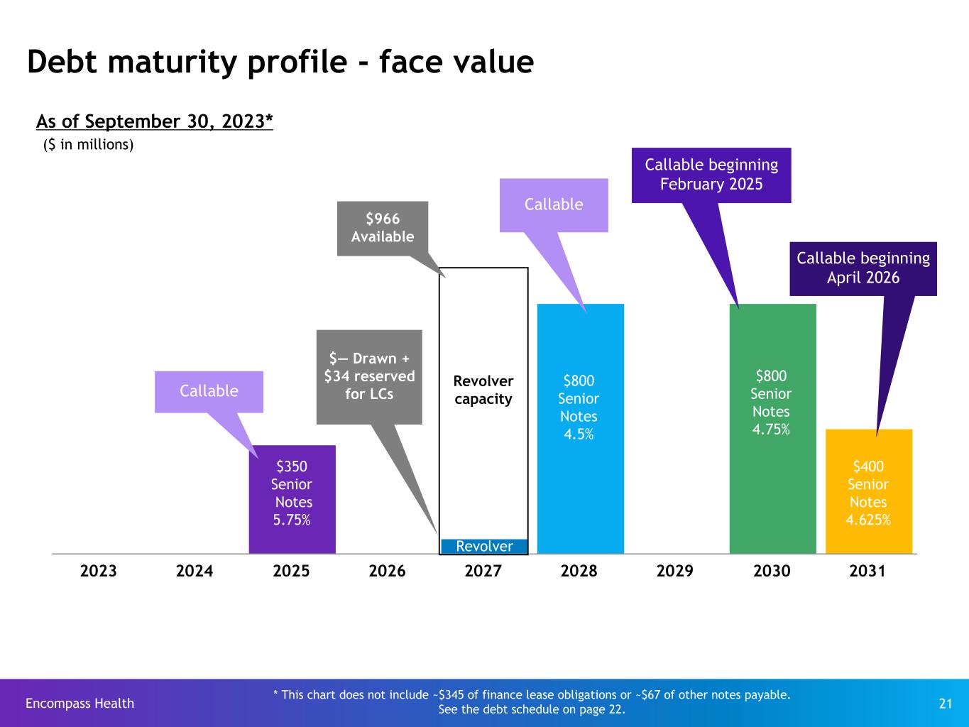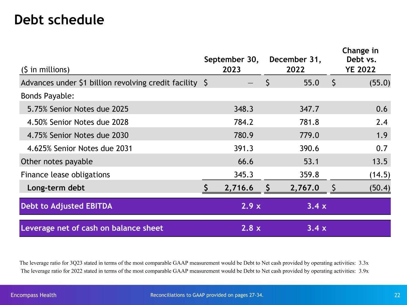 Encompass Health 21 2023 2024 2025 2026 2027 2028 2029 2030 2031 * This chart does not include ~$345 of finance lease obligations or ~$67 of other notes payable. See the debt schedule on page 22. Debt maturity profile - face value $350 Senior Notes 5.75% ($ in millions) Revolver capacity $800 Senior Notes 4.75% $800 Senior Notes 4.5% Revolver As of September 30, 2023* $966 Available $— Drawn + $34 reserved for LCs Callable Callable beginning February 2025 Callable $400 Senior Notes 4.625% Callable beginning April 2026