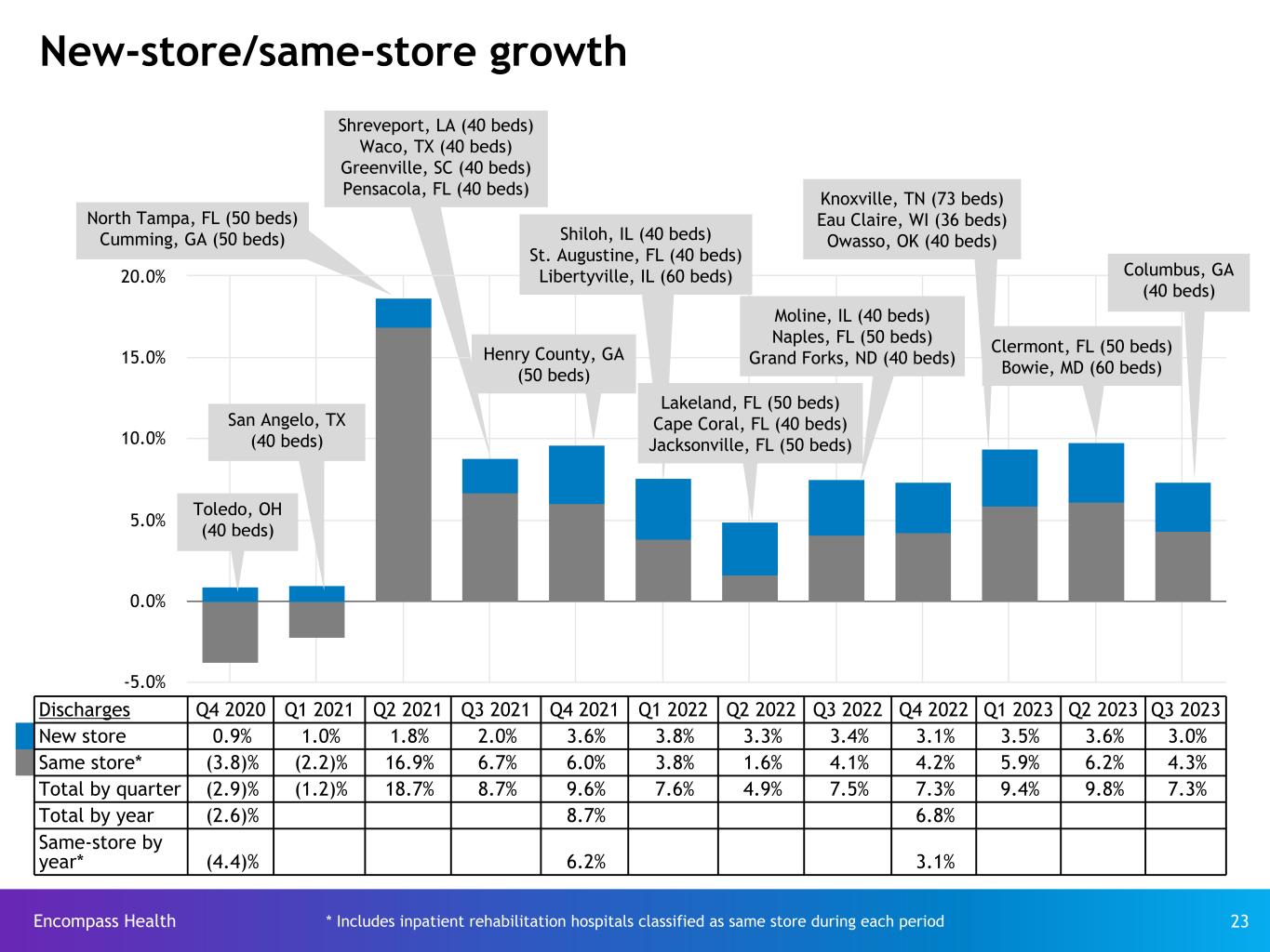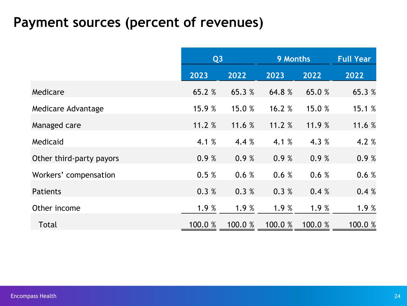 Encompass Health 23 -5.0% 0.0% 5.0% 10.0% 15.0% 20.0% * Includes inpatient rehabilitation hospitals classified as same store during each period New-store/same-store growth North Tampa, FL (50 beds) Cumming, GA (50 beds) Shreveport, LA (40 beds) Waco, TX (40 beds) Greenville, SC (40 beds) Pensacola, FL (40 beds) Discharges Q4 2020 Q1 2021 Q2 2021 Q3 2021 Q4 2021 Q1 2022 Q2 2022 Q3 2022 Q4 2022 Q1 2023 Q2 2023 Q3 2023 New store 0.9% 1.0% 1.8% 2.0% 3.6% 3.8% 3.3% 3.4% 3.1% 3.5% 3.6% 3.0% Same store* (3.8)% (2.2)% 16.9% 6.7% 6.0% 3.8% 1.6% 4.1% 4.2% 5.9% 6.2% 4.3% Total by quarter (2.9)% (1.2)% 18.7% 8.7% 9.6% 7.6% 4.9% 7.5% 7.3% 9.4% 9.8% 7.3% Total by year (2.6)% 8.7% 6.8% Same-store by year* (4.4)% 6.2% 3.1% Toledo, OH (40 beds) San Angelo, TX (40 beds) Shiloh, IL (40 beds) St. Augustine, FL (40 beds) Libertyville, IL (60 beds) Henry County, GA (50 beds) Moline, IL (40 beds) Naples, FL (50 beds) Grand Forks, ND (40 beds) Lakeland, FL (50 beds) Cape Coral, FL (40 beds) Jacksonville, FL (50 beds) Knoxville, TN (73 beds) Eau Claire, WI (36 beds) Owasso, OK (40 beds) Clermont, FL (50 beds) Bowie, MD (60 beds) Columbus, GA (40 beds)