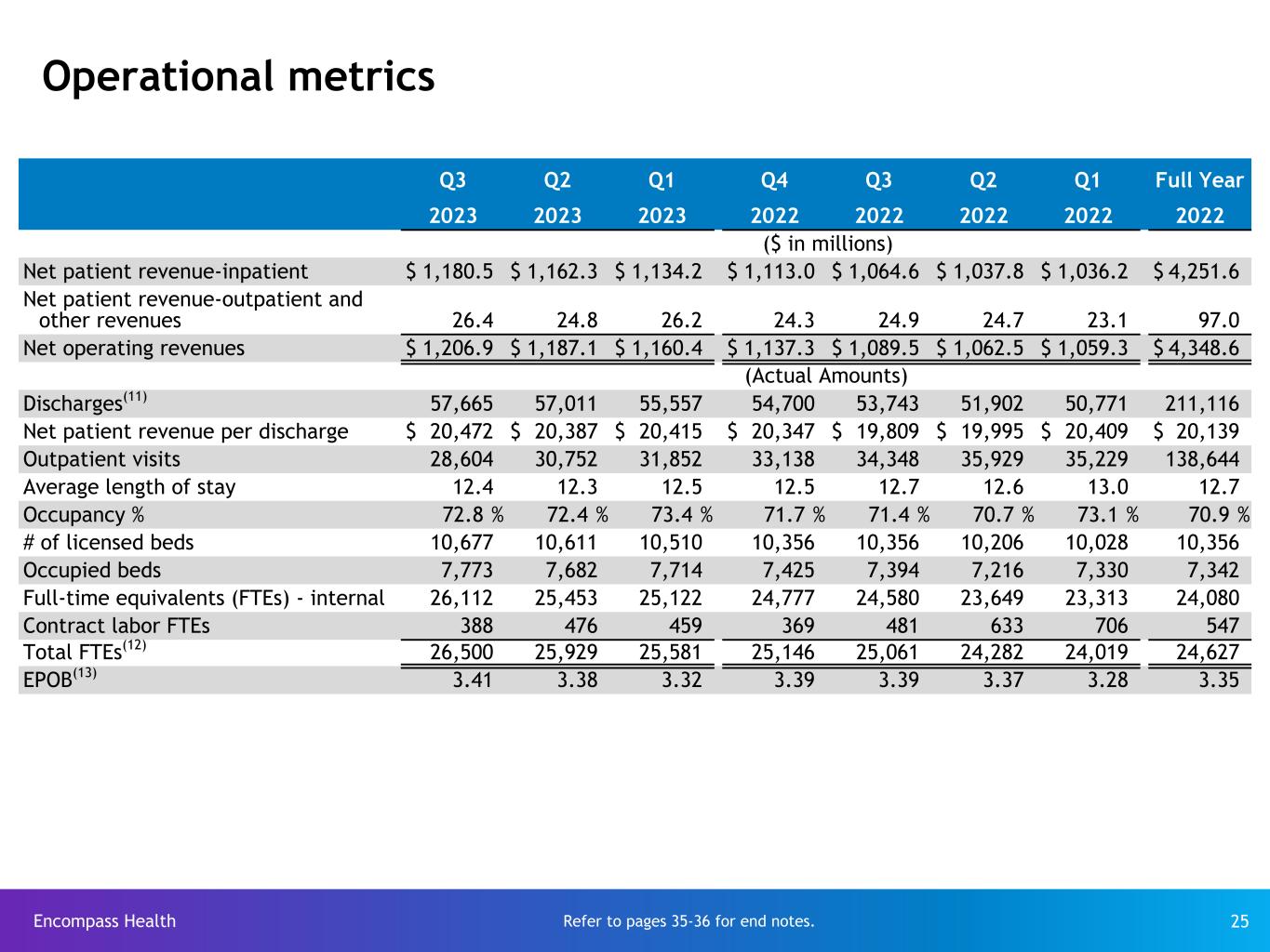 Encompass Health 25 Operational metrics Q3 Q2 Q1 Q4 Q3 Q2 Q1 Full Year 2023 2023 2023 2022 2022 2022 2022 2022 ($ in millions) Net patient revenue-inpatient $ 1,180.5 $ 1,162.3 $ 1,134.2 $ 1,113.0 $ 1,064.6 $ 1,037.8 $ 1,036.2 $ 4,251.6 Net patient revenue-outpatient and other revenues 26.4 24.8 26.2 24.3 24.9 24.7 23.1 97.0 Net operating revenues $ 1,206.9 $ 1,187.1 $ 1,160.4 $ 1,137.3 $ 1,089.5 $ 1,062.5 $ 1,059.3 $ 4,348.6 (Actual Amounts) Discharges(11) 57,665 57,011 55,557 54,700 53,743 51,902 50,771 211,116 Net patient revenue per discharge $ 20,472 $ 20,387 $ 20,415 $ 20,347 $ 19,809 $ 19,995 $ 20,409 $ 20,139 Outpatient visits 28,604 30,752 31,852 33,138 34,348 35,929 35,229 138,644 Average length of stay 12.4 12.3 12.5 12.5 12.7 12.6 13.0 12.7 Occupancy % 72.8 % 72.4 % 73.4 % 71.7 % 71.4 % 70.7 % 73.1 % 70.9 % # of licensed beds 10,677 10,611 10,510 10,356 10,356 10,206 10,028 10,356 Occupied beds 7,773 7,682 7,714 7,425 7,394 7,216 7,330 7,342 Full-time equivalents (FTEs) - internal 26,112 25,453 25,122 24,777 24,580 23,649 23,313 24,080 Contract labor FTEs 388 476 459 369 481 633 706 547 Total FTEs(12) 26,500 25,929 25,581 25,146 25,061 24,282 24,019 24,627 EPOB(13) 3.41 3.38 3.32 3.39 3.39 3.37 3.28 3.35 Refer to pages 35-36 for end notes.