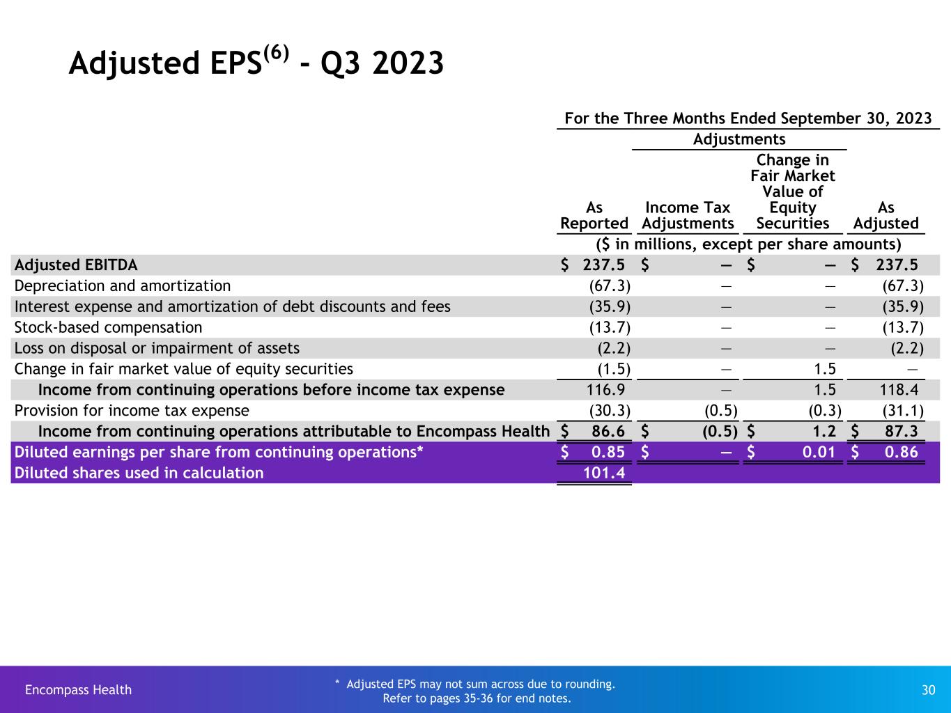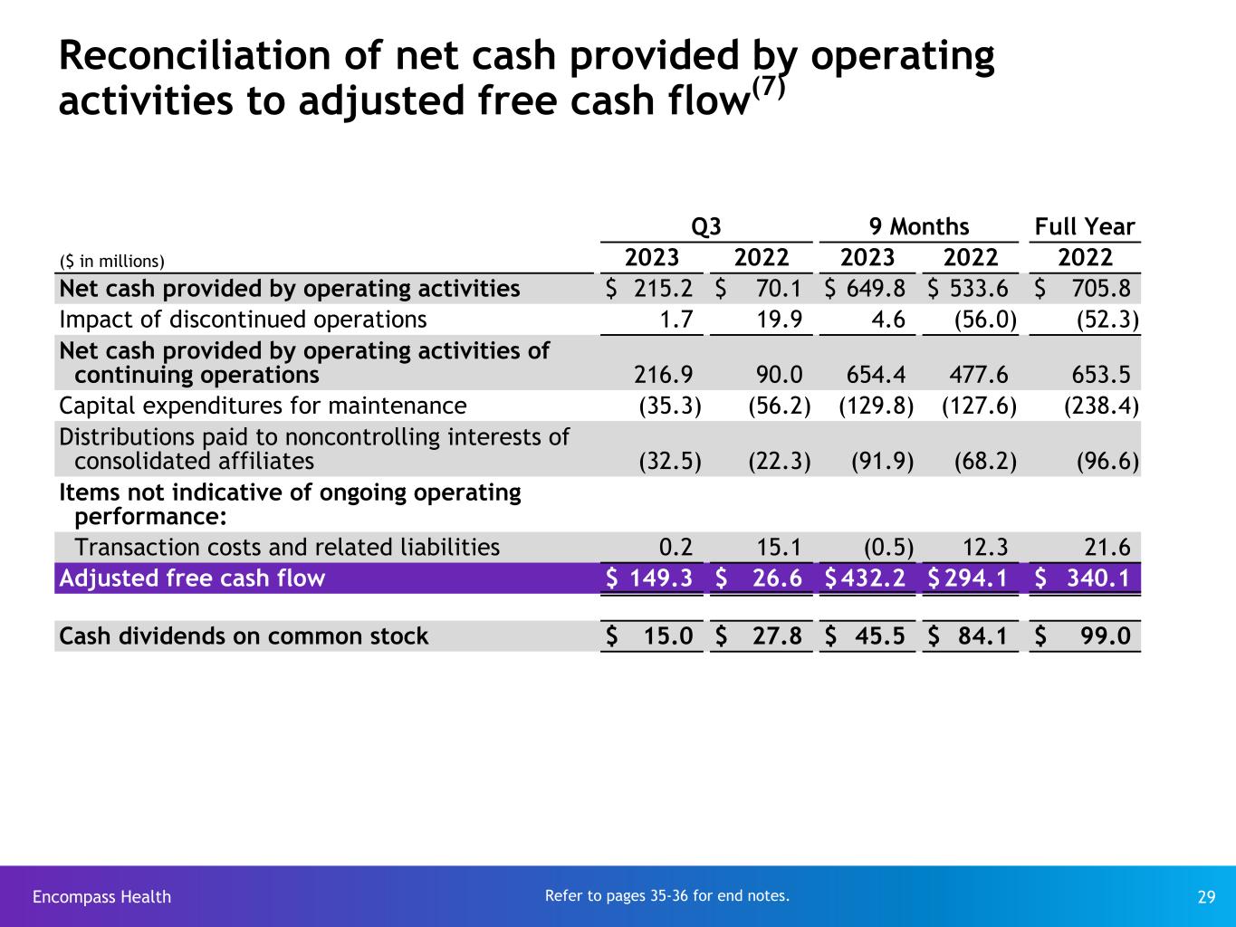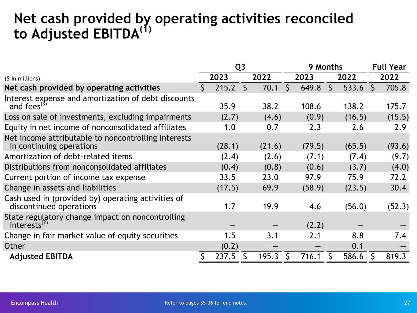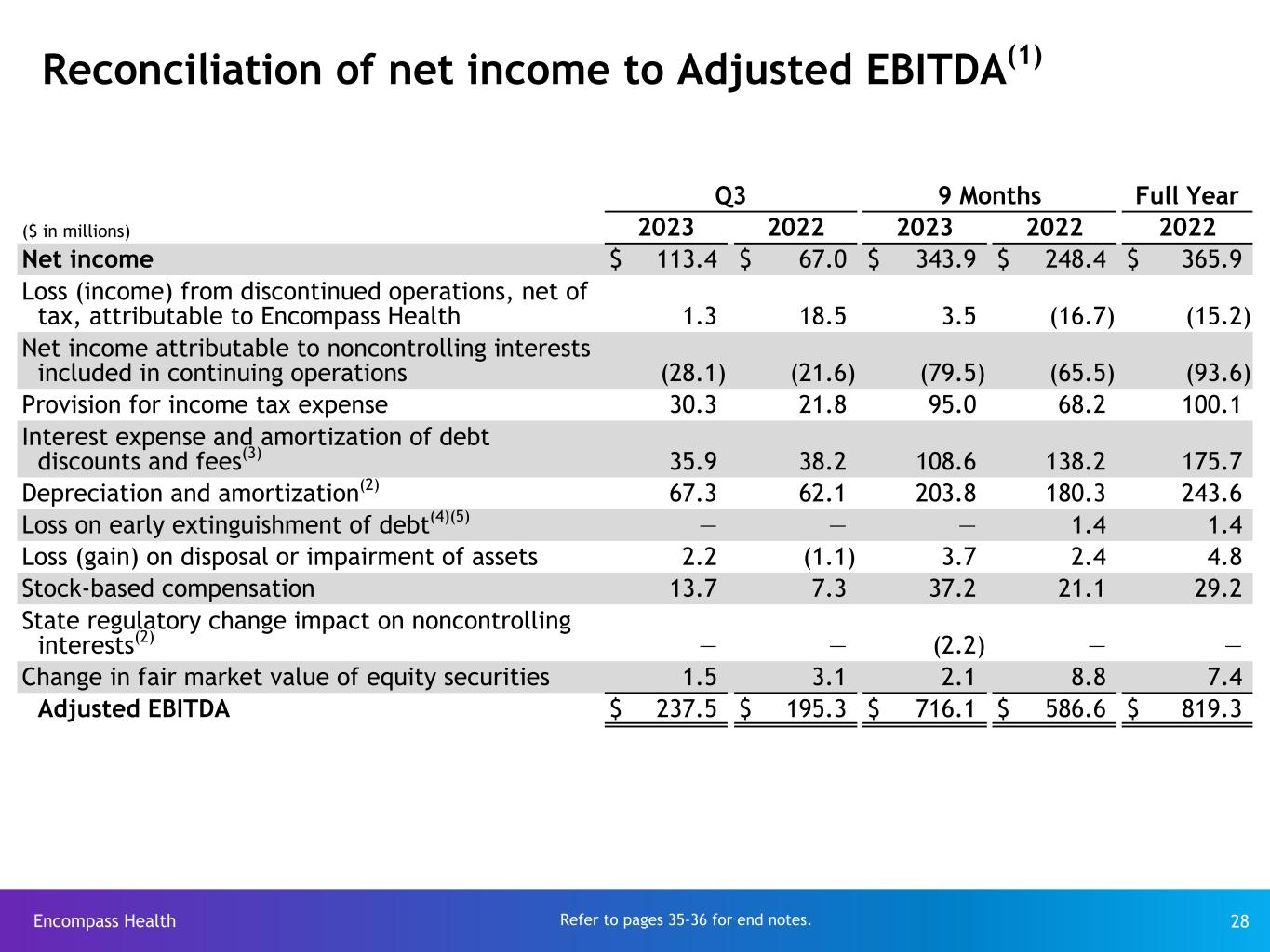 Encompass Health 28 Reconciliation of net income to Adjusted EBITDA(1) Q3 9 Months Full Year ($ in millions) 2023 2022 2023 2022 2022 Net income $ 113.4 $ 67.0 $ 343.9 $ 248.4 $ 365.9 Loss (income) from discontinued operations, net of tax, attributable to Encompass Health 1.3 18.5 3.5 (16.7) (15.2) Net income attributable to noncontrolling interests included in continuing operations (28.1) (21.6) (79.5) (65.5) (93.6) Provision for income tax expense 30.3 21.8 95.0 68.2 100.1 Interest expense and amortization of debt discounts and fees(3) 35.9 38.2 108.6 138.2 175.7 Depreciation and amortization(2) 67.3 62.1 203.8 180.3 243.6 Loss on early extinguishment of debt(4)(5) — — — 1.4 1.4 Loss (gain) on disposal or impairment of assets 2.2 (1.1) 3.7 2.4 4.8 Stock-based compensation 13.7 7.3 37.2 21.1 29.2 State regulatory change impact on noncontrolling interests(2) — — (2.2) — — Change in fair market value of equity securities 1.5 3.1 2.1 8.8 7.4 Adjusted EBITDA $ 237.5 $ 195.3 $ 716.1 $ 586.6 $ 819.3 Refer to pages 35-36 for end notes.