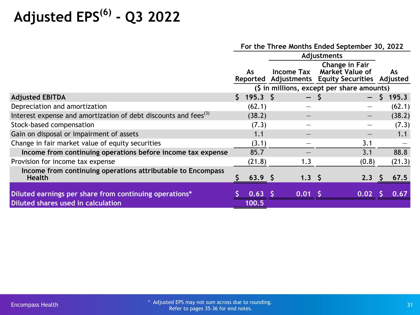 Encompass Health 30 Adjusted EPS(6) - Q3 2023 For the Three Months Ended September 30, 2023 Adjustments As Reported Income Tax Adjustments Change in Fair Market Value of Equity Securities As Adjusted ($ in millions, except per share amounts) Adjusted EBITDA $ 237.5 $ — $ — $ 237.5 Depreciation and amortization (67.3) — — (67.3) Interest expense and amortization of debt discounts and fees (35.9) — — (35.9) Stock-based compensation (13.7) — — (13.7) Loss on disposal or impairment of assets (2.2) — — (2.2) Change in fair market value of equity securities (1.5) — 1.5 — Income from continuing operations before income tax expense 116.9 — 1.5 118.4 Provision for income tax expense (30.3) (0.5) (0.3) (31.1) Income from continuing operations attributable to Encompass Health $ 86.6 $ (0.5) $ 1.2 $ 87.3 Diluted earnings per share from continuing operations* $ 0.85 $ — $ 0.01 $ 0.86 Diluted shares used in calculation 101.4 * Adjusted EPS may not sum across due to rounding. Refer to pages 35-36 for end notes.