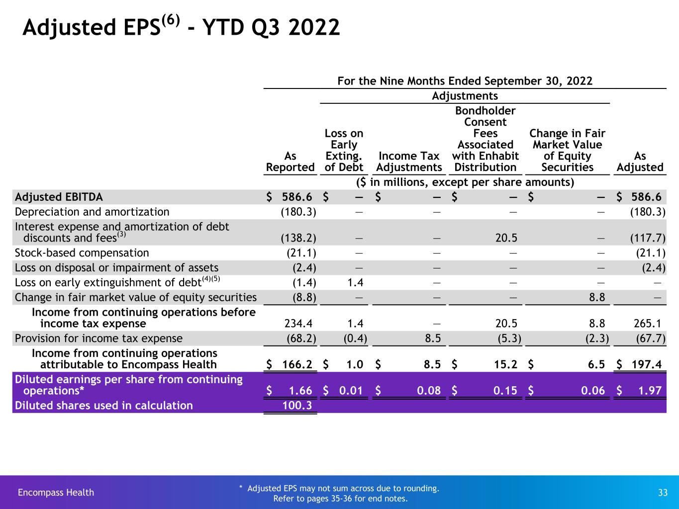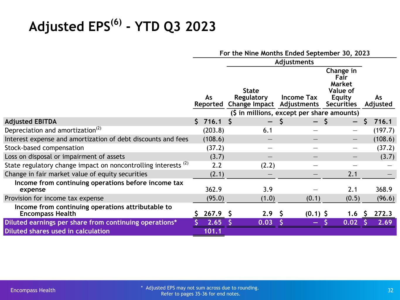 Encompass Health 31 For the Three Months Ended September 30, 2022 Adjustments As Reported Income Tax Adjustments Change in Fair Market Value of Equity Securities As Adjusted ($ in millions, except per share amounts) Adjusted EBITDA $ 195.3 $ — $ — $ 195.3 Depreciation and amortization (62.1) — — (62.1) Interest expense and amortization of debt discounts and fees(3) (38.2) — — (38.2) Stock-based compensation (7.3) — — (7.3) Gain on disposal or impairment of assets 1.1 — — 1.1 Change in fair market value of equity securities (3.1) — 3.1 — Income from continuing operations before income tax expense 85.7 — 3.1 88.8 Provision for income tax expense (21.8) 1.3 (0.8) (21.3) Income from continuing operations attributable to Encompass Health $ 63.9 $ 1.3 $ 2.3 $ 67.5 Diluted earnings per share from continuing operations* $ 0.63 $ 0.01 $ 0.02 $ 0.67 Diluted shares used in calculation 100.5 Adjusted EPS(6) - Q3 2022 * Adjusted EPS may not sum across due to rounding. Refer to pages 35-36 for end notes.