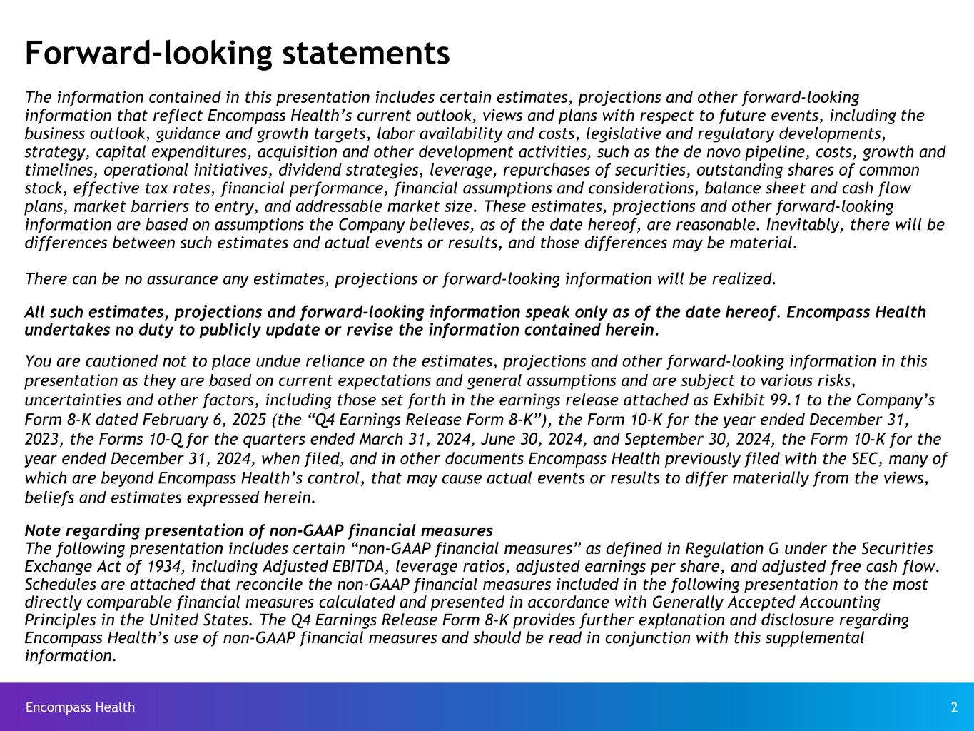 2025年2月6日、エンコンパス・ヘルス・コーポレーション(以下「エンコンパス・ヘルス」または「当社」)は、2024年12月31日に終了した3カ月間および1年間の当社の財務結果を報告するプレスリリースを発表した。このプレスリリースのコピーは別紙99.1として本レポートに添付され、参照することにより本レポートに組み込まれる。