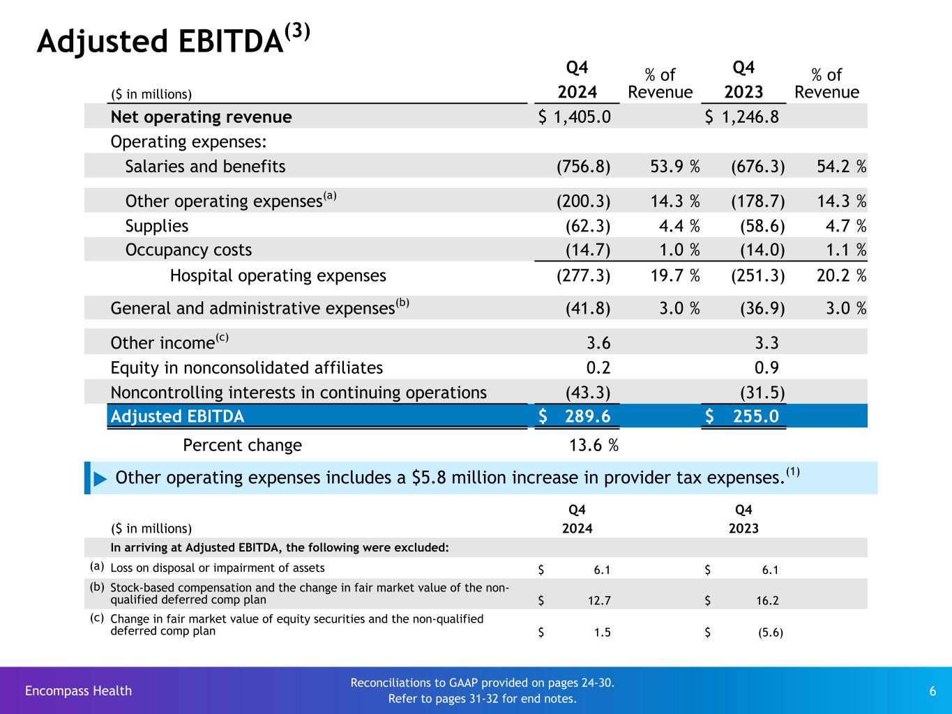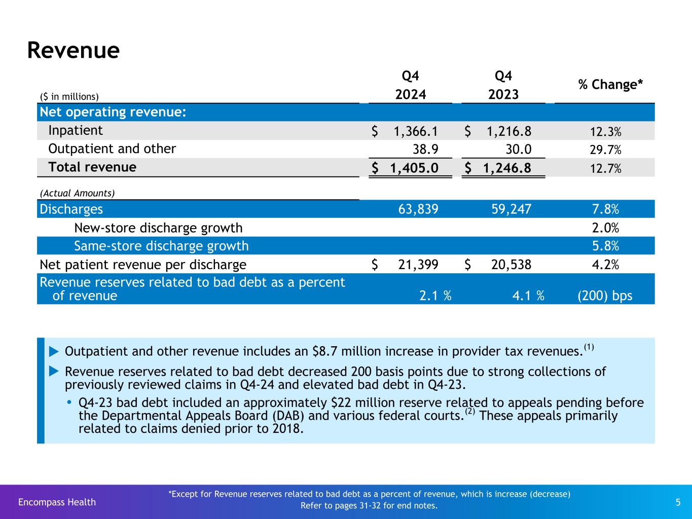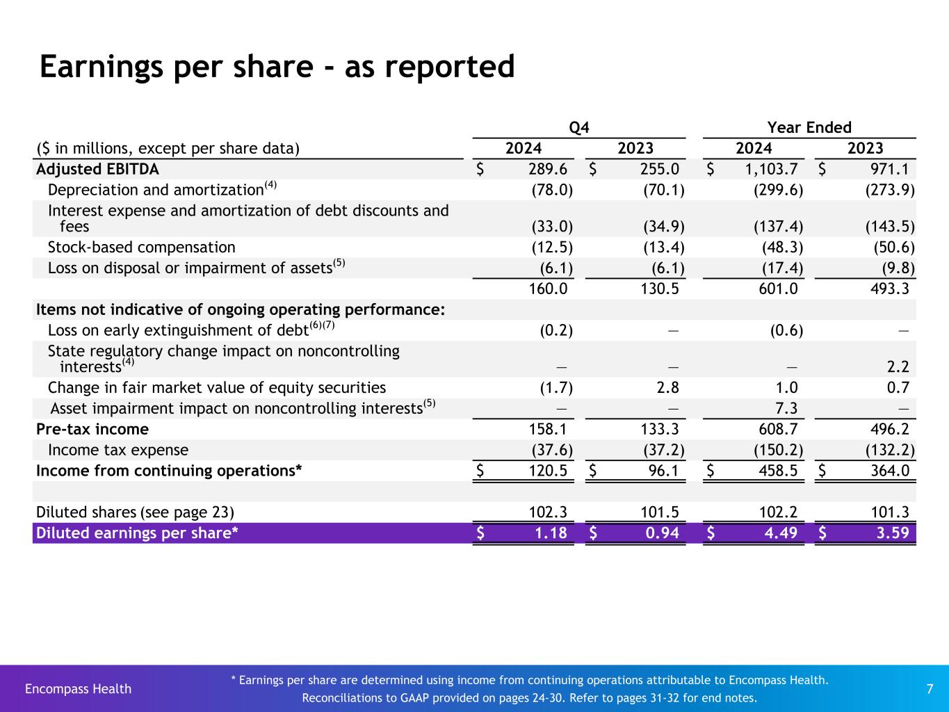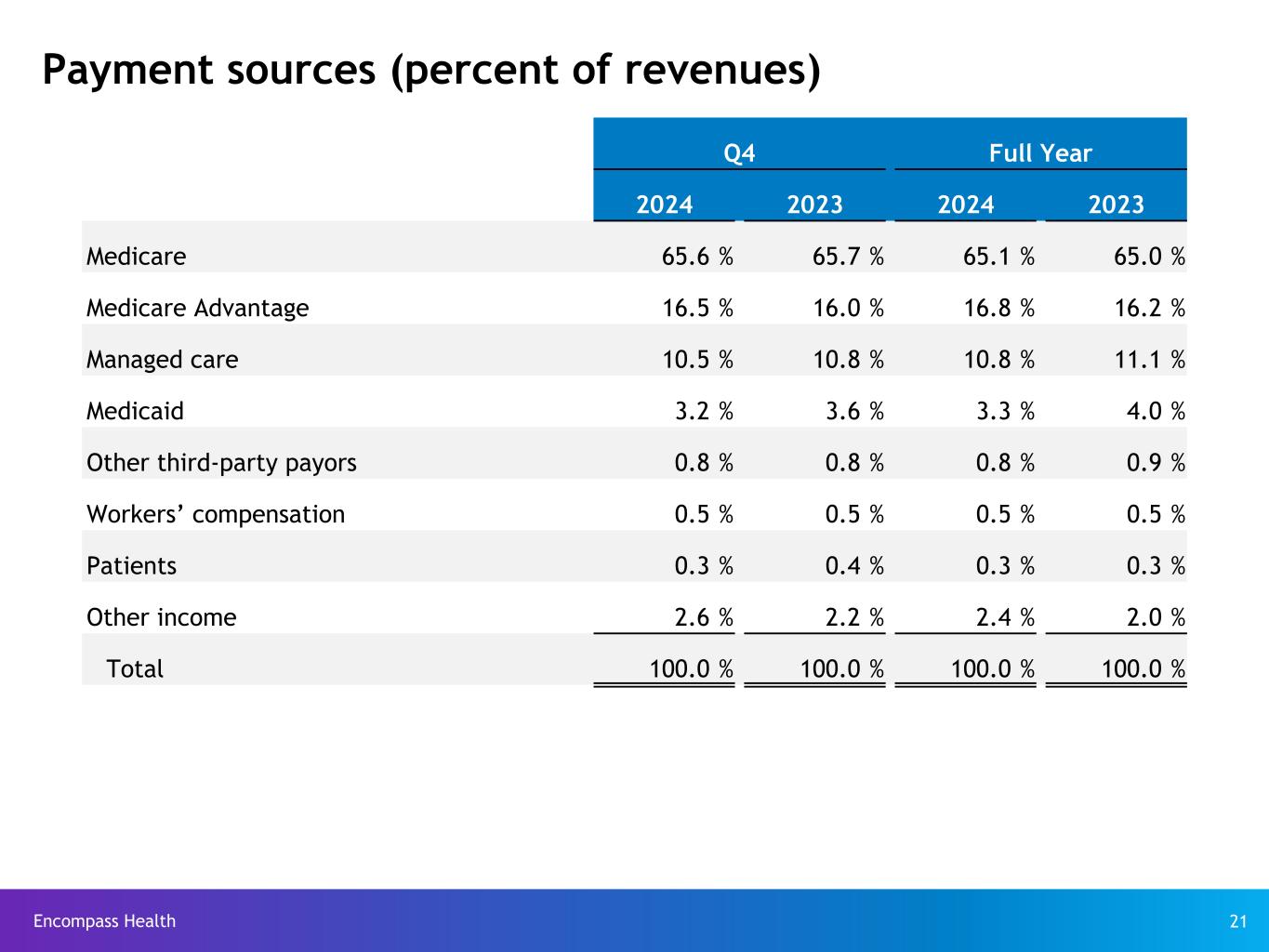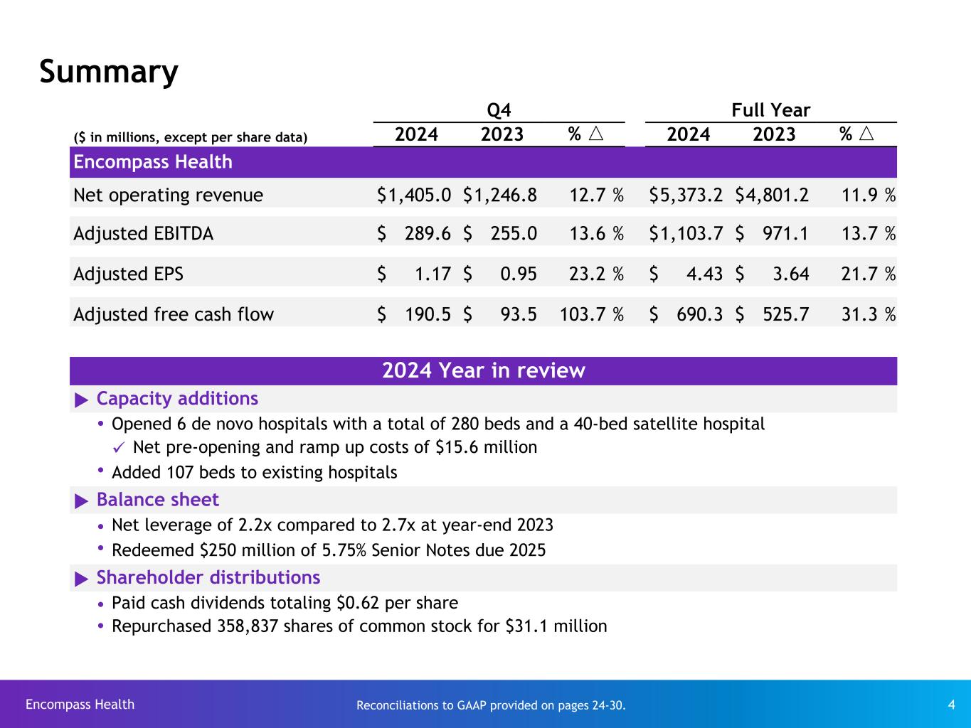 アラバマ州バーミンガム - 米国最大の入院リハビリテーション病院の所有・運営会社であるエンコンパス・ヘルス・コーポレーション(NYSE: EHC)は本日、2024年12月31日を期末とする第4四半期の業績を発表した。