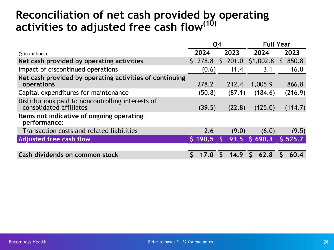 当社はまた、調整後フリー・キャッシュ・フローを業績評価の分析指標として使用している。経営陣は、調整後フリー・キャッシュ・フローを表示することで、投資家が当社の負債削減能力、開発活動推進能力、普通株主への資本還元能力を評価するための効率的な手段を提供できると考えている。調整後フリー・キャッシュ・フローの計算、および営業活動から得た純現金と調整後フリー・キャッシュ・フローとの調整は、別紙99.1記載のプレス・リリースおよび別紙99.2記載の補足情報に記載されています。この指標はGAAPで定義された財務業績の指標ではなく、営業活動から得た純キャッシュの代替指標とみなされるべきではありません。当社の調整フリー・キャッシュ・フローの定義は、継続事業の営業活動によるキャッシュ・フローから、メンテナンスのための資本支出、非支配持分への分配、および継続的な営業業績を示唆しないとみなされる特定の項目を差し引いたものです。普通株式配当金は調整後フリー・キャッシュ・フローの計算には含まれない。調整後フリー・キャッシュ・フローの定義は限定的であり、裁量的支出に利用可能な残余キャッシュ・フローを表すものではありません。この指標はGAAPに準拠して決定されたものではなく、様々な計算の影響を受けやすいため、他社が提示する同様のタイトルを持つ指標と比較できない可能性があります。営業活動、投資活動、財務活動によるキャッシュ・フローのGAAP指標については、2024年版Form 10-K(提出時)および別紙99.1として添付されたプレス・リリースに含まれる連結キャッシュ・フロー計算書をご参照ください。