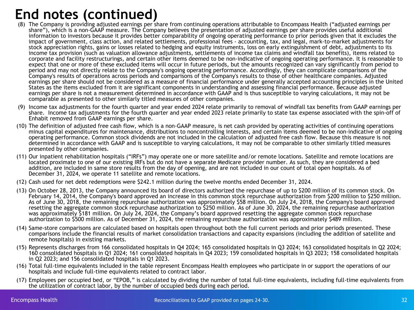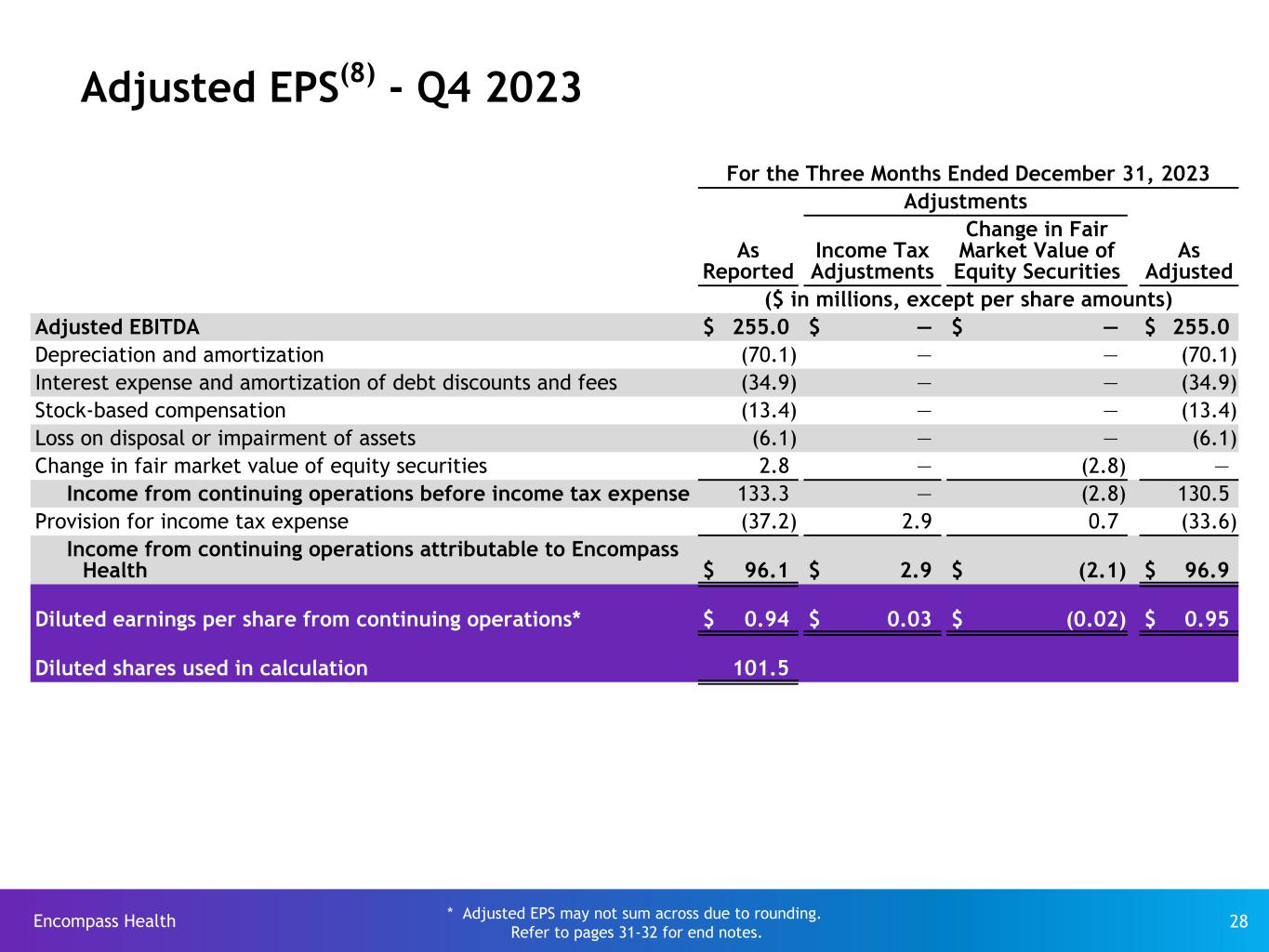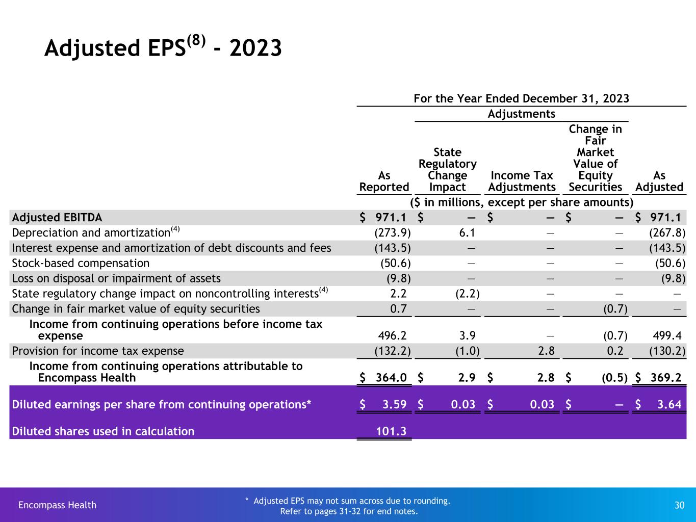 当社は、エンコンパス・ヘルスに帰属する継続事業の調整後1株当たり利益(以下「調整後1株当たり利益」)を提供している。調整後1株当たり利益は、政府、集団代表訴訟および関連する和解の影響、会計、税務、法務などの専門家報酬、新株予約権の時価評価調整、ヘッジおよび持分金融商品に関連する損益、債務の早期償却損失、継続事業からの調整後1株当たり利益(以下「調整後1株当たり利益」)を除外しているため、継続事業の業績を過年度と比較しやすく、投資家にとって有益な追加情報を提供すると当社は考えています;ヘッジおよび資本性金融商品に関連する利益または損失、債務の早期償却による損失、法人所得税引当金の調整(評価性引当金の調整および法人所得税請求の和解など)、企業再編および施設再編に関連する項目、および当社が継続的な経営成績を示唆しないと考えるその他の項目。これらの除外項目の1つまたは複数が将来の期間に発生すると予想することは合理的ですが、認識される金額は期間によって大きく変動する可能性があり、当社の継続的な経営成績に直接関連しない可能性があります。従って、これらの項目は、期をまたがる当社の経営成績の比較や、他のヘルスケア企業との比較を複雑にする可能性があります。調整後1株当たり利益は、米国で一般に公正妥当と認められた会計原則(GAAP)に基づく財務業績の指標として考慮されるべきではありません。調整後1株当たり利益は、GAAPに準拠して決定された測定値ではなく、従って様々な計算の影響を受けやすいため、他社の同様の標題が付された指標と表示上は比較できない可能性があります。当社は、別紙99.1記載のプレスリリースおよび別紙99.2記載の補足情報において、調整後1株当たり利益を1株当たり利益と調整している。