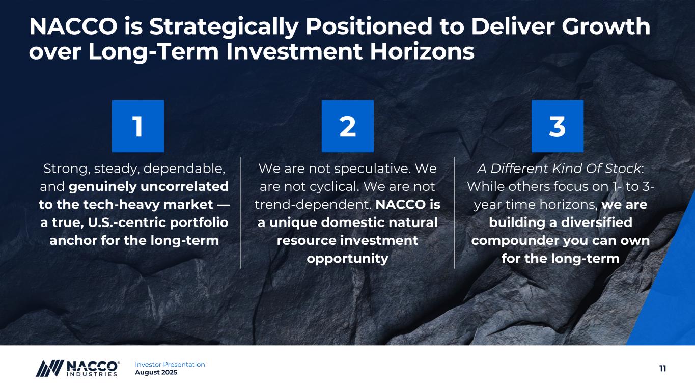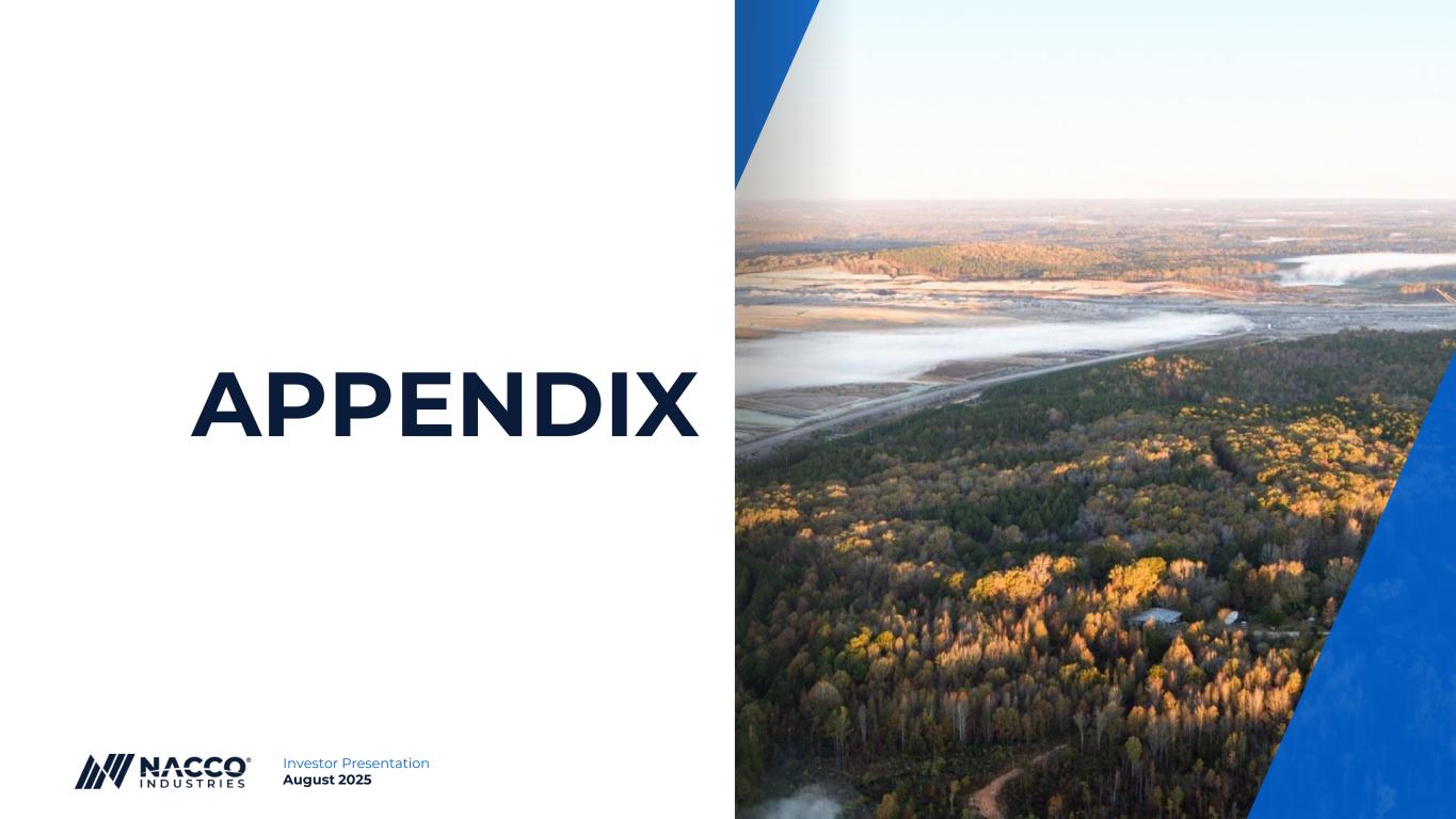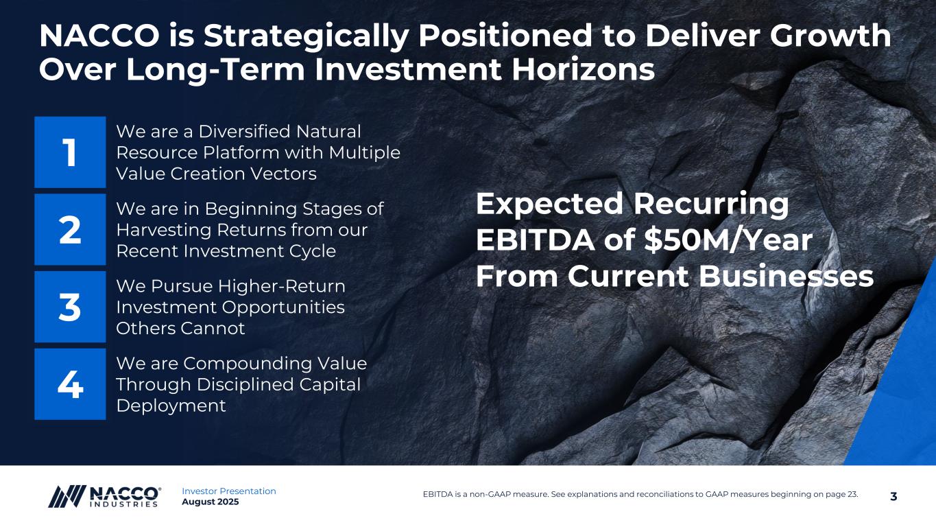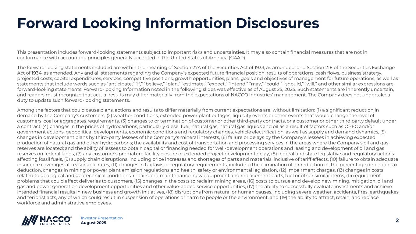 2Investor Presentation August 2025 Forward Looking Information Disclosures This presentation includes forward-looking statements subject to important risks and uncertainties. It may also contain financial measures that are not in conformance with accounting principles generally accepted in the United States of America (GAAP). The forward-looking statements included are within the meaning of Section 27A of the Securities Act of 1933, as amended, and Section 21E of the Securities Exchange Act of 1934, as amended. Any and all statements regarding the Company’s expected future financial position, results of operations, cash flows, business strategy, projected costs, capital expenditures, services, competitive positions, growth opportunities, plans, goals and objectives of management for future operations, as well as statements that include words such as “anticipate,” “if,” “believe,” “plan,” “estimate,” “expect,” “intend,” “may,” “could,” “should,” “will,” and other similar expressions are forward-looking statements. Forward-looking Information noted in the following slides was effective as of August 25, 2025. Such statements are inherently uncertain, and readers must recognize that actual results may differ materially from the expectations of NACCO Industries’ management. The Company does not undertake a duty to update such forward-looking statements. Among the factors that could cause plans, actions and results to differ materially from current expectations are, without limitation: (1) a significant reduction in demand by the Company's customers, (2) weather conditions, extended power plant outages, liquidity events or other events that would change the level of customers' coal or aggregates requirements, (3) changes to or termination of customer or other third-party contracts, or a customer or other third party default under a contract, (4) changes in the prices of hydrocarbons, particularly diesel fuel, natural gas, natural gas liquids and oil as a result of factors such as OPEC and/or government actions, geopolitical developments, economic conditions and regulatory changes, vehicle electrification, as well as supply and demand dynamics, (5) changes in development plans by third-party lessees of the Company's mineral interests, (6) failure or delays by the Company's lessees in achieving expected production of natural gas and other hydrocarbons; the availability and cost of transportation and processing services in the areas where the Company's oil and gas reserves are located; and the ability of lessees to obtain capital or financing needed for well-development operations and leasing and development of oil and gas reserves on federal lands, (7) any customer's premature facility closure or extended project development delay, (8) federal and state legislative and regulatory actions affecting fossil fuels, (9) supply chain disruptions, including price increases and shortages of parts and materials, inclusive of tariff effects, (10) failure to obtain adequate insurance coverages at reasonable rates, (11) changes in tax laws or regulatory requirements, including the elimination of, or reduction in, the percentage depletion tax deduction, changes in mining or power plant emission regulations and health, safety or environmental legislation, (12) impairment charges, (13) changes in costs related to geological and geotechnical conditions, repairs and maintenance, new equipment and replacement parts, fuel or other similar items, (14) equipment problems that could affect deliveries to customers, (15) changes in the costs to reclaim mining areas, (16) costs to pursue and develop new mining, mitigation, oil and gas and power generation development opportunities and other value-added service opportunities, (17) the ability to successfully evaluate investments and achieve intended financial results in new business and growth initiatives, (18) disruptions from natural or human causes, including severe weather, accidents, fires, earthquakes and terrorist acts, any of which could result in suspension of operations or harm to people or the environment, and (19) the ability to attract, retain, and replace workforce and administrative employees.