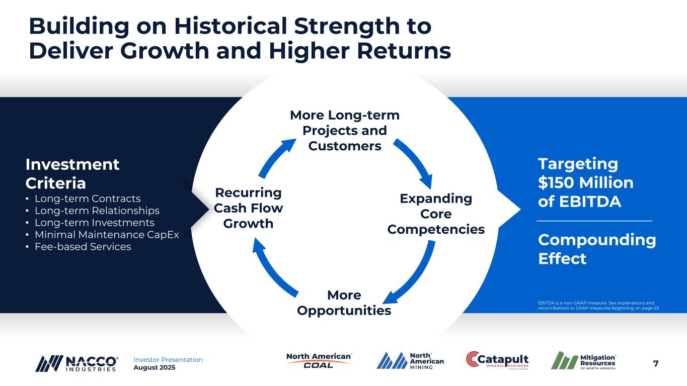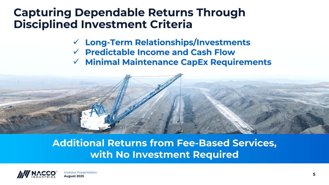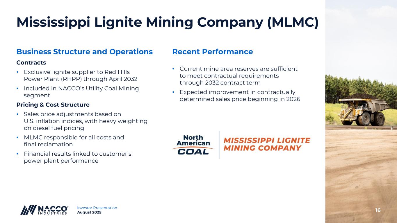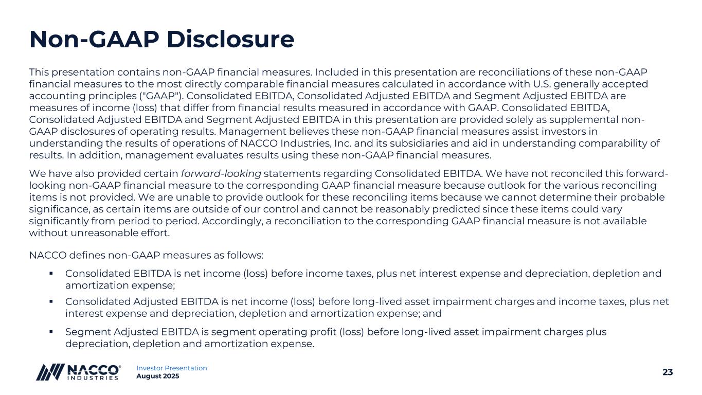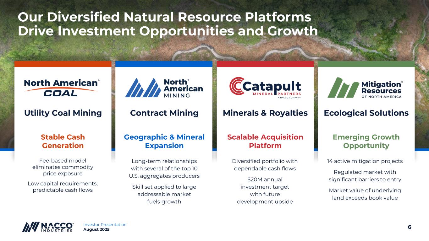 2Investor Presentation August 2025 Forward Looking Information Disclosures This presentation includes forward-looking statements subject to important risks and uncertainties. It may also contain financial measures that are not in conformance with accounting principles generally accepted in the United States of America (GAAP). The forward-looking statements included are within the meaning of Section 27A of the Securities Act of 1933, as amended, and Section 21E of the Securities Exchange Act of 1934, as amended. Any and all statements regarding the Company’s expected future financial position, results of operations, cash flows, business strategy, projected costs, capital expenditures, services, competitive positions, growth opportunities, plans, goals and objectives of management for future operations, as well as statements that include words such as “anticipate,” “if,” “believe,” “plan,” “estimate,” “expect,” “intend,” “may,” “could,” “should,” “will,” and other similar expressions are forward-looking statements. Forward-looking Information noted in the following slides was effective as of August 25, 2025. Such statements are inherently uncertain, and readers must recognize that actual results may differ materially from the expectations of NACCO Industries’ management. The Company does not undertake a duty to update such forward-looking statements. Among the factors that could cause plans, actions and results to differ materially from current expectations are, without limitation: (1) a significant reduction in demand by the Company's customers, (2) weather conditions, extended power plant outages, liquidity events or other events that would change the level of customers' coal or aggregates requirements, (3) changes to or termination of customer or other third-party contracts, or a customer or other third party default under a contract, (4) changes in the prices of hydrocarbons, particularly diesel fuel, natural gas, natural gas liquids and oil as a result of factors such as OPEC and/or government actions, geopolitical developments, economic conditions and regulatory changes, vehicle electrification, as well as supply and demand dynamics, (5) changes in development plans by third-party lessees of the Company's mineral interests, (6) failure or delays by the Company's lessees in achieving expected production of natural gas and other hydrocarbons; the availability and cost of transportation and processing services in the areas where the Company's oil and gas reserves are located; and the ability of lessees to obtain capital or financing needed for well-development operations and leasing and development of oil and gas reserves on federal lands, (7) any customer's premature facility closure or extended project development delay, (8) federal and state legislative and regulatory actions affecting fossil fuels, (9) supply chain disruptions, including price increases and shortages of parts and materials, inclusive of tariff effects, (10) failure to obtain adequate insurance coverages at reasonable rates, (11) changes in tax laws or regulatory requirements, including the elimination of, or reduction in, the percentage depletion tax deduction, changes in mining or power plant emission regulations and health, safety or environmental legislation, (12) impairment charges, (13) changes in costs related to geological and geotechnical conditions, repairs and maintenance, new equipment and replacement parts, fuel or other similar items, (14) equipment problems that could affect deliveries to customers, (15) changes in the costs to reclaim mining areas, (16) costs to pursue and develop new mining, mitigation, oil and gas and power generation development opportunities and other value-added service opportunities, (17) the ability to successfully evaluate investments and achieve intended financial results in new business and growth initiatives, (18) disruptions from natural or human causes, including severe weather, accidents, fires, earthquakes and terrorist acts, any of which could result in suspension of operations or harm to people or the environment, and (19) the ability to attract, retain, and replace workforce and administrative employees.