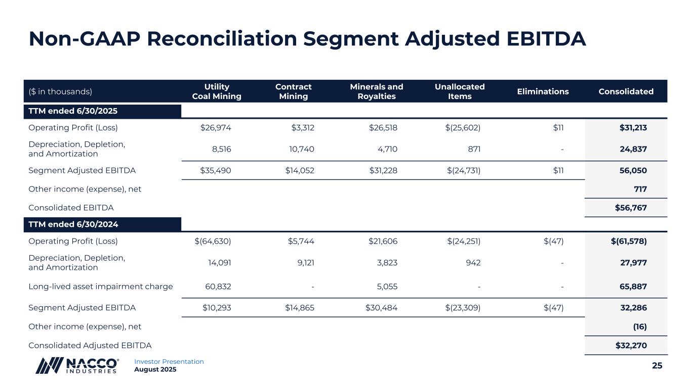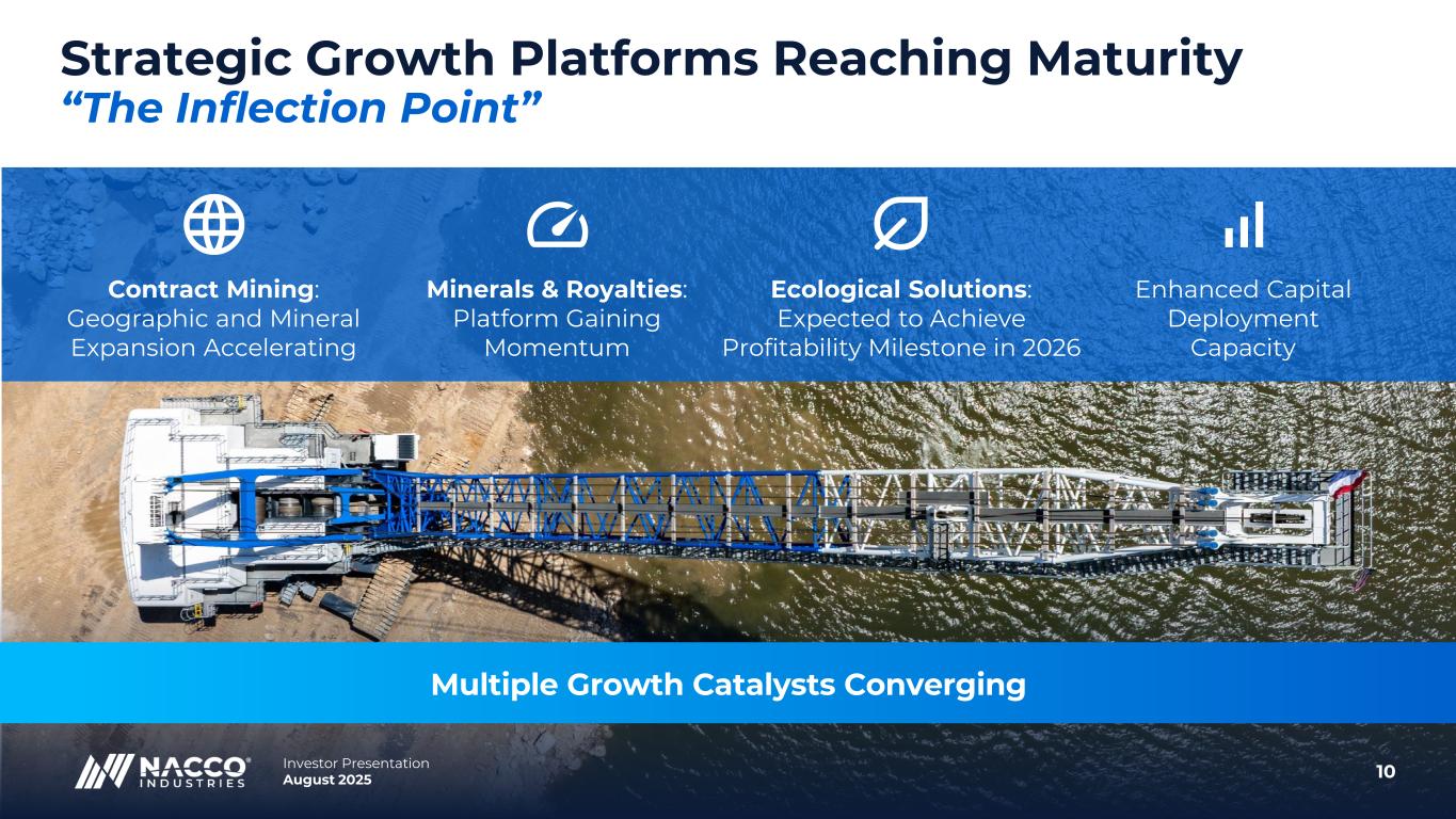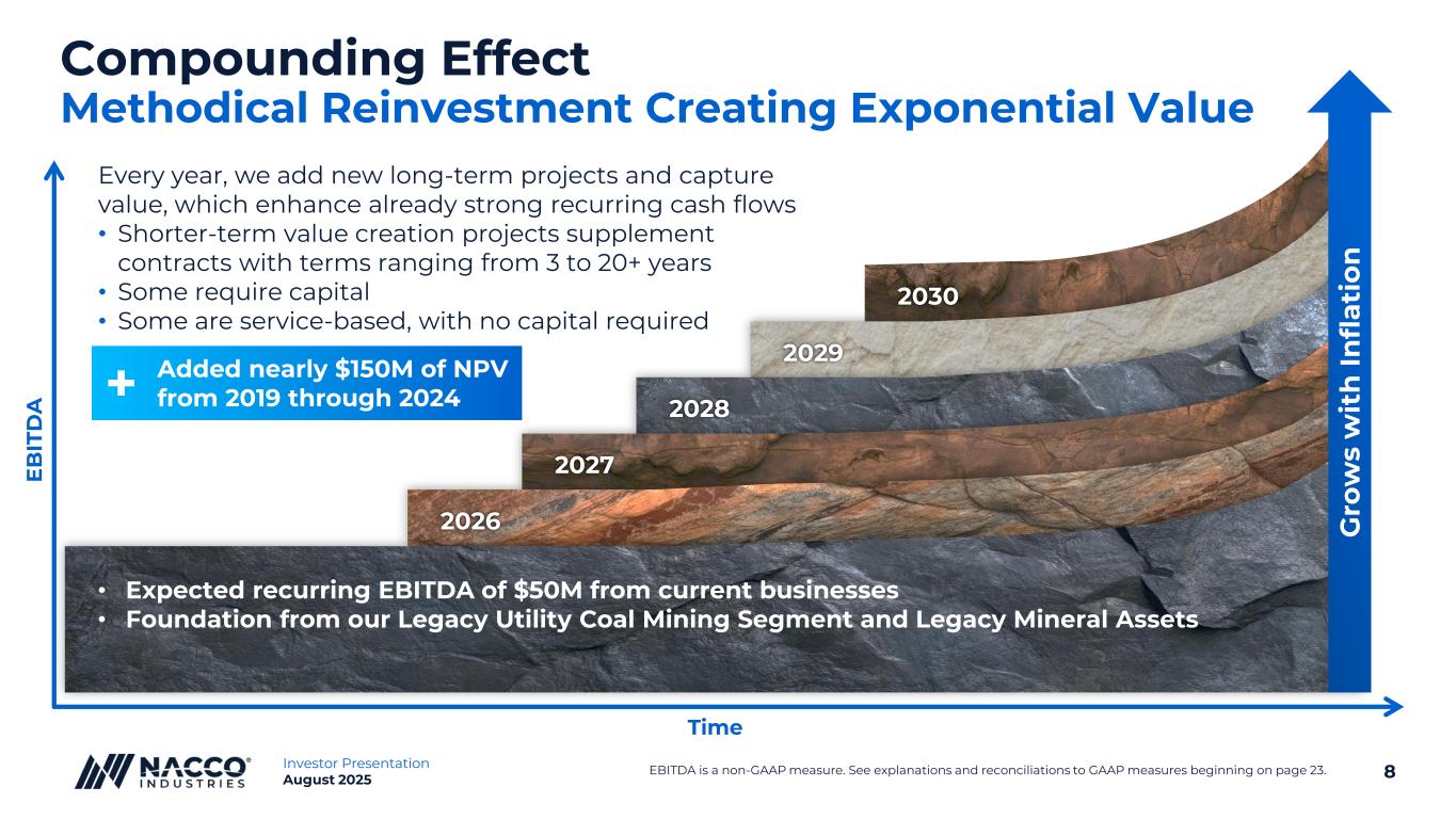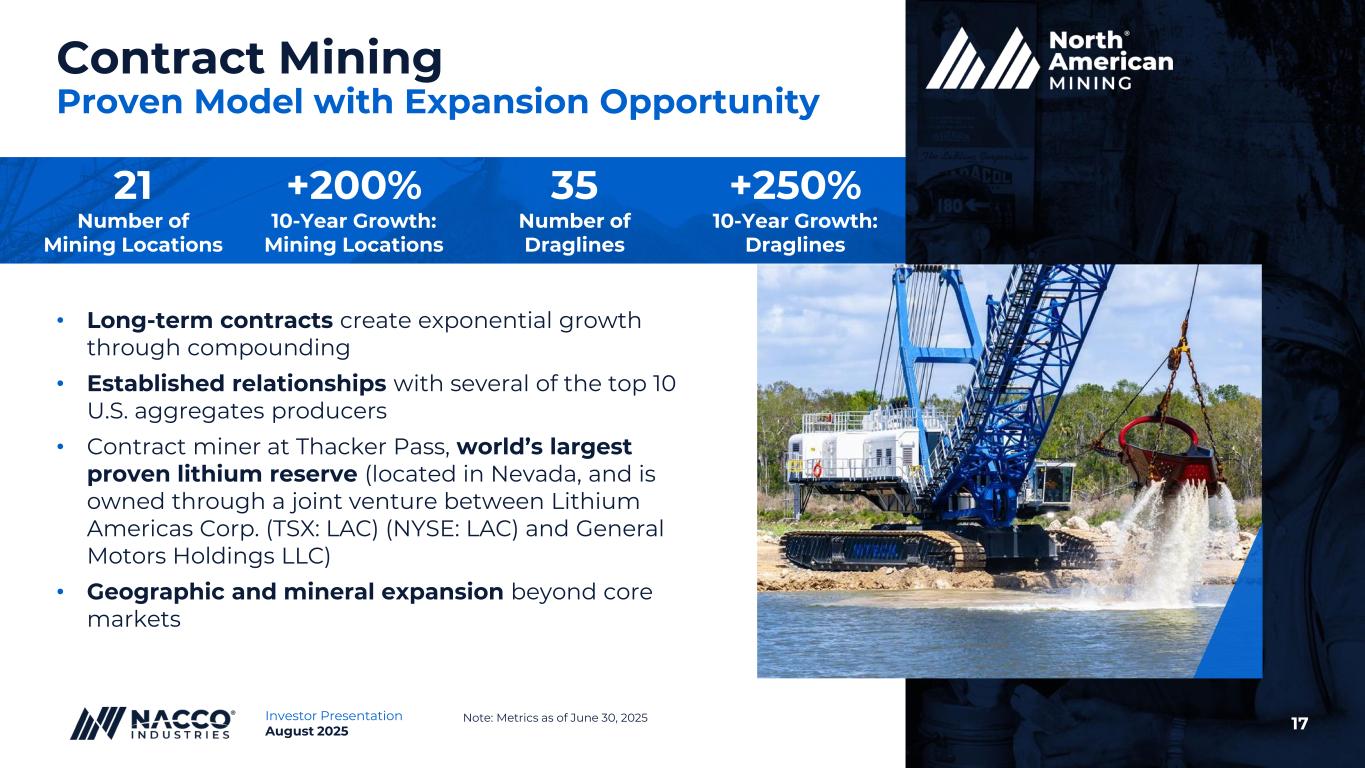 2Investor Presentation August 2025 Forward Looking Information Disclosures This presentation includes forward-looking statements subject to important risks and uncertainties. It may also contain financial measures that are not in conformance with accounting principles generally accepted in the United States of America (GAAP). The forward-looking statements included are within the meaning of Section 27A of the Securities Act of 1933, as amended, and Section 21E of the Securities Exchange Act of 1934, as amended. Any and all statements regarding the Company’s expected future financial position, results of operations, cash flows, business strategy, projected costs, capital expenditures, services, competitive positions, growth opportunities, plans, goals and objectives of management for future operations, as well as statements that include words such as “anticipate,” “if,” “believe,” “plan,” “estimate,” “expect,” “intend,” “may,” “could,” “should,” “will,” and other similar expressions are forward-looking statements. Forward-looking Information noted in the following slides was effective as of August 25, 2025. Such statements are inherently uncertain, and readers must recognize that actual results may differ materially from the expectations of NACCO Industries’ management. The Company does not undertake a duty to update such forward-looking statements. Among the factors that could cause plans, actions and results to differ materially from current expectations are, without limitation: (1) a significant reduction in demand by the Company's customers, (2) weather conditions, extended power plant outages, liquidity events or other events that would change the level of customers' coal or aggregates requirements, (3) changes to or termination of customer or other third-party contracts, or a customer or other third party default under a contract, (4) changes in the prices of hydrocarbons, particularly diesel fuel, natural gas, natural gas liquids and oil as a result of factors such as OPEC and/or government actions, geopolitical developments, economic conditions and regulatory changes, vehicle electrification, as well as supply and demand dynamics, (5) changes in development plans by third-party lessees of the Company's mineral interests, (6) failure or delays by the Company's lessees in achieving expected production of natural gas and other hydrocarbons; the availability and cost of transportation and processing services in the areas where the Company's oil and gas reserves are located; and the ability of lessees to obtain capital or financing needed for well-development operations and leasing and development of oil and gas reserves on federal lands, (7) any customer's premature facility closure or extended project development delay, (8) federal and state legislative and regulatory actions affecting fossil fuels, (9) supply chain disruptions, including price increases and shortages of parts and materials, inclusive of tariff effects, (10) failure to obtain adequate insurance coverages at reasonable rates, (11) changes in tax laws or regulatory requirements, including the elimination of, or reduction in, the percentage depletion tax deduction, changes in mining or power plant emission regulations and health, safety or environmental legislation, (12) impairment charges, (13) changes in costs related to geological and geotechnical conditions, repairs and maintenance, new equipment and replacement parts, fuel or other similar items, (14) equipment problems that could affect deliveries to customers, (15) changes in the costs to reclaim mining areas, (16) costs to pursue and develop new mining, mitigation, oil and gas and power generation development opportunities and other value-added service opportunities, (17) the ability to successfully evaluate investments and achieve intended financial results in new business and growth initiatives, (18) disruptions from natural or human causes, including severe weather, accidents, fires, earthquakes and terrorist acts, any of which could result in suspension of operations or harm to people or the environment, and (19) the ability to attract, retain, and replace workforce and administrative employees.